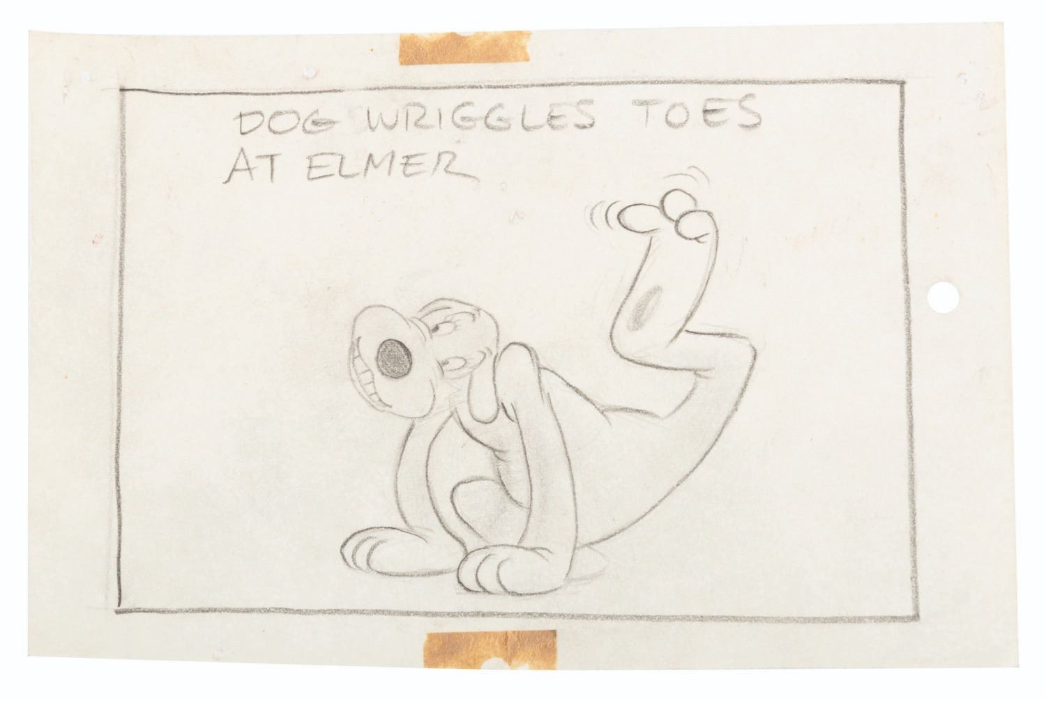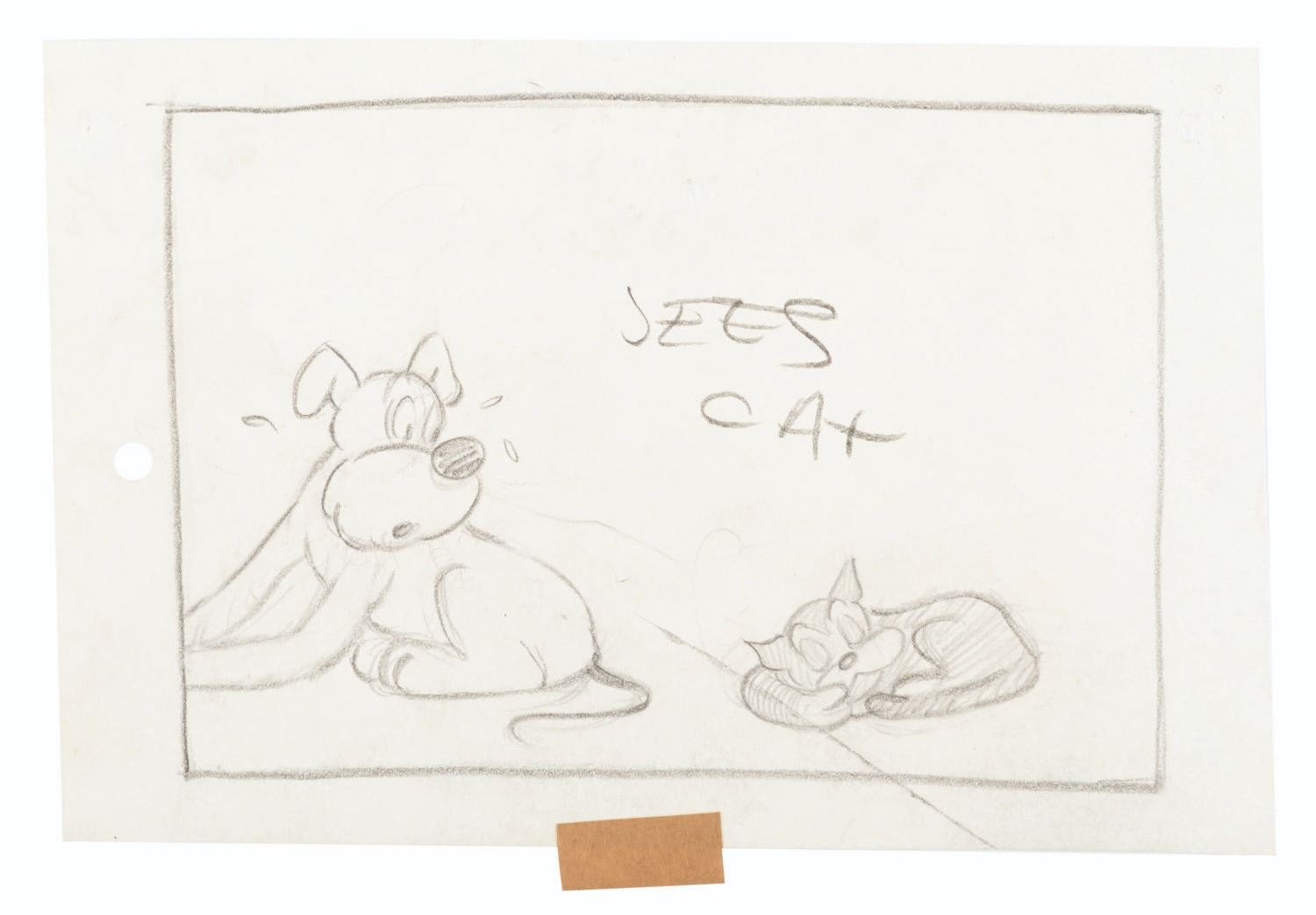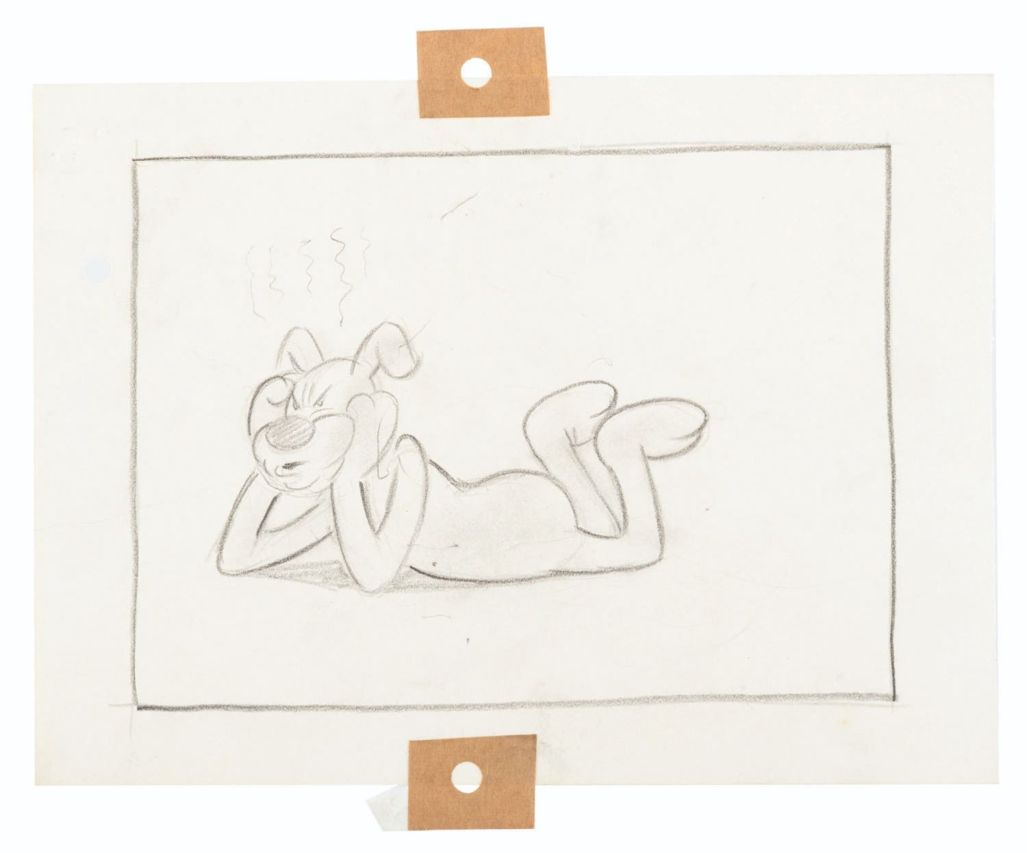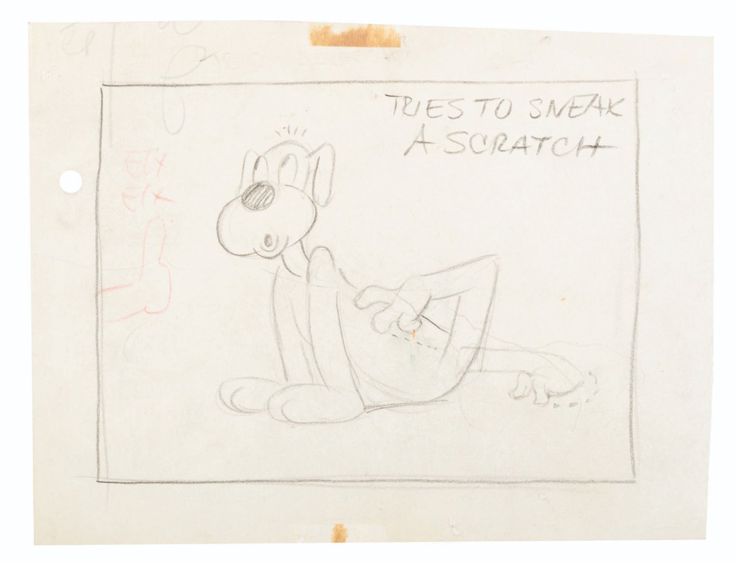 (Schlesinger, 1943) A collection of 12 storyboard panels from the Merrie Melodies short “An Itch in Time,” directed by Bob Clampett. Accomplished in graphite and colored pencil and ranging in size from 5” x 7.5” to 6” x 7.75”, the panels are in good condition with edge wear, pinholes and light corner tears from production use, and light discoloration from age.