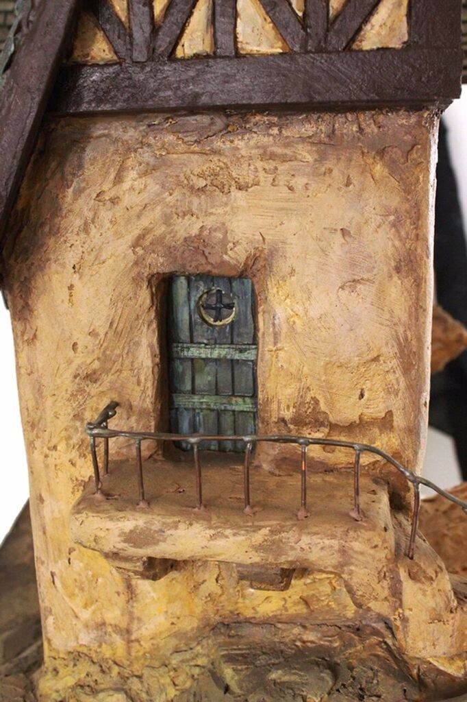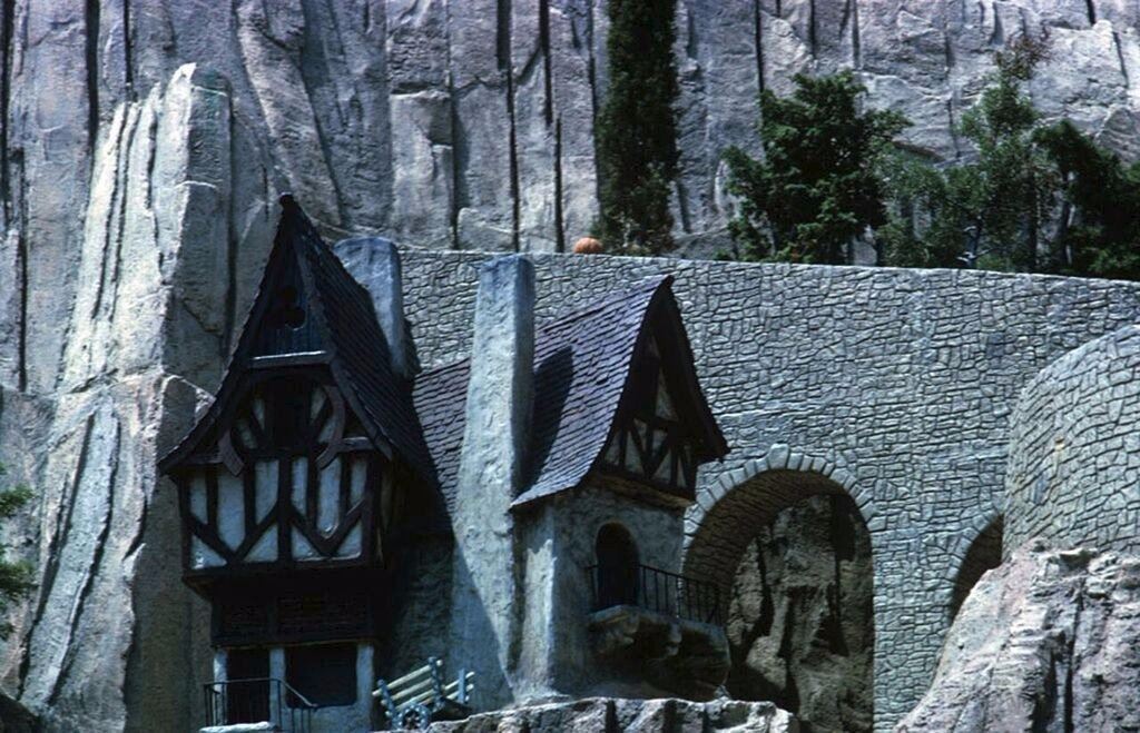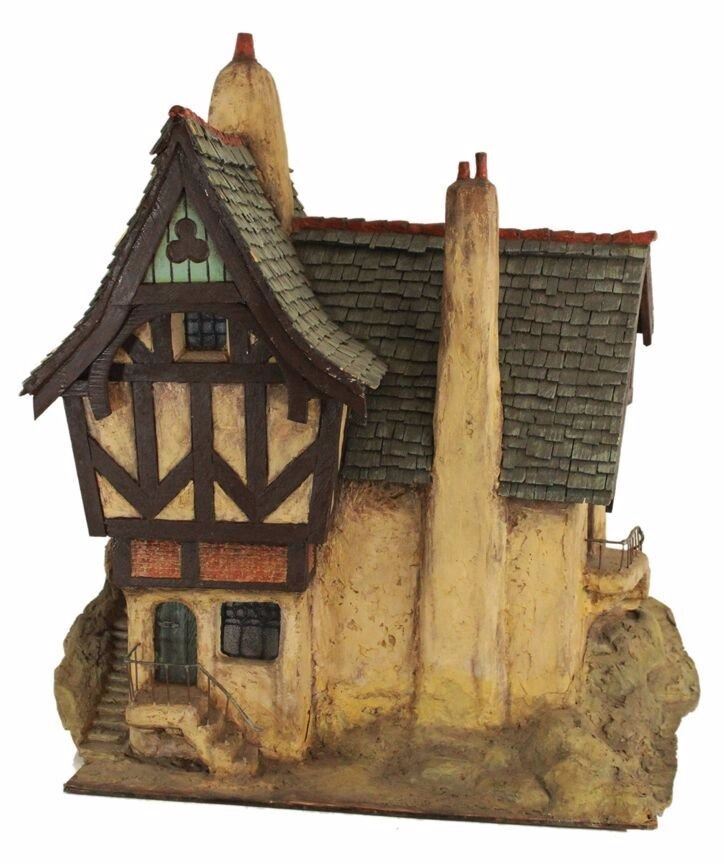 (Disneyland, 1960s) A rare prop house from one of the oldest attractions in the park, the "Storybook Land Canal Boats". Originally titled "Canal Boats of the World", the attraction was designed as a journey past miniature landmarks of the world. Reconfigured shortly after opening, and renamed "Storybook Land", the attraction featured miniature recreations from Walt Disney's most popular films as well as the Fantasyland landmark, "Monstro the Whale". This particular hand-painted wood, fiberglass, and plaster house was part of Cinderella's Village. It can be seen halfway up the mountain leading to Cinderella's Castle. Removed from the ride in the 1970s, and replaced by a duplicate, this house was initially retained by Imagineer Fred Joerger. This item measures 24"x28" and 38" tall. The house has incredible detail including individually cut wood shingles, and inlaid leaded glass windows, and is in overall very good condition.
