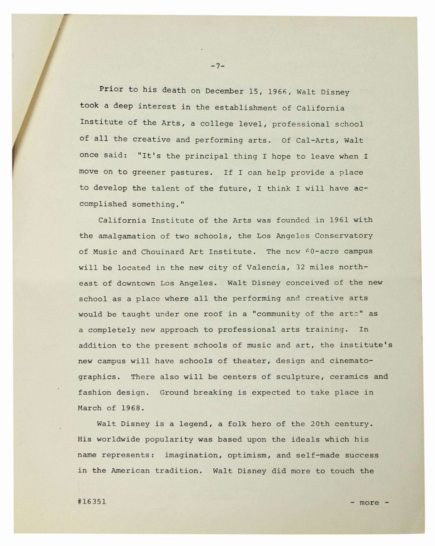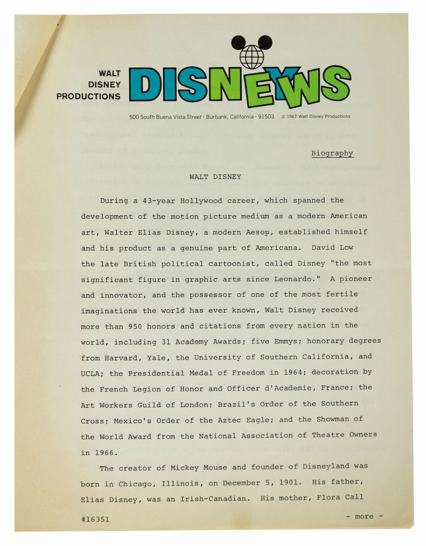 (Disneyland, 1967) A very rare studio biography on Walt Disney, created shortly after his death in December of 1966. The biography contains a cover letter by studio executive James Stewart, as well as a list of the Academy Awards earned, and feature films worked on by the studio during Walt's time. The 12-page document measures 11"x8.5" and is in good condition overall with yellowing to the edges.