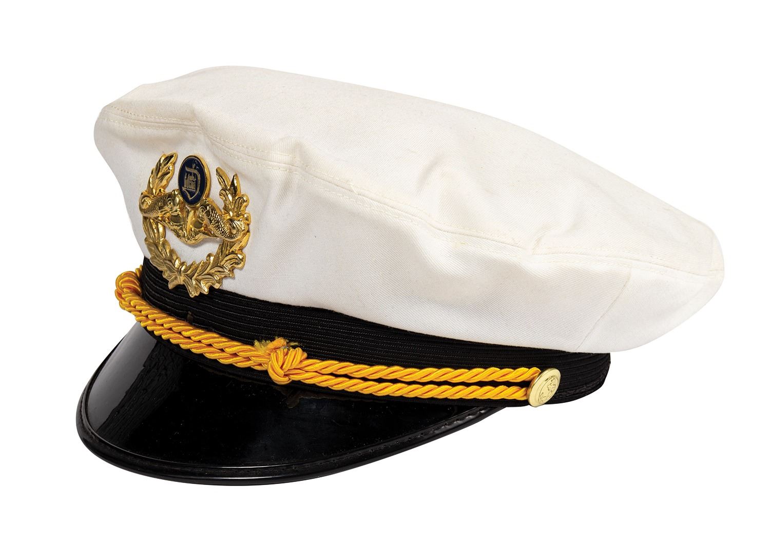 (Disneyland, c.1960s) A cast member hat from the original iteration of Disneyland's Submarine Voyage. This scarcely seen hat features the metal hat badge with the Disneyland "D" emblem, and is marked as a size 6 7/8. The condition is very good with minimal wear.