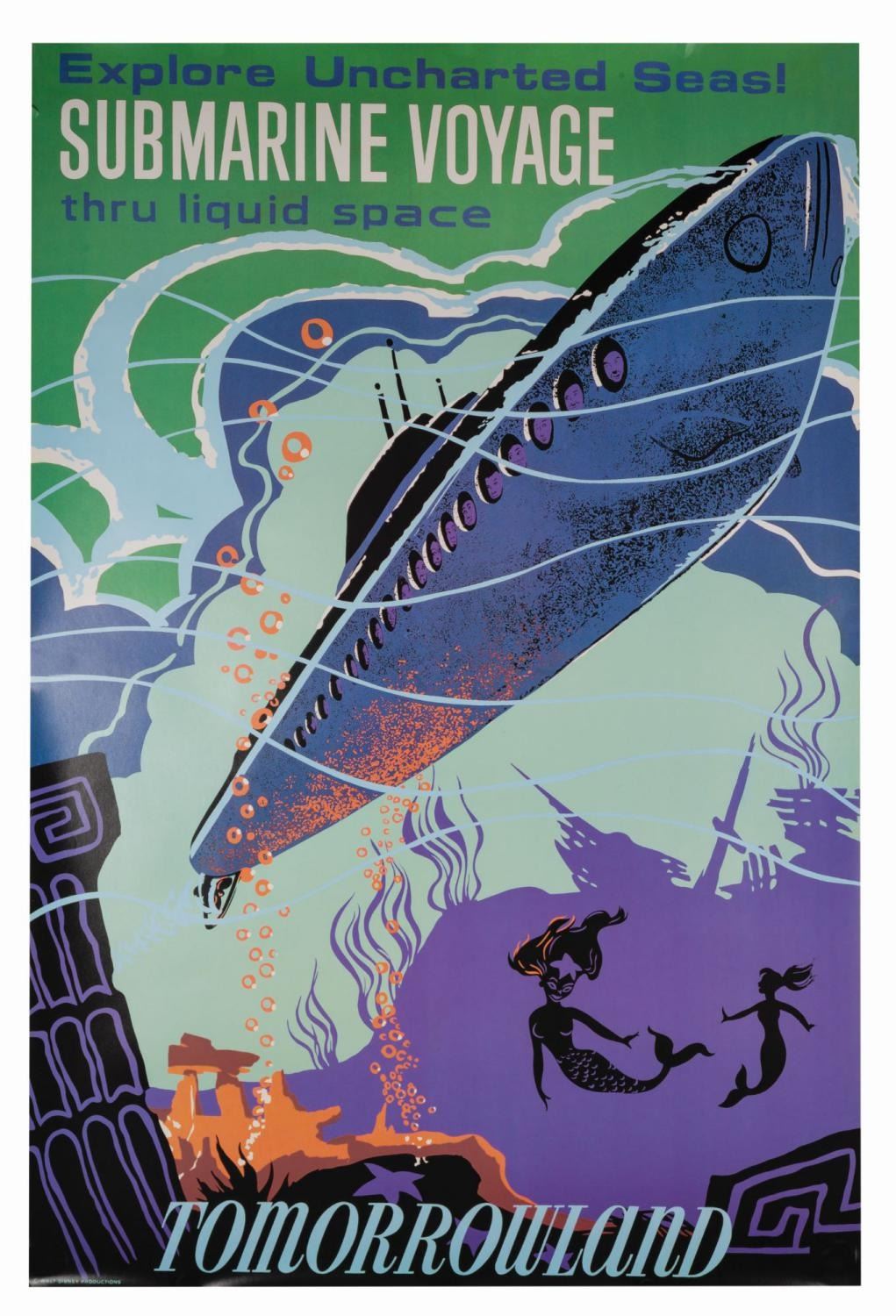(Disneyland, 1990s) A full-size attraction poster reproduction from the Disney Gallery for the Submarine Voyage. For a short time, the Disney Gallery offered a limited amount of full-size reproduction attraction posters for many of the well-known Disneyland attractions. This faithful replica measures 54"x36" and is in very good condition with minor wear, including a small tear on the upper left edge.
