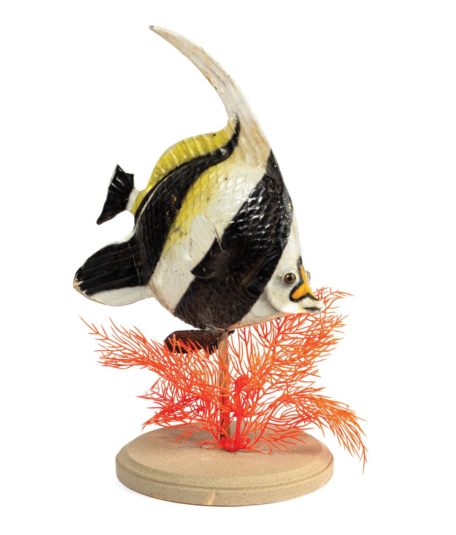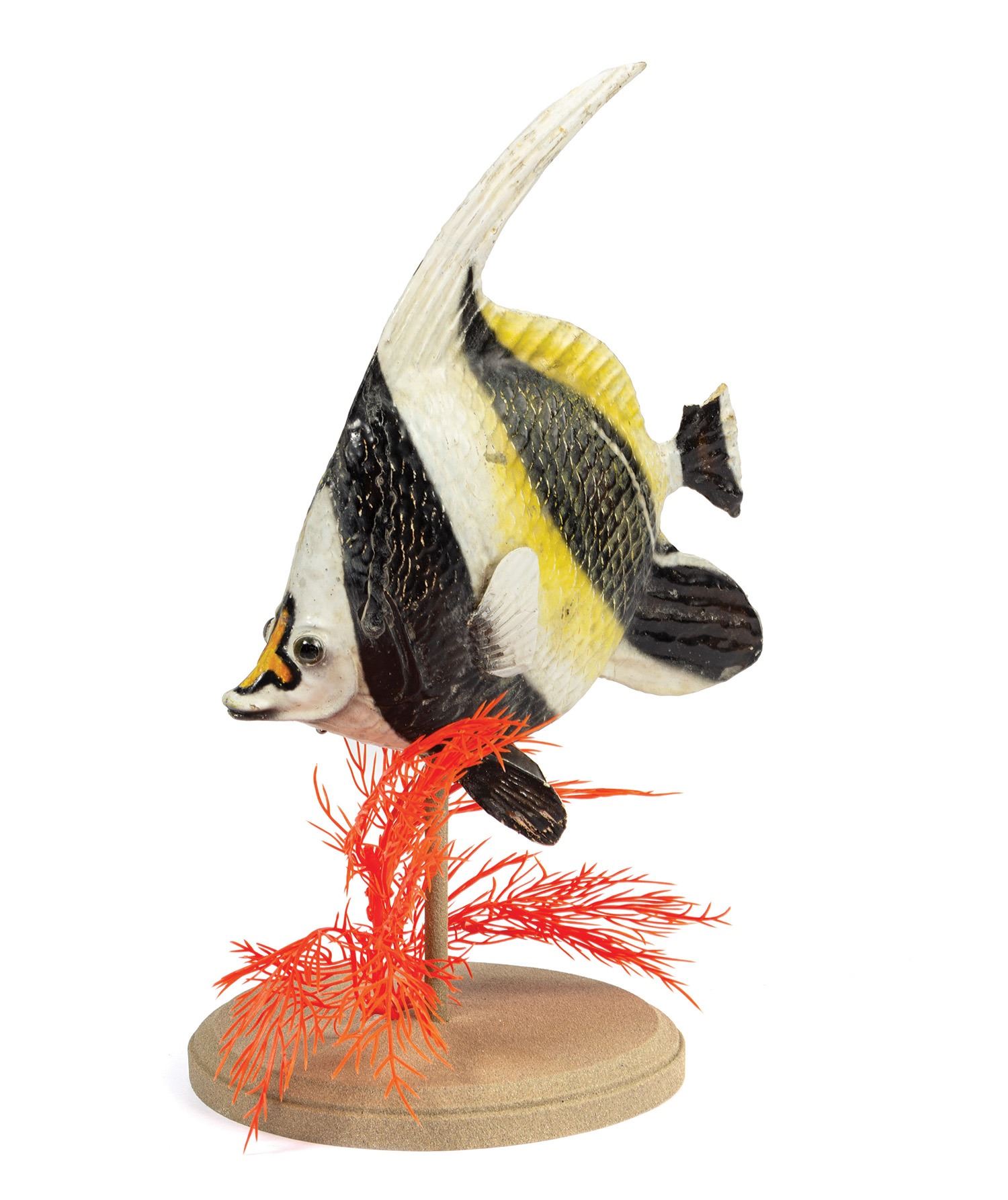 (Disneyland, c.1960s-90s) An original angel fish prop used in the Submarine Voyage attraction at Disneyland. The fish has been placed over a custom base with an unused section of prop seaweed from the attraction. The fish measures approximately 10"x10" and measures approximately 14" tall on its base. The condition is fair with wear throughout from use, including a chip to the rear fin, a replaced left eye, and cracks to the bottom fins.