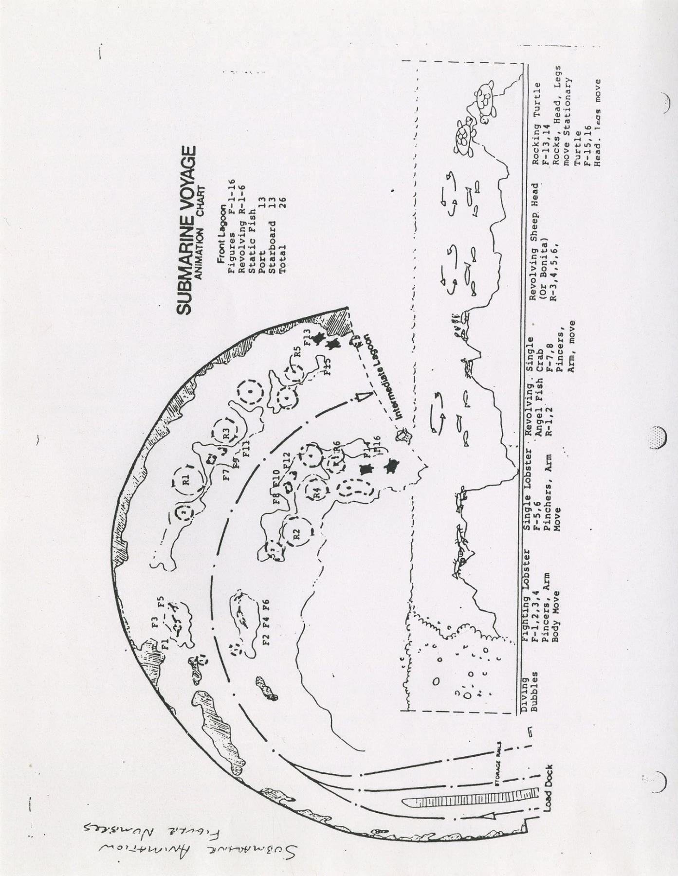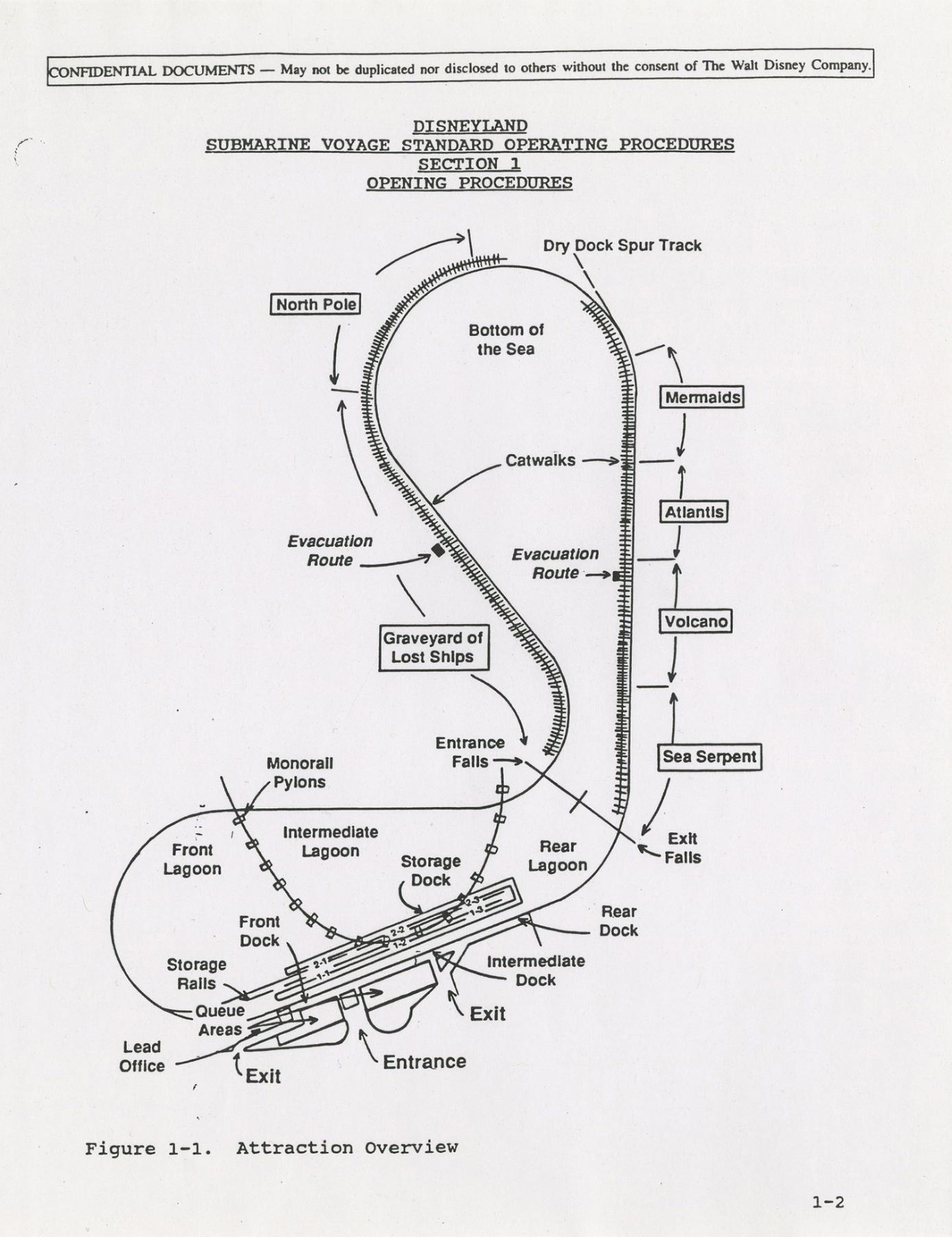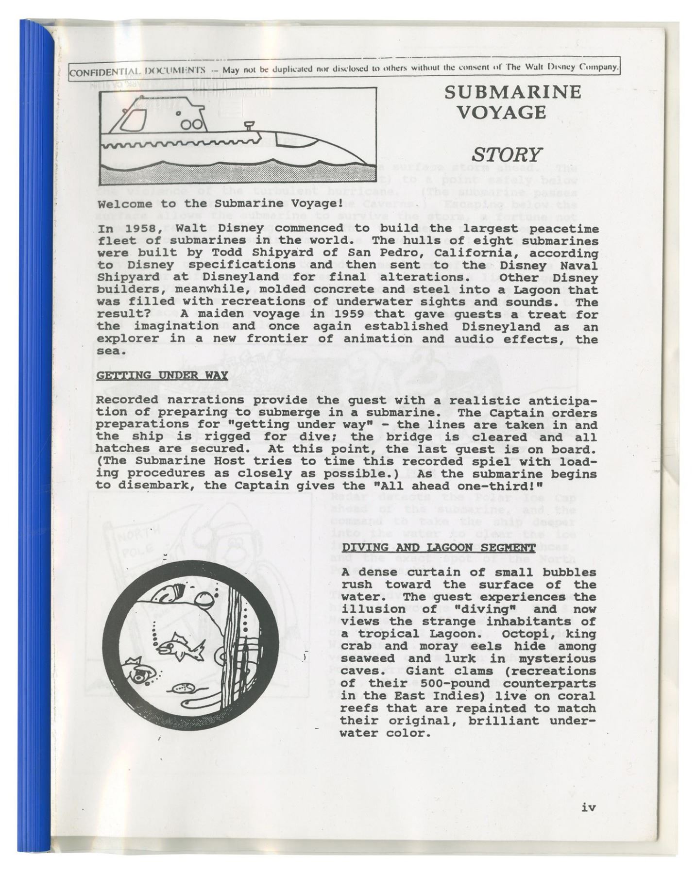 (Disneyland, c.1990s) A manual for the Submarine Voyage attraction which was intended for internal use only. The manual details the story and history of the attraction as well as fact and figures and a map of the attraction. Much of the manual is focused upon the animatronics within the attraction and includes diagrams, prop locations and names, and a checklist of animatronic functions. Measuring 11.25"x9" in its protective cover, the 22-page manual is in very good condition with some edge-wear to the pages. The cover is creased in several places on the back, and the plastic binder clip is chipped at the top. The manual may be missing several pages.