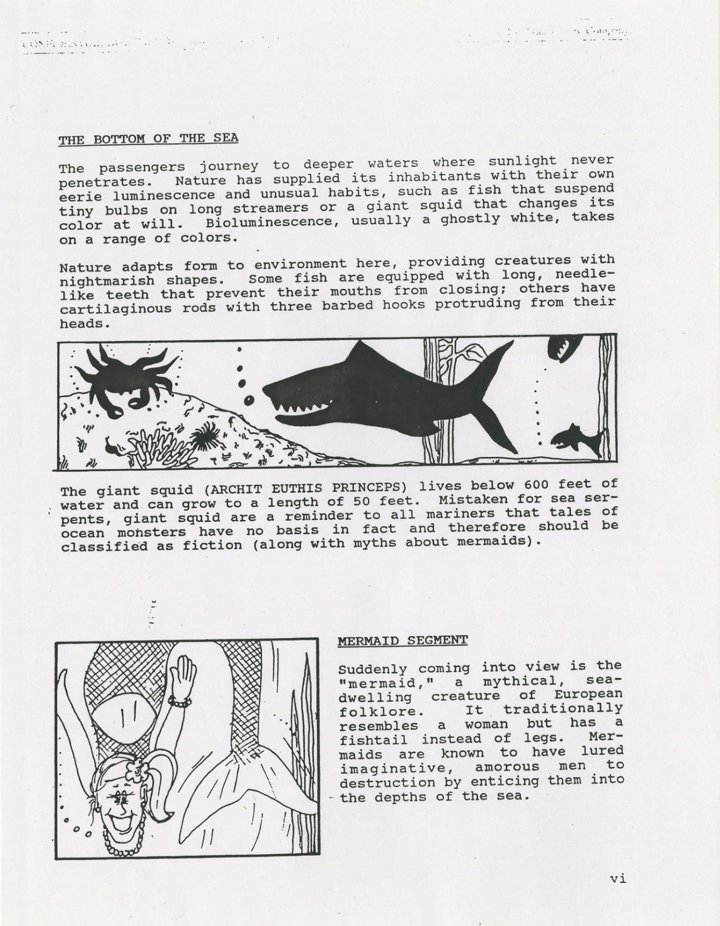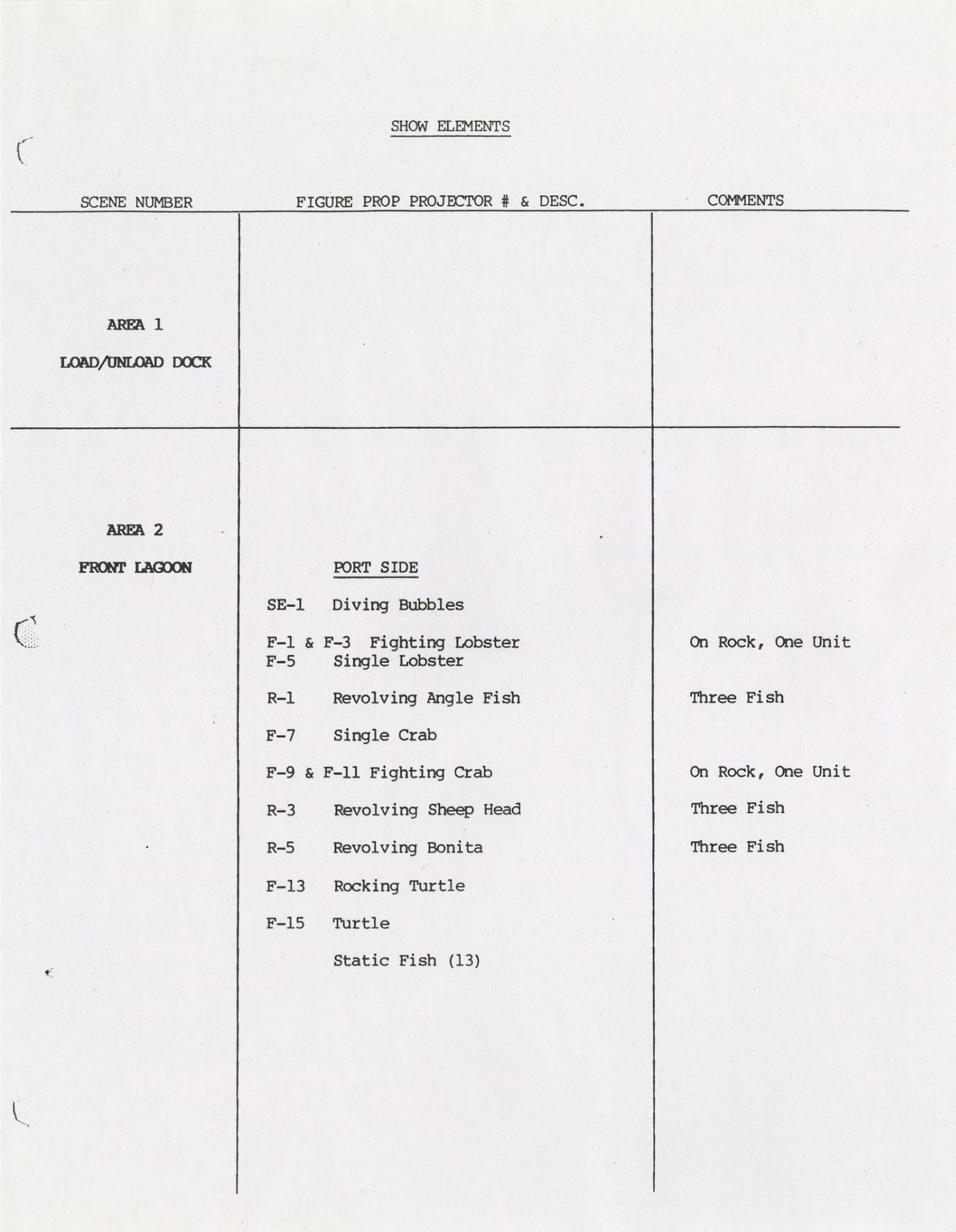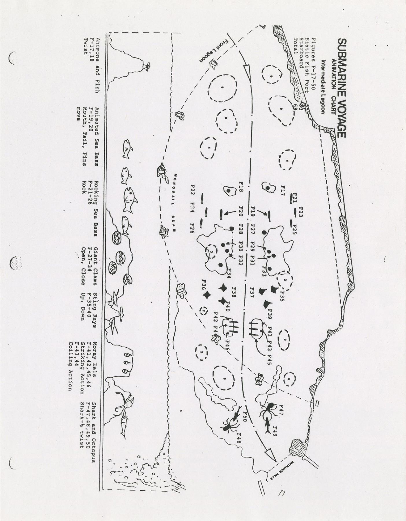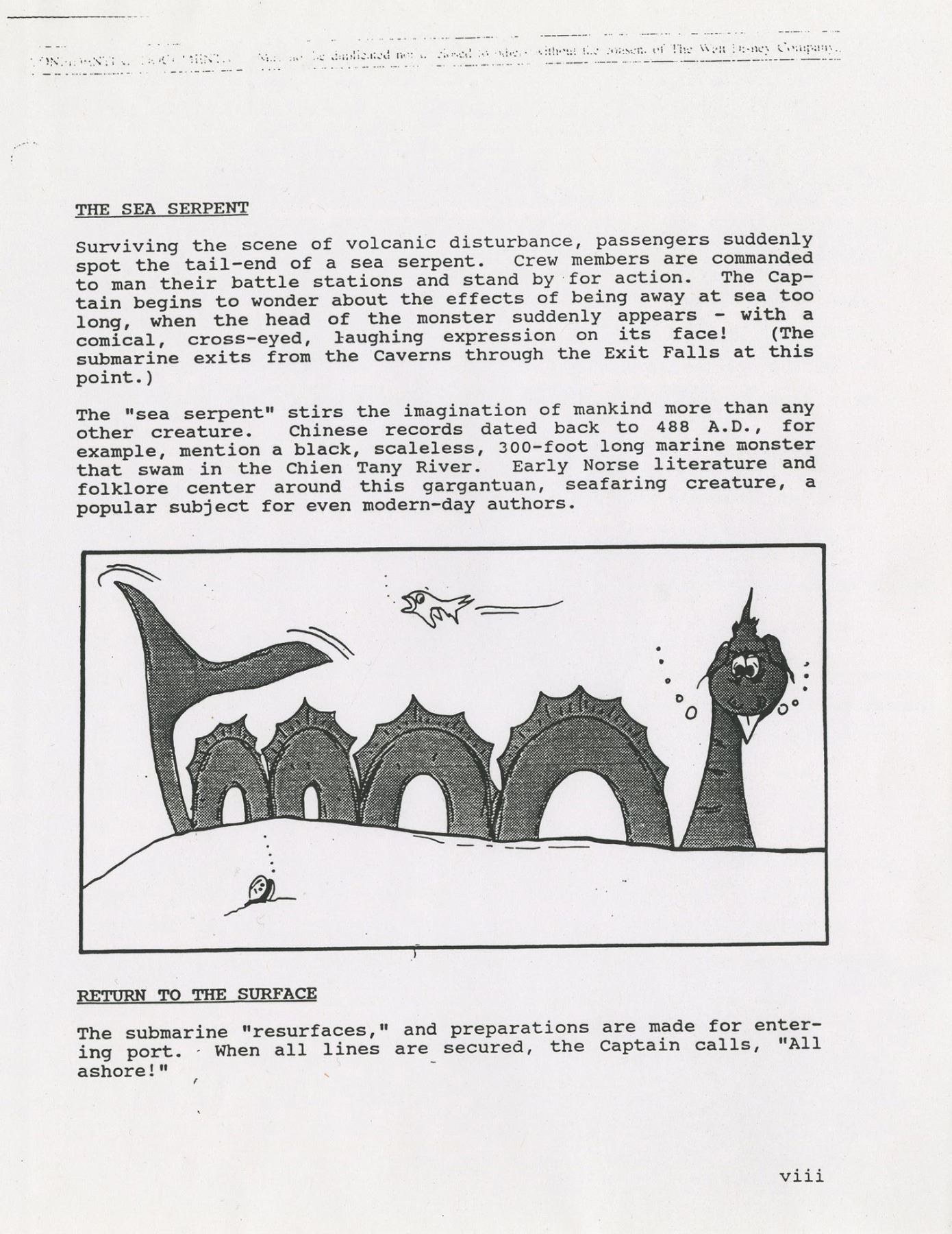 (Disneyland, c.1990s) A manual for the Submarine Voyage attraction which was intended for internal use only. The manual details the story and history of the attraction as well as fact and figures and a map of the attraction. Much of the manual is focused upon the animatronics within the attraction and includes diagrams, prop locations and names, and a checklist of animatronic functions. Measuring 11.25"x9" in its protective cover, the 22-page manual is in very good condition with some edge-wear to the pages. The cover is creased in several places on the back, and the plastic binder clip is chipped at the top. The manual may be missing several pages.