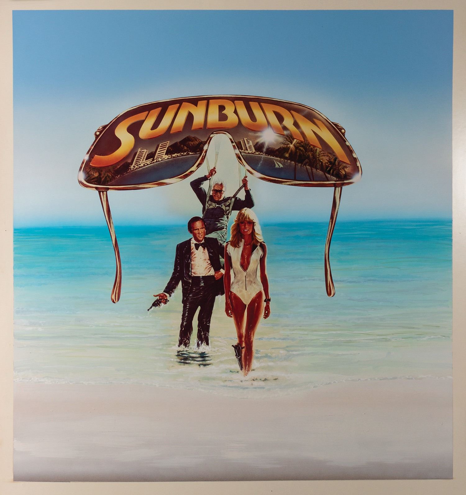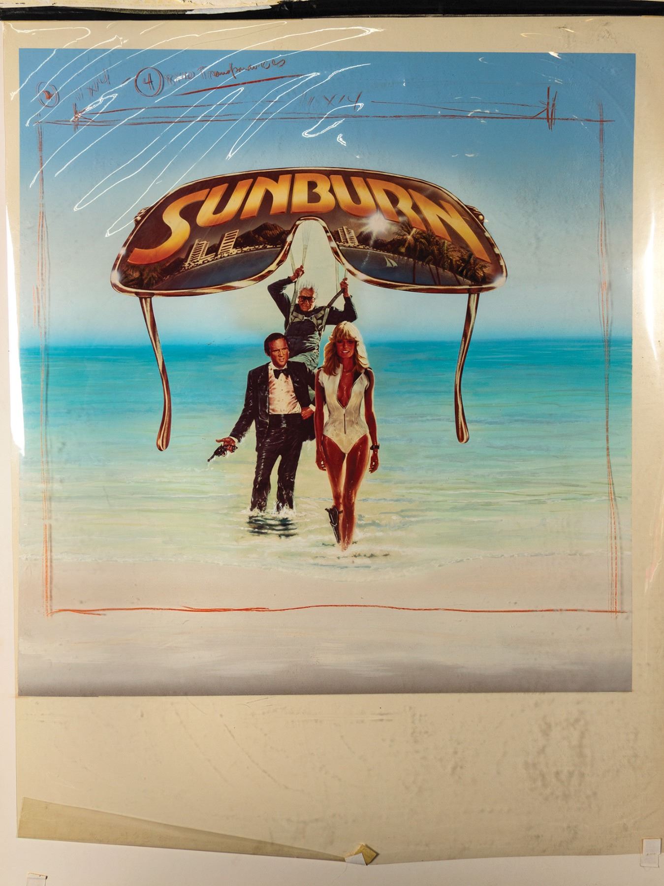 (Fawcett-Majors, 1979) Original poster development artwork for the comedy film Sunburn, starring Farrah Fawcett and Charles Grodin. The artwork was created by using printed imagery of the characters and film title, with airbrushed enhancements and an entirely painted background. The artwork has an image size of 28"x26.5" on its 39.5"x29.75" art board backing. The artwork itself is in very good condition with some edge-wear to the board. There is a clear protective sheet hinged over the artwork that contains several hand-written development notes. The board itself is mounted to foamcore, and the foamcore has some wear throughout, as well as some tape-residue to the top-edge.