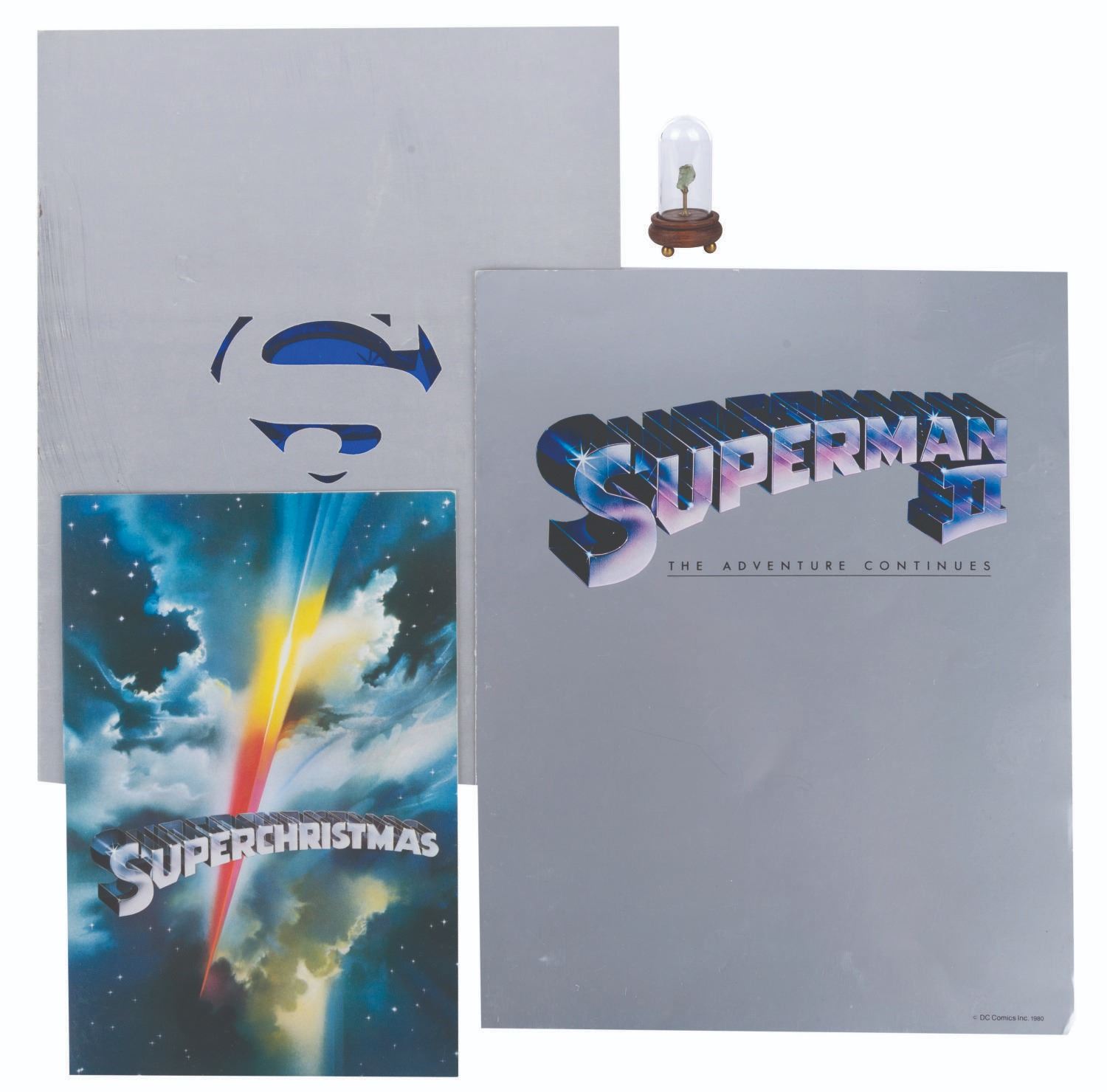 (Warner Bros., 1978-1982) A cast gift card from Superman: The Movie, along with a prototype for a proposed cast gift, and (2) programs for Superman and Superman II. The cast gift"SuperChristmas" card is very rare, given only to cast and crew on the film. The proposed gift prototype is one-of-a-kind: a miniature display base with dome, holding a fragment of faintly green mineral, representing kryptonite. The Superman and Superman II programs each measuring 8.5"x11" are in good condition, with wear from handling including scuffs. The 5.75"x8.5" card is in very good condition with light wear, and the 1.5" diameter by 3.25" high kryptonite gift prototype is in fine condition.