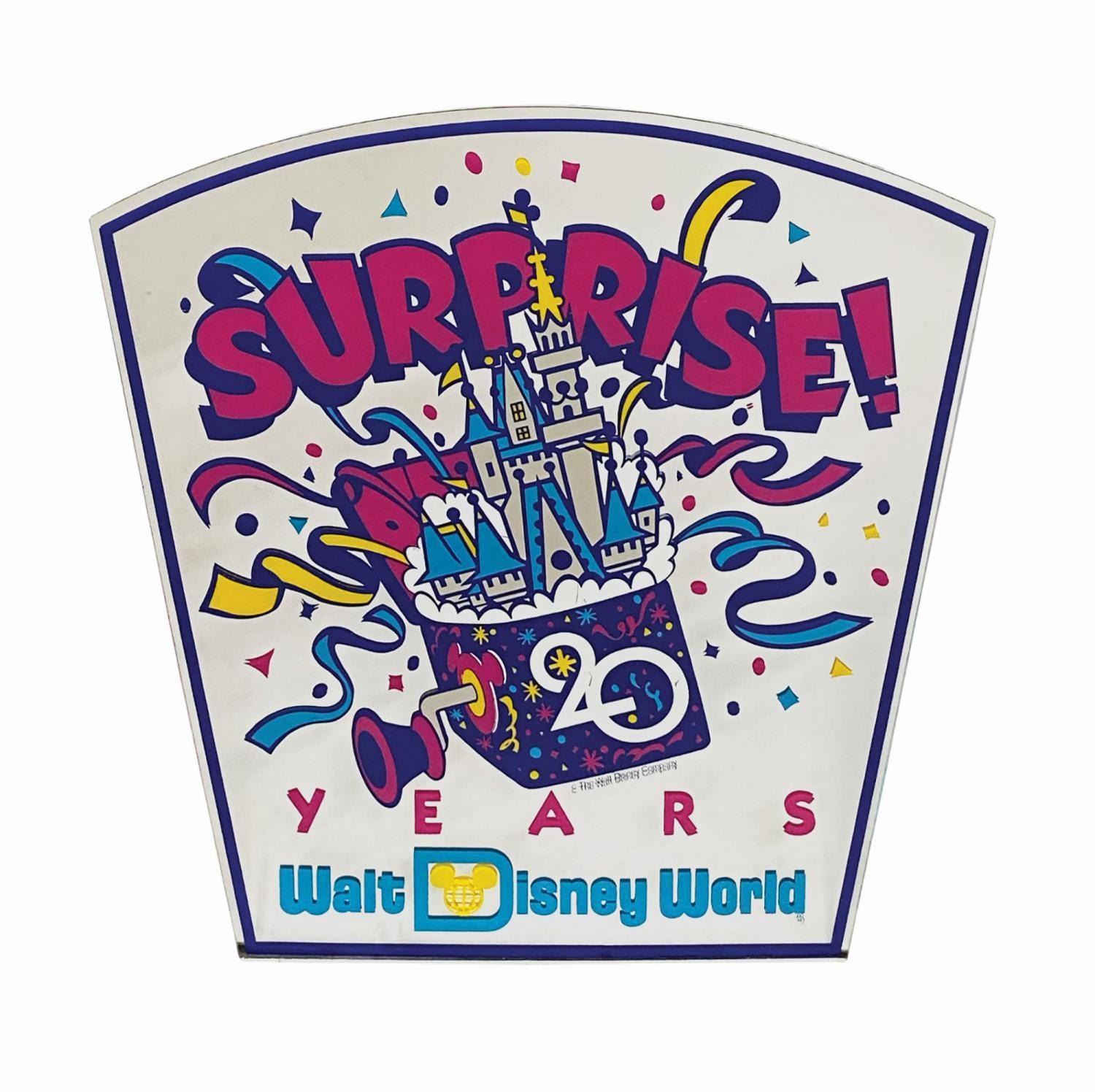 (Walt Disney World, 1991) A lamppost sign created in celebration of Walt Disney World's 20th anniversary. Constructed of mirror-backed acrylic, the die-cut sign features screen printed design elements and the lettering, "Surprise! 20 Years." Measuring 22"x21.25", the sign is in very good condition with some scratching and scuffing throughout from use. There is a hanger mounted to the back for display.