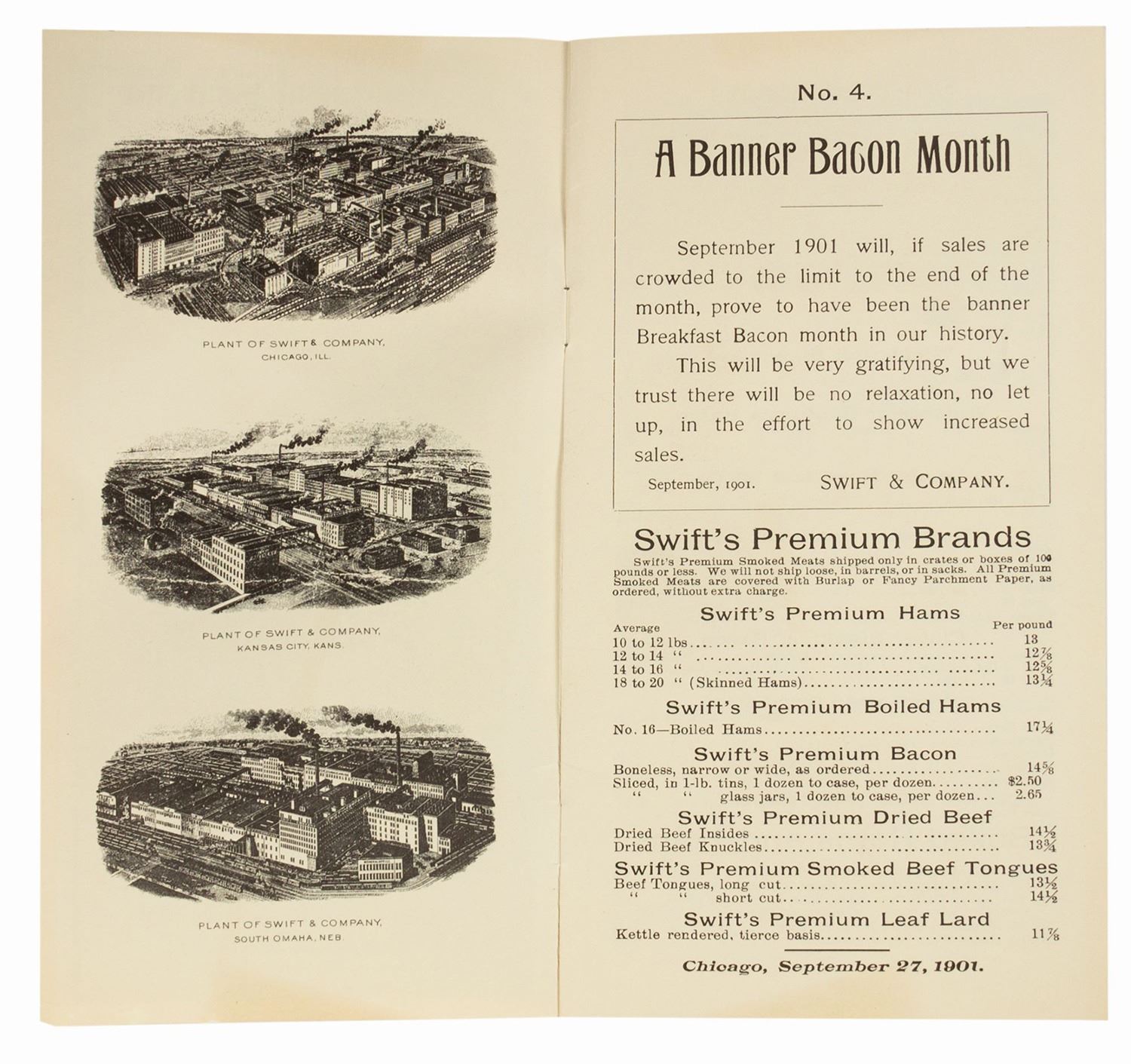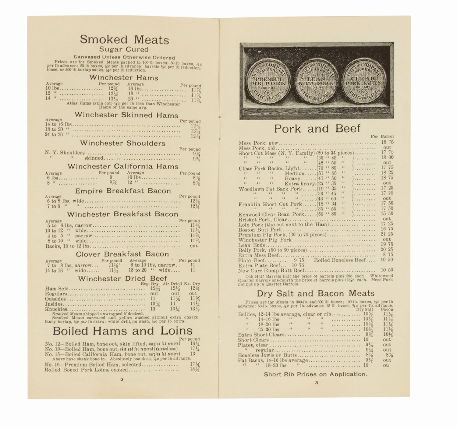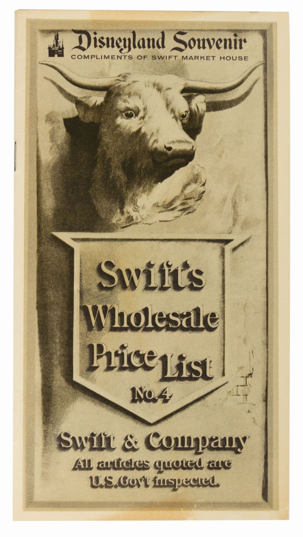 (Disneyland, c.1955) A very rare early complimentary souvenir from the Market House on Main Street. Sponsored by Swift's Premium Meats, this souvenir is a replica of Swift's Wholesale Price List from September of 1901. Throughout, guests could find such delights as Winchester Breakfast Bacon and Fancy Summer Sausage, and such unusual offerings as Swift's Beef Fluid, Lamb Tongues in Glass Jars, and Ox Lips. The 13-page souvenir pamphlet measures 8.25"x4.25" and is in good condition with yellowing to the top and bottom edges of the cover.