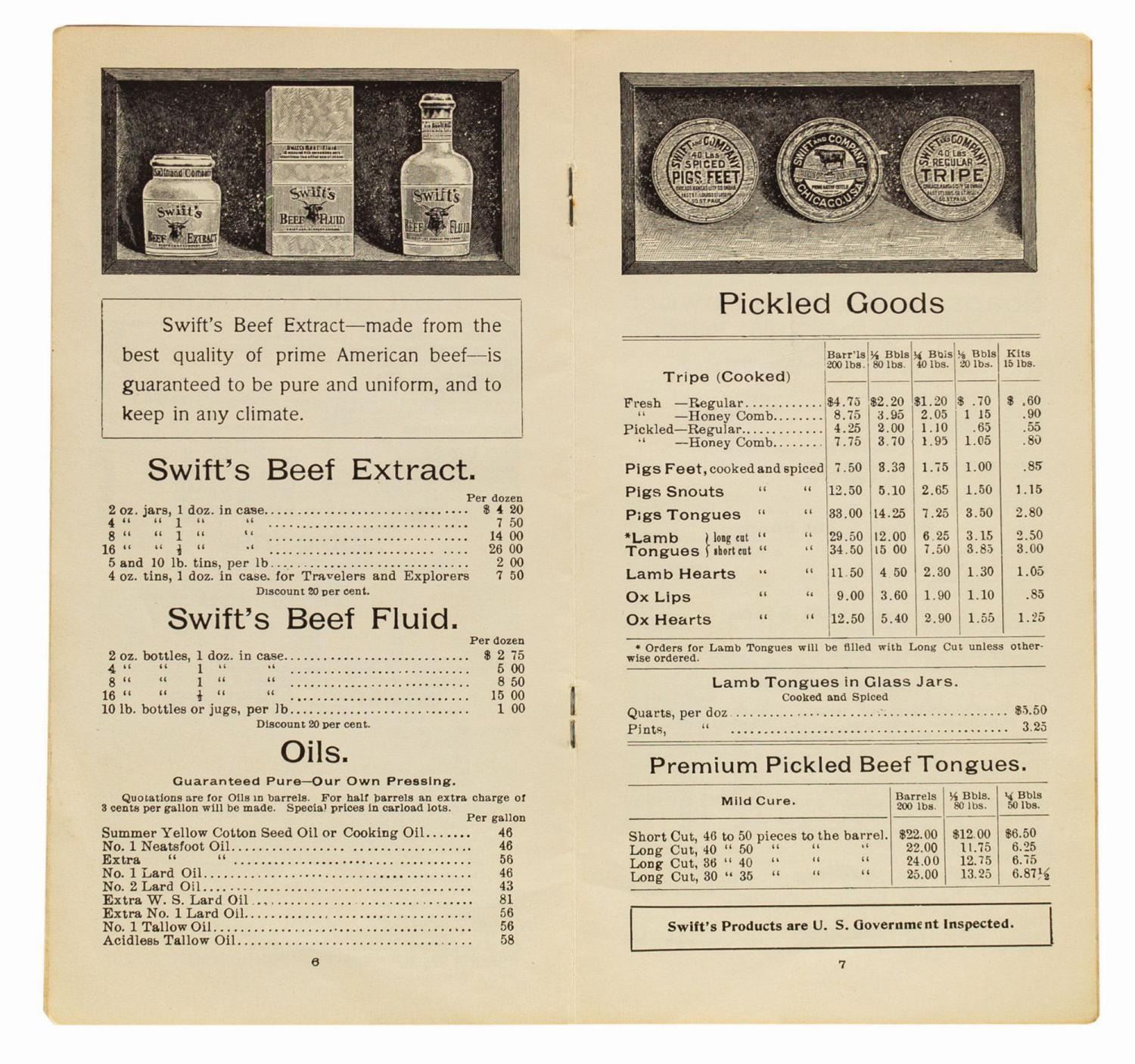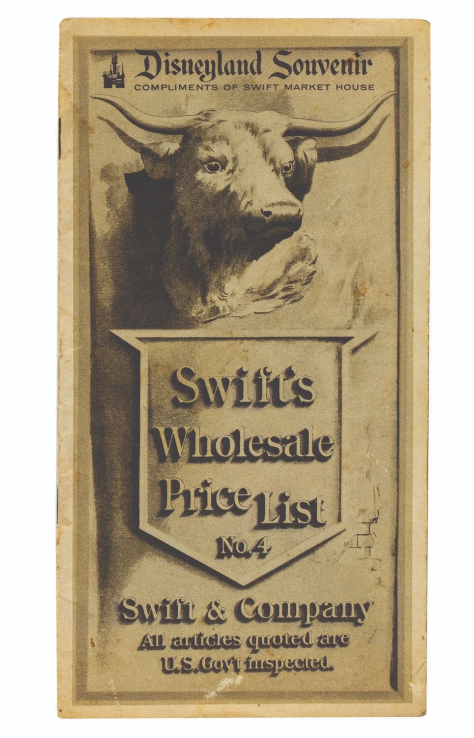 (Disneyland, 1950s) A vintage Swift's Wholesale Price List No.4 souvenir booklet from Swift's Market House in Disneyland's Main Street U.S.A. A replica of Swift's actual wholesale catalog from 1901, 12-page booklet features such period delicacies as premium leaf lard, scalded fowls, and beef fluid. Measuring 8.25"x4.5", the booklet is in good condition with some faint soiling, spot surface loss to covers, and edge and corner wear.