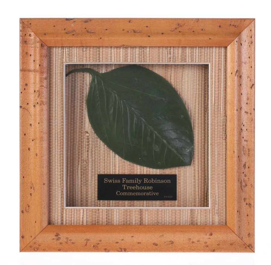 (Disneyland, 1960s) Original leaf prop from the "Swiss Family Treehouse" attraction. The prop was removed from the tree during one of the renovations, and sold through the Disneyana shop in the park. The leaf measures approximately 4"x4.75" and has been beautifully framed. Overall frame size is 8.75"x8.75". In very fine condition.