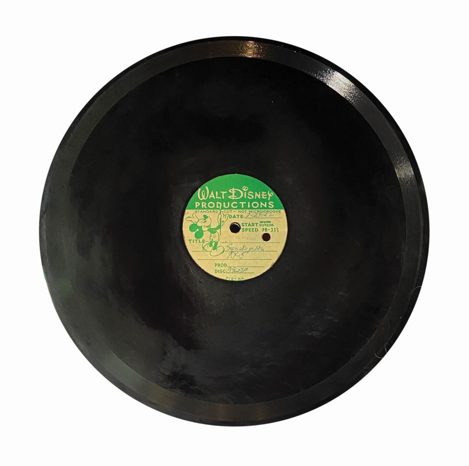 (Disneyland, 1962) An original acetate master recording of the Swisskapolka for the Swiss Family Robinson Treehouse at Disneyland. The lacquer-over-aluminum record retains a WDP center label blank hand-dated "3-22-62" and hand-titled "Swisskapolka R4-5." Originally appearing in the Disney film, the Swisskapolka was written by Buddy Baker. In the attraction, the song emanated from speakers inside the pipe organ in the treehouse's living room. Measuring 11.75" in diameter, the record is in good condition with some patina, cracks, and chipping to the lacquer on the reverse. This is an opportunity to own a one-of-a-kind master recording of one of the most enduring songs in Disney parks history.
