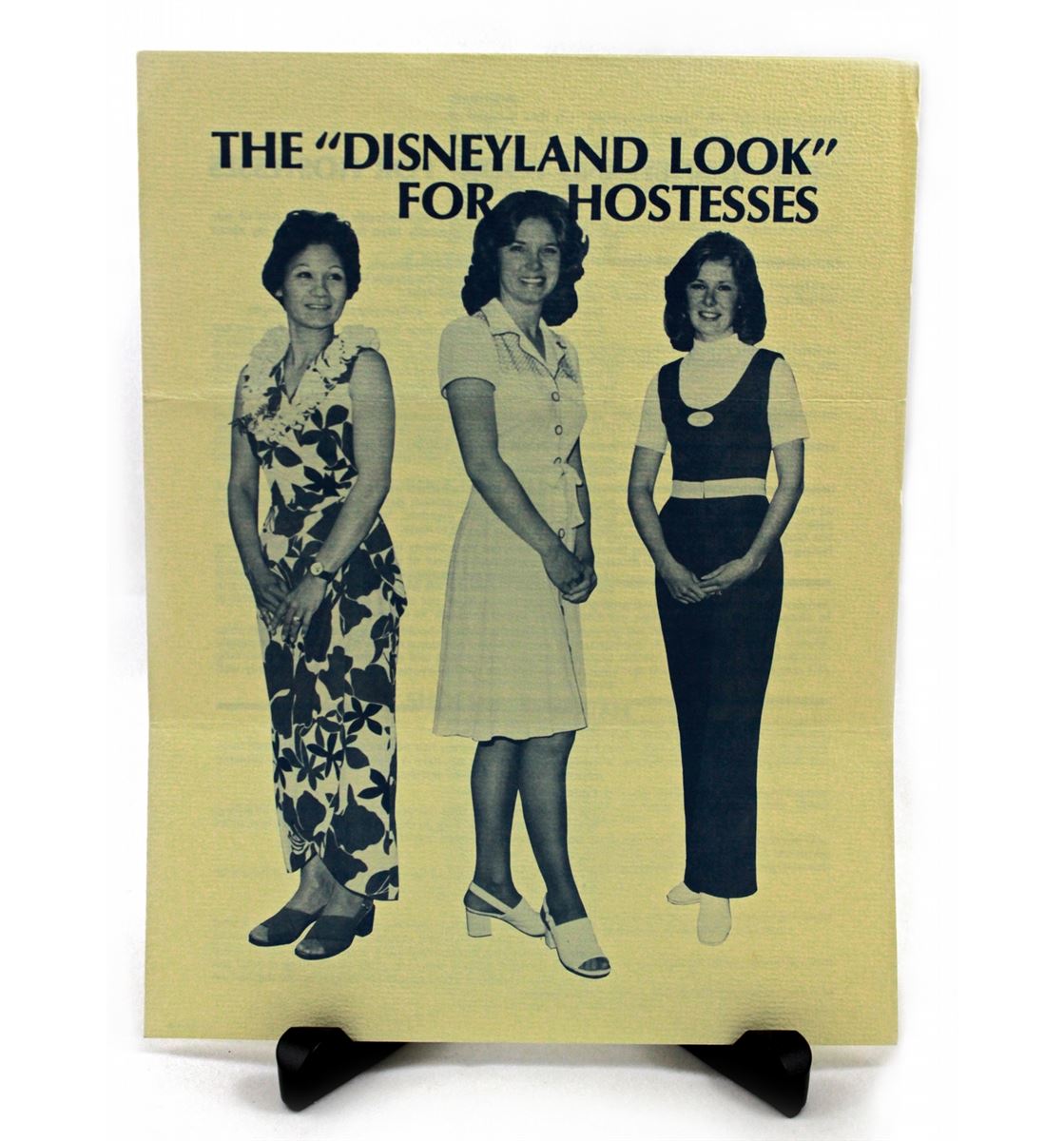 A S.O.P. (Standard Operating Procedures) for the female cast members working the On Stage areas of the park. The guide informs them on the policies on dress and grooming while working the park's various venues. The pamphlet opens to contain the descriptions for proper attire. At one point, the pamphlet had been folded horizontally intro a tri-fold at some point, so two feint horizontal fold-lines still remain. The piece is in fine condition, with minimal edge wear and two very tiny specs on the reverse.