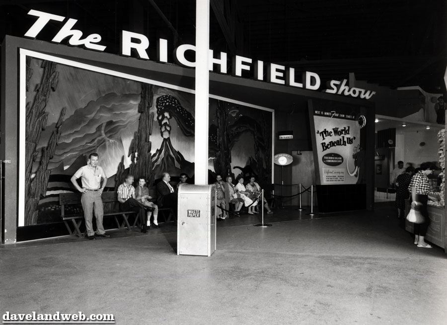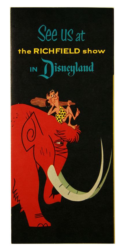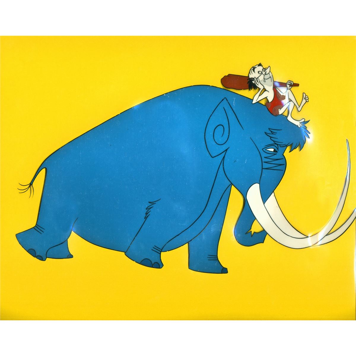 (Disneyland, 1955) Original production cel featuring a caveman and Mastodon from Richfield’s The World Beneath Us attraction. Originally sold at the Art Corner in Tomorrowland, the artwork measures 7.5 x 8.5 in. unframed and 12 x 19.5 in. in its’ current frame. Artwork comes with an exhibit pamphlet from the attraction. In very good condition. Unexamined out of frame.