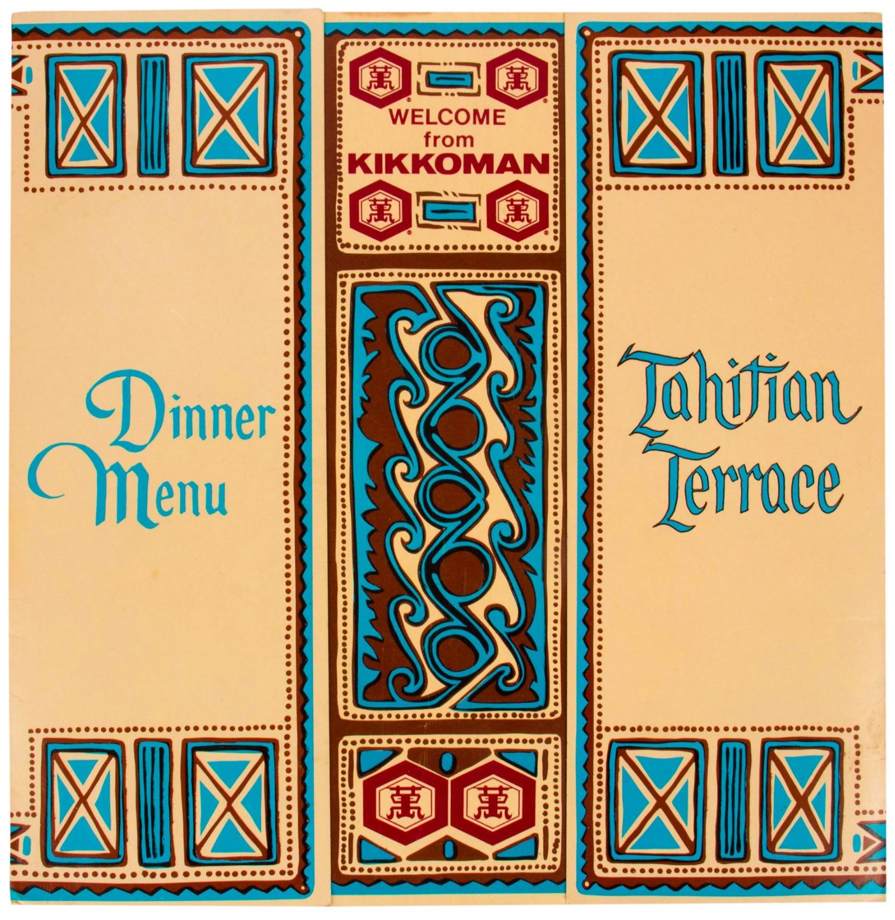 (Disneyland, 1980s) A rare Dinner menu from the Tahitian Terrace at Disneyland. During the 1980s, Kikkoman Soy Sauce sponsored the restaurant and revised the menu to this Polynesian style pattern. The menu measures 10.25"x10" and is in very good condition with some spine wear from use.