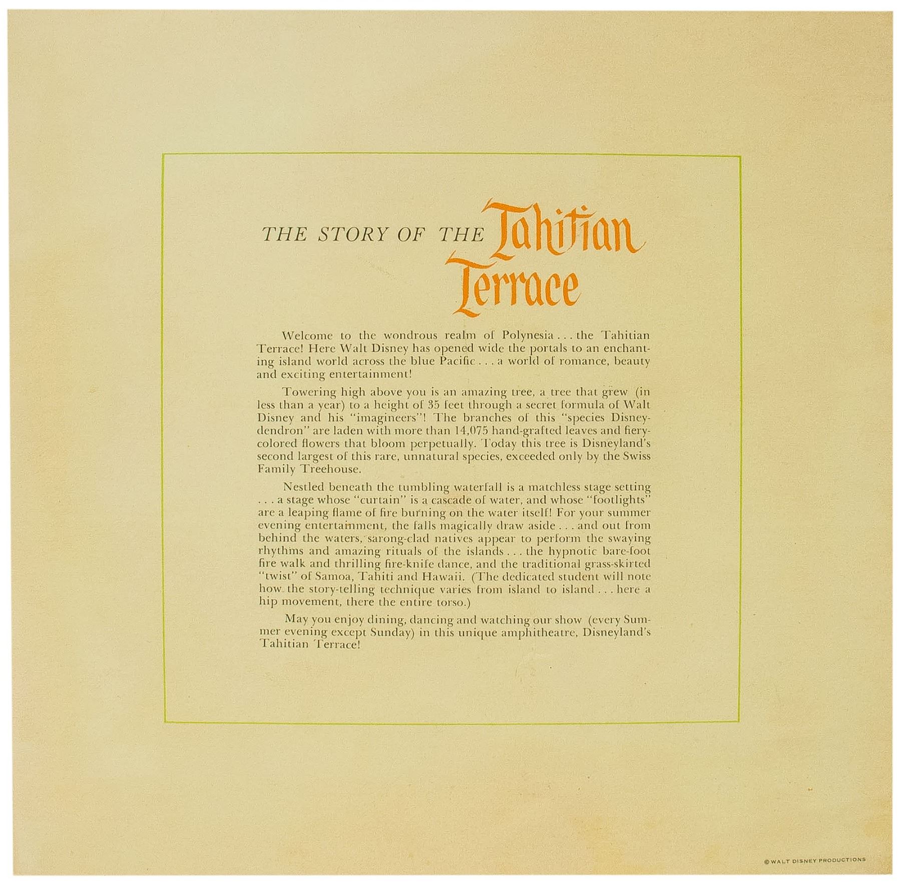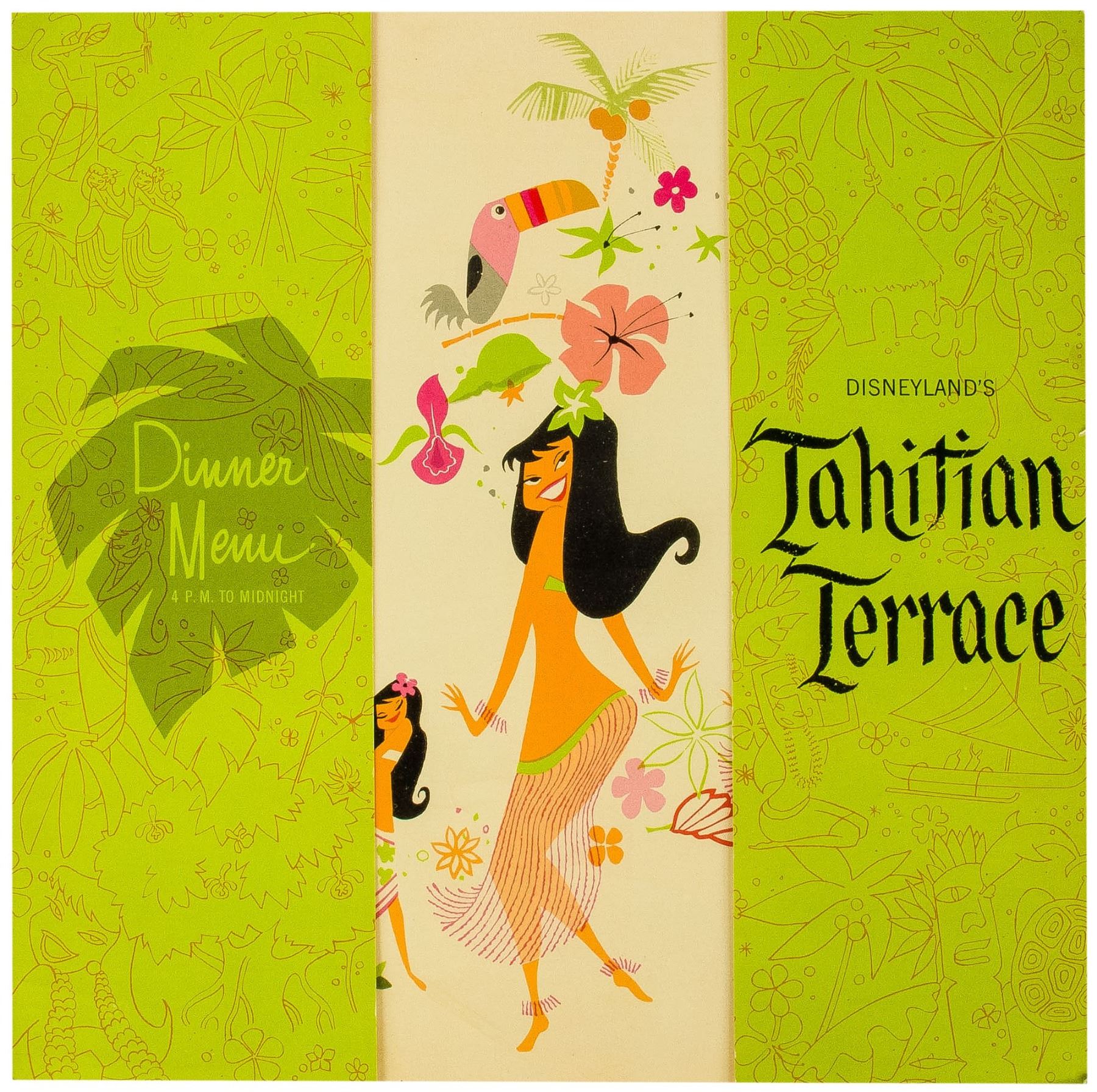 (Disneyland, 1960s) A tri-fold luncheon menu from the Tahitian Terrace at Disneyland. The menu features Polynesian imagery and measures 10”x10”. The condition is very good with minor wear from use.