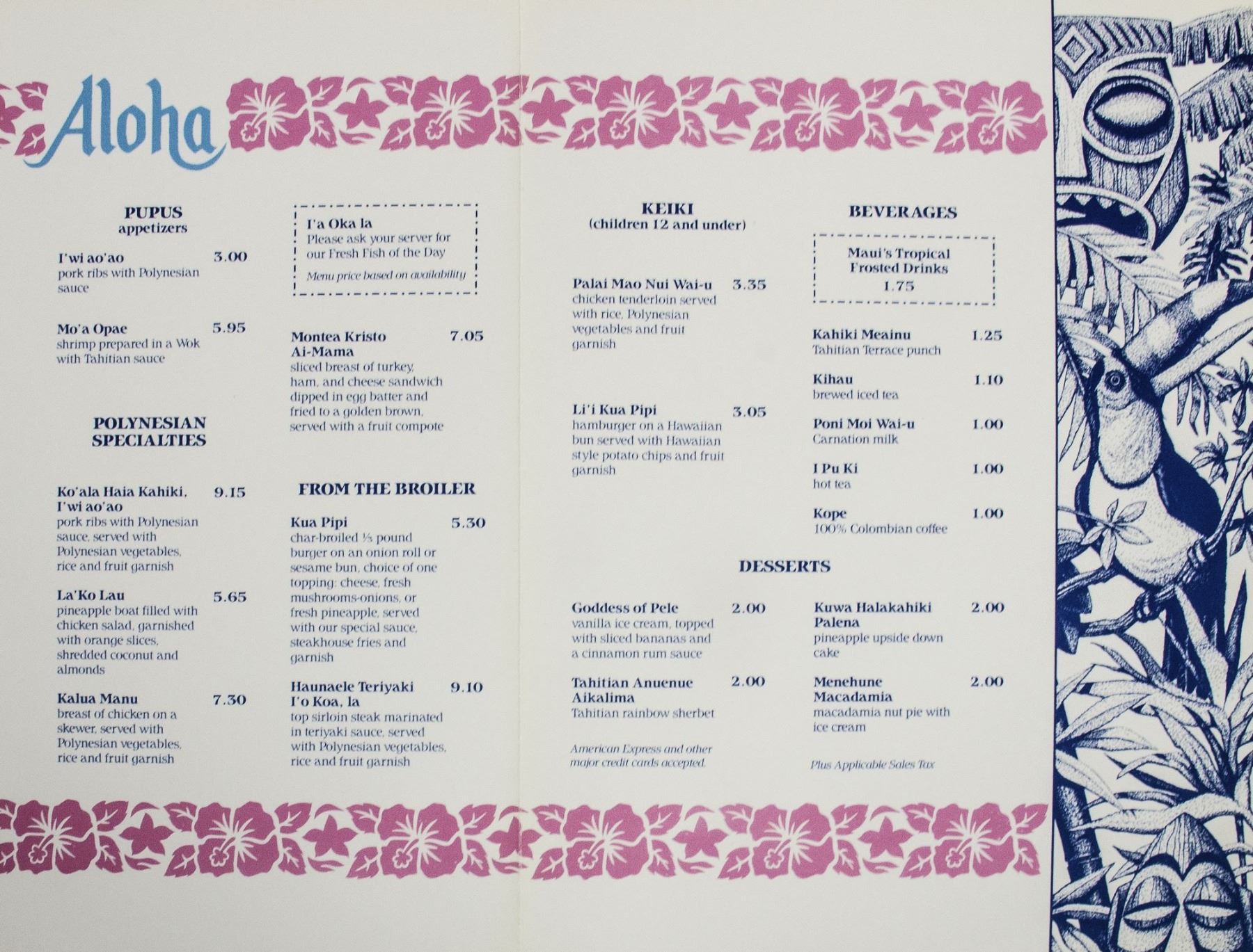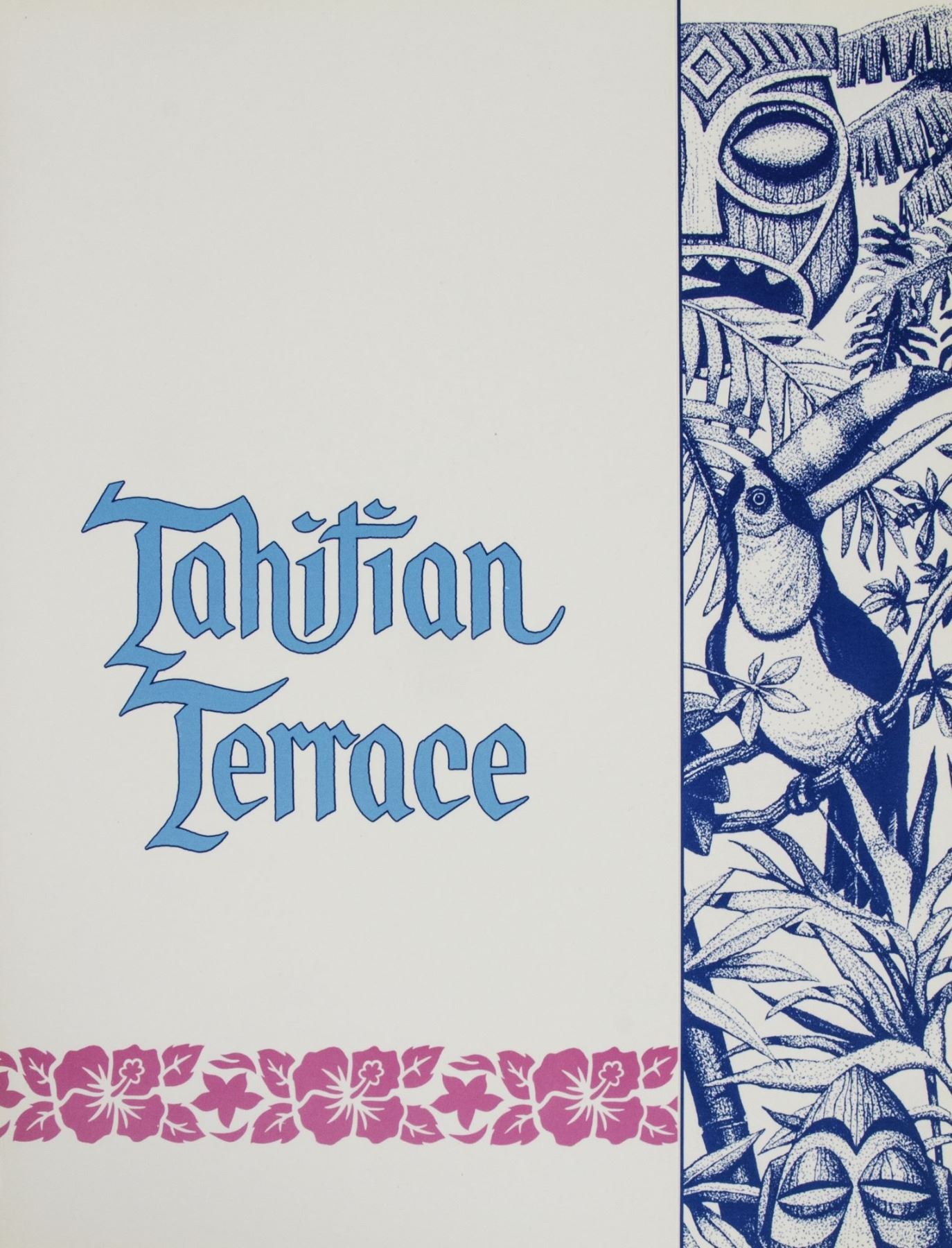(Disneyland, 1986) A stylish menu from the Tahitian Terrace restaurant at Disneyland. The menu features Polynesian-inspired imagery throughout in a beautiful pink and blue color scheme. This item folds out to measure 11"x14.5" and is in very good condition with minor edge-wear from use.