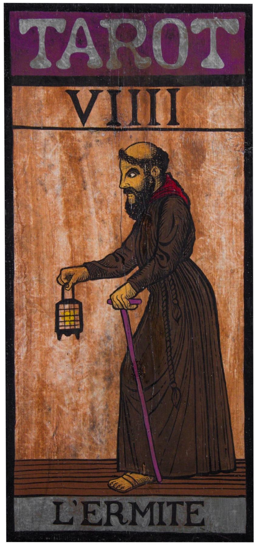 (1996) An original hand-painted sign by Rolly Crump that was displayed on the side of Rolly's full-size Gypsy Wagon. This painting is accomplished in acrylic on wood and features "The Hermit" tarot card. The artwork measures and is in good condition with some expected wear from prior outdoor display.