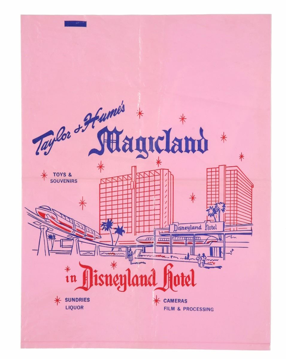 (Disneyland, 1960s-70s) Rare plastic shopping bag from the Taylor & Hume's Magic Shop at the Disneyland Hotel. Taylor & Hume's also ran Magic Shops on Main Street and Fantasyland. Bag measures 15.5"x11.5". In good condition with some creasing from use.