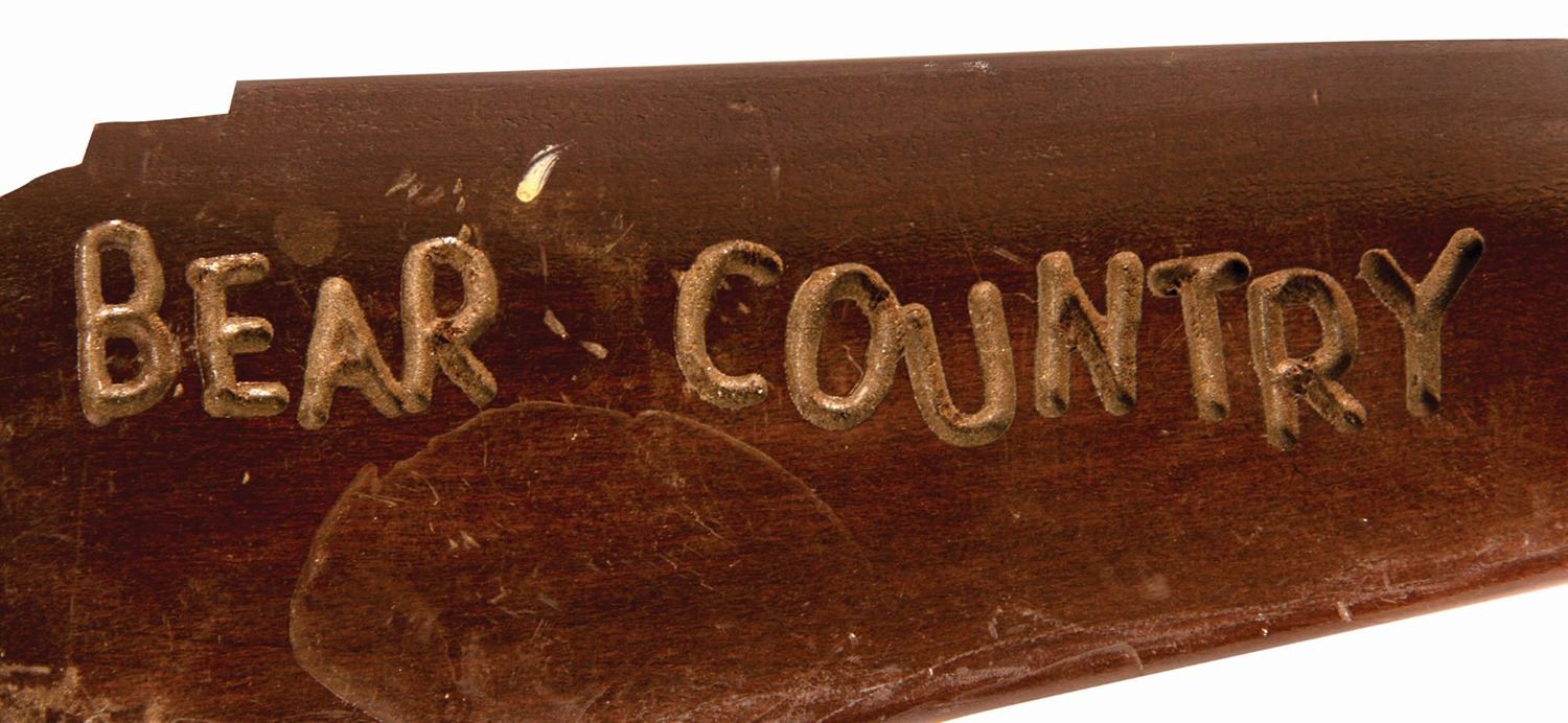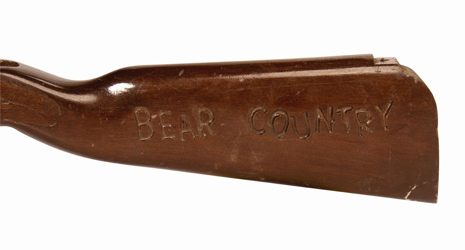 (Disneyland, c.1980s-90s) A wooden rifle body from Teddi Barra's Swingin' Arcade in Bear Country. The stock is engraved on both sides with the words "Bear Country." Although the barrel and mechanical components are no longer included, the wooden body is a great prop from this unique period of Disneyland history, prior to the land's re-theme as Critter Country in 1992. Measuring 27"x4.5" and 1.5" thick, the prop is in fair condition with surface wear throughout from park use.