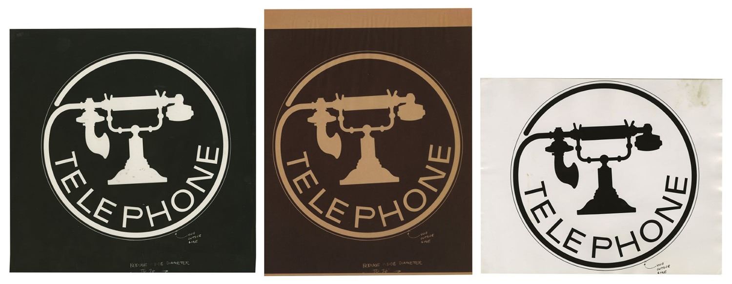 (Disneyland, c.1966) A set of developmental artwork for a "Telephone" sign found in New Orleans Square. The set includes a transparency, a photostat print, and a brownline print of the sign imagery. Ranging in size from approximately 8"x10" to 10"x10", the collection is in very good condition with some creasing to the lower left corner of the photostat print, as well as spots of discoloration.