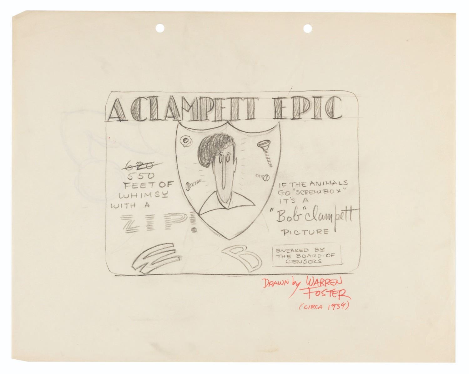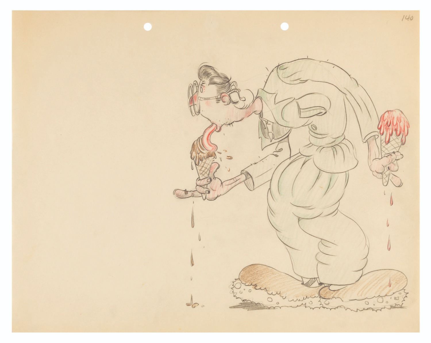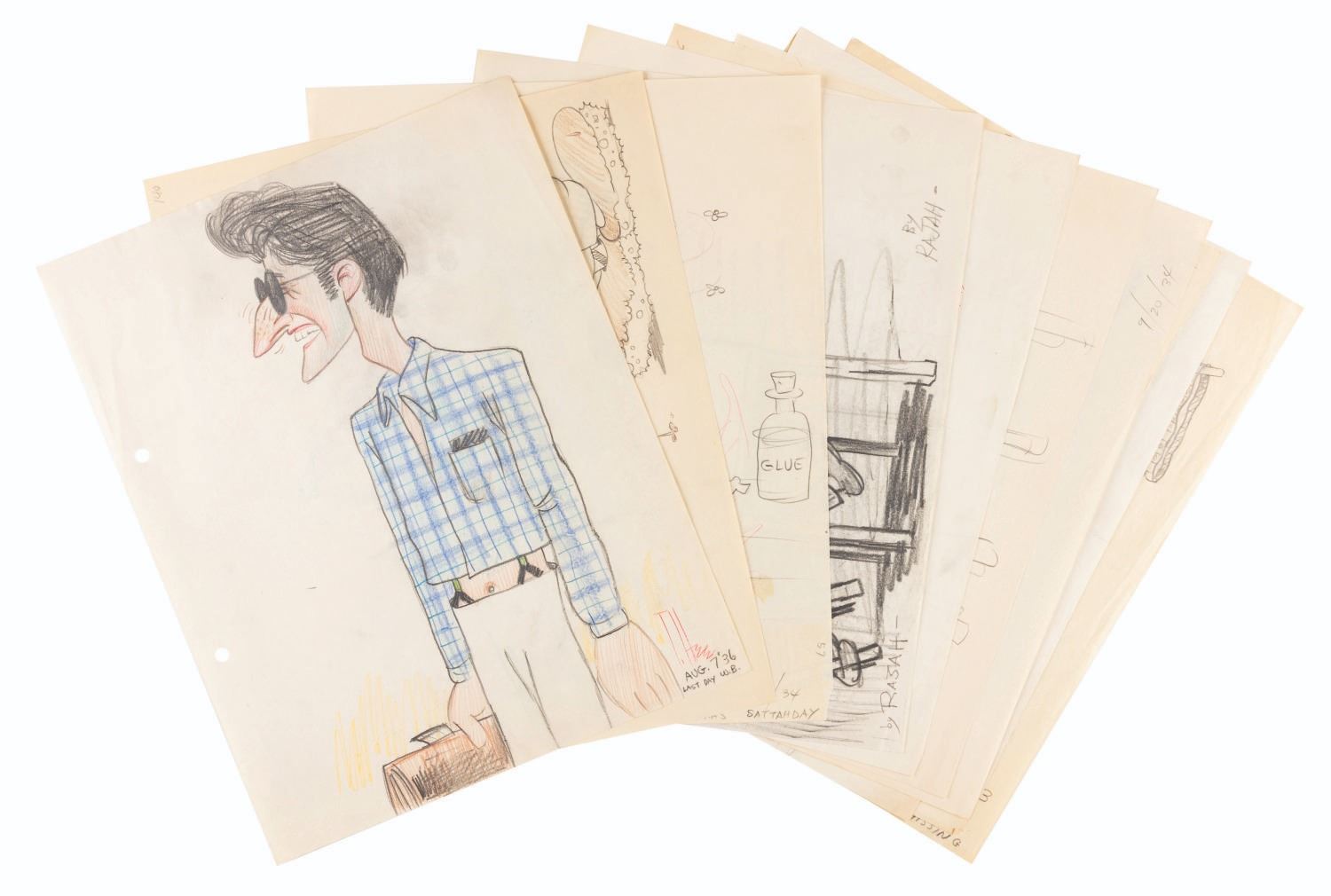 (Clampett, 1930s) Animating by hand to a strict character model is daunting and even grueling work. It is a time-honored tradition for animators to both express themselves and let off a little steam by creating gag drawings and caricatures of their coworkers in their own styles. This collection of ten artists’ caricatures spans Bob Clampett’s early career. Three pieces were drawn by Warren Foster, Rajah, and T. Hee, with the remaining seven unsigned. The works exhibit a range of style and detail, from quick gags of Clampett sporting an overabundance of hair and drawing from atop a stack of pillows, to an intricate depiction of him eating an ice cream cone. T. Hee’s drawing dated August 7, 1936, and another dated May 27, 1933 mark his last days at Warner Brothers and Harman-Ising, respectively. Measuring up to 9.75” x 12”, the sketches accomplished in mixed media are all in very good condition, with expected wear from handling and age including small smudges and creases.