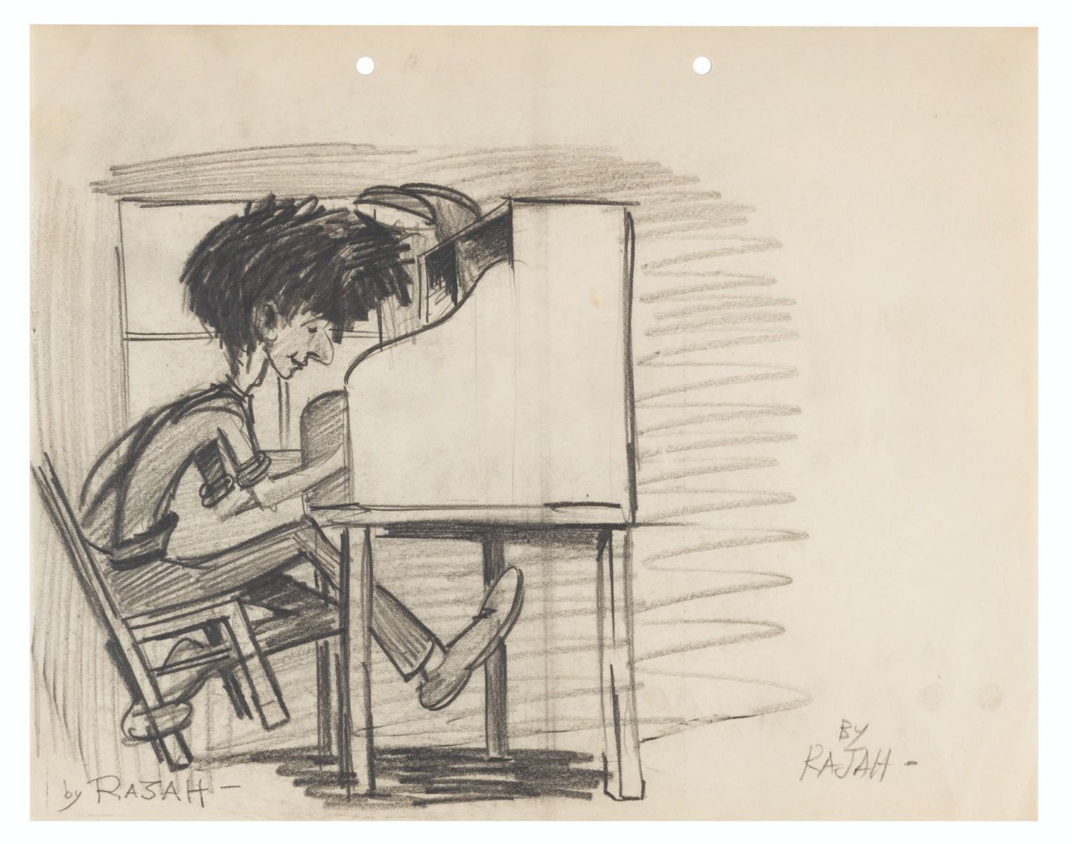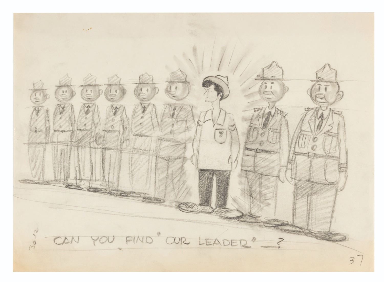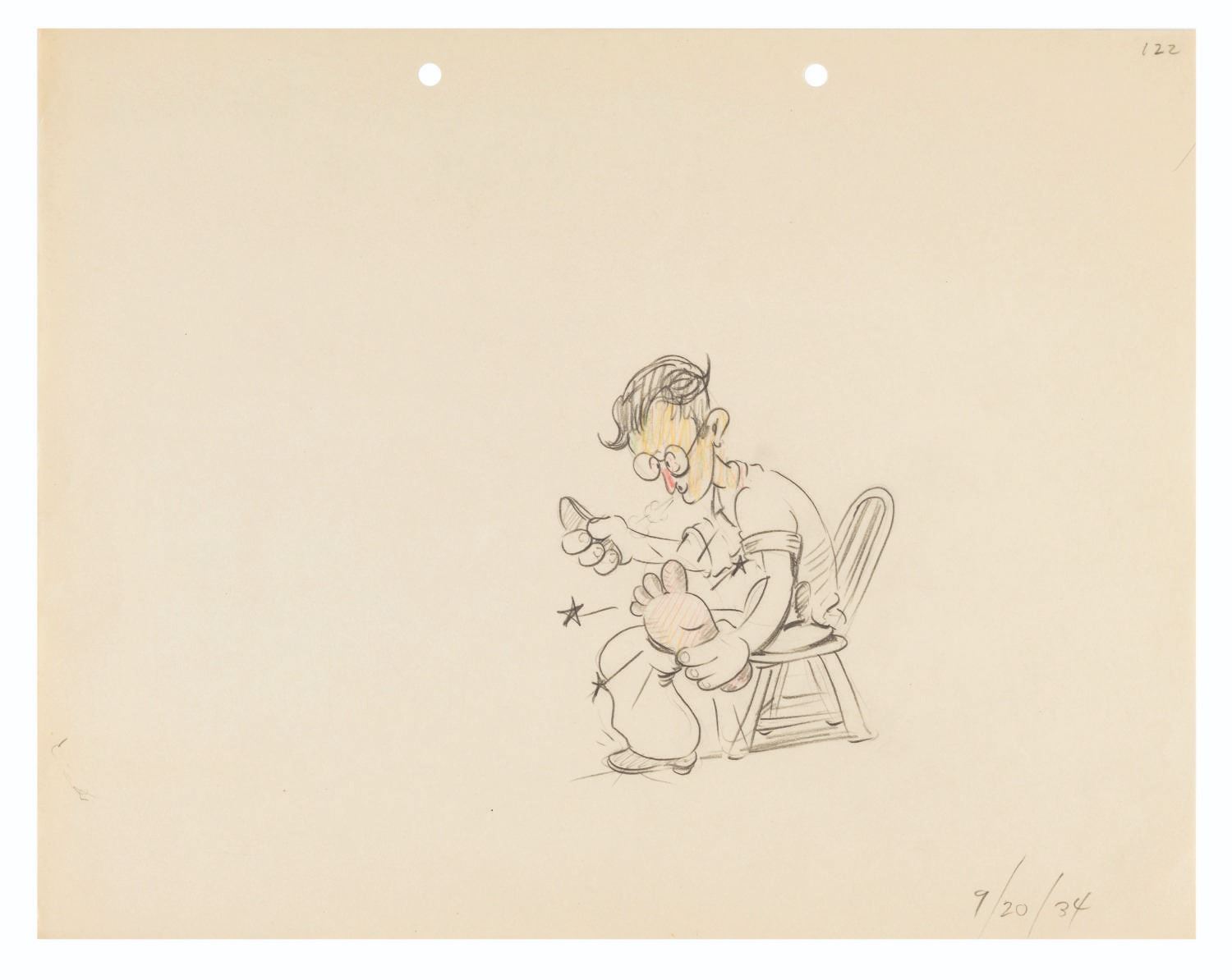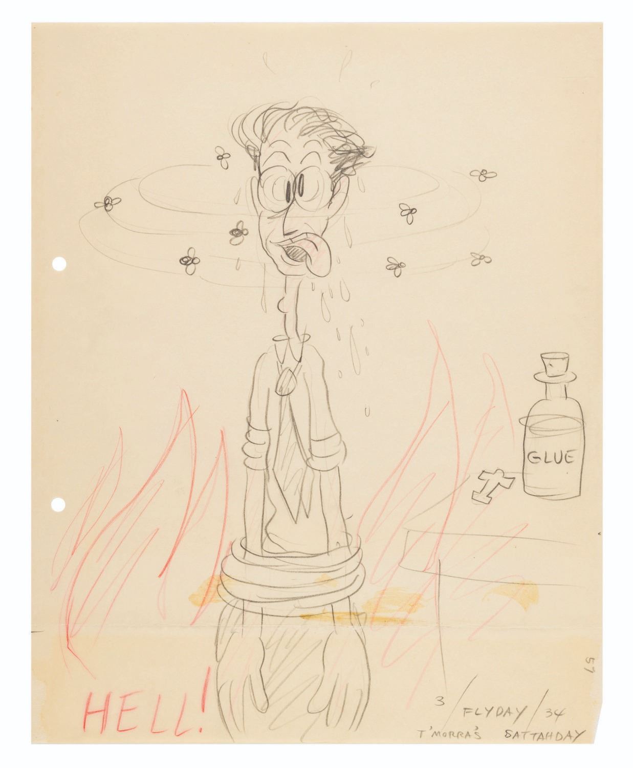 (Clampett, 1930s) Animating by hand to a strict character model is daunting and even grueling work. It is a time-honored tradition for animators to both express themselves and let off a little steam by creating gag drawings and caricatures of their coworkers in their own styles. This collection of ten artists’ caricatures spans Bob Clampett’s early career. Three pieces were drawn by Warren Foster, Rajah, and T. Hee, with the remaining seven unsigned. The works exhibit a range of style and detail, from quick gags of Clampett sporting an overabundance of hair and drawing from atop a stack of pillows, to an intricate depiction of him eating an ice cream cone. T. Hee’s drawing dated August 7, 1936, and another dated May 27, 1933 mark his last days at Warner Brothers and Harman-Ising, respectively. Measuring up to 9.75” x 12”, the sketches accomplished in mixed media are all in very good condition, with expected wear from handling and age including small smudges and creases.