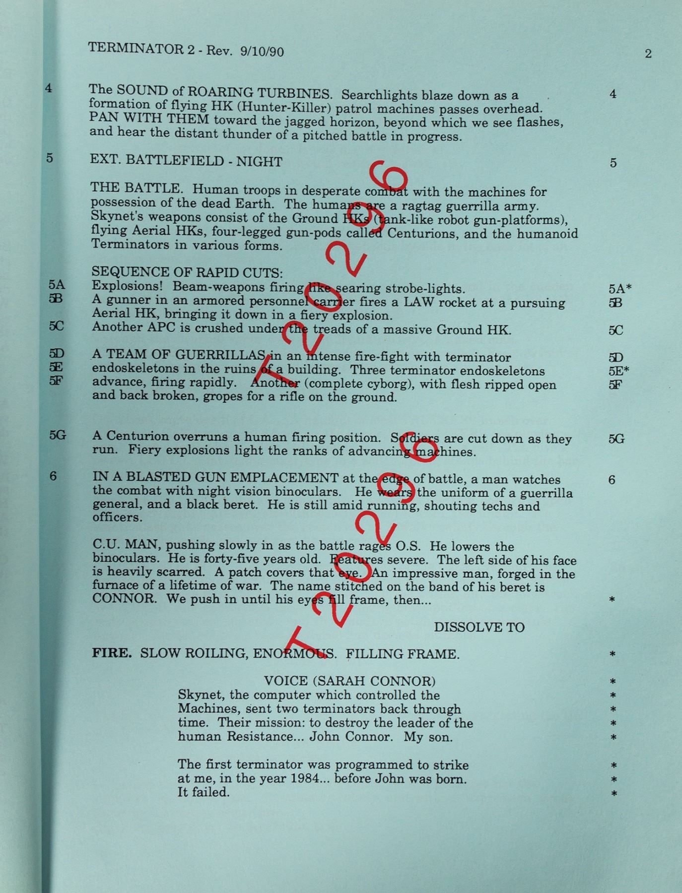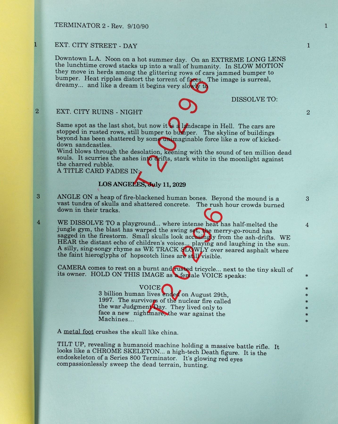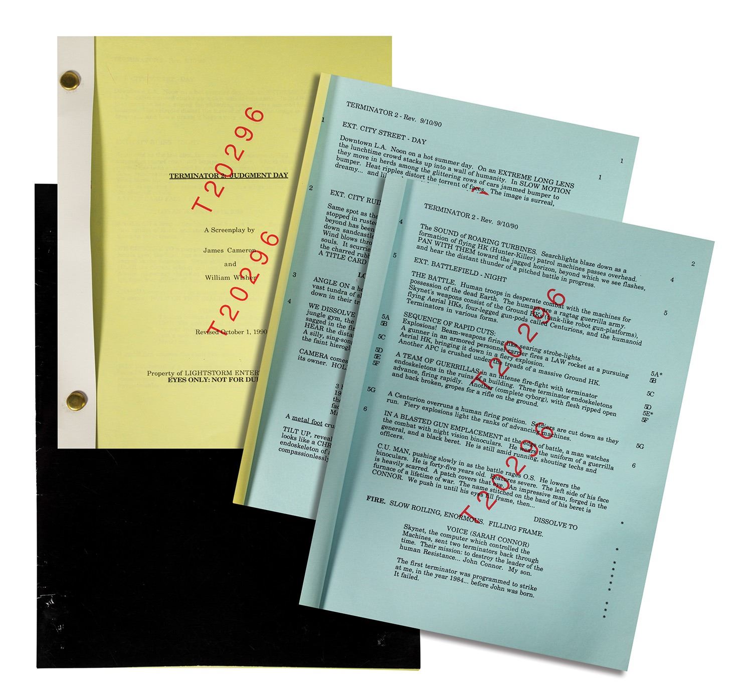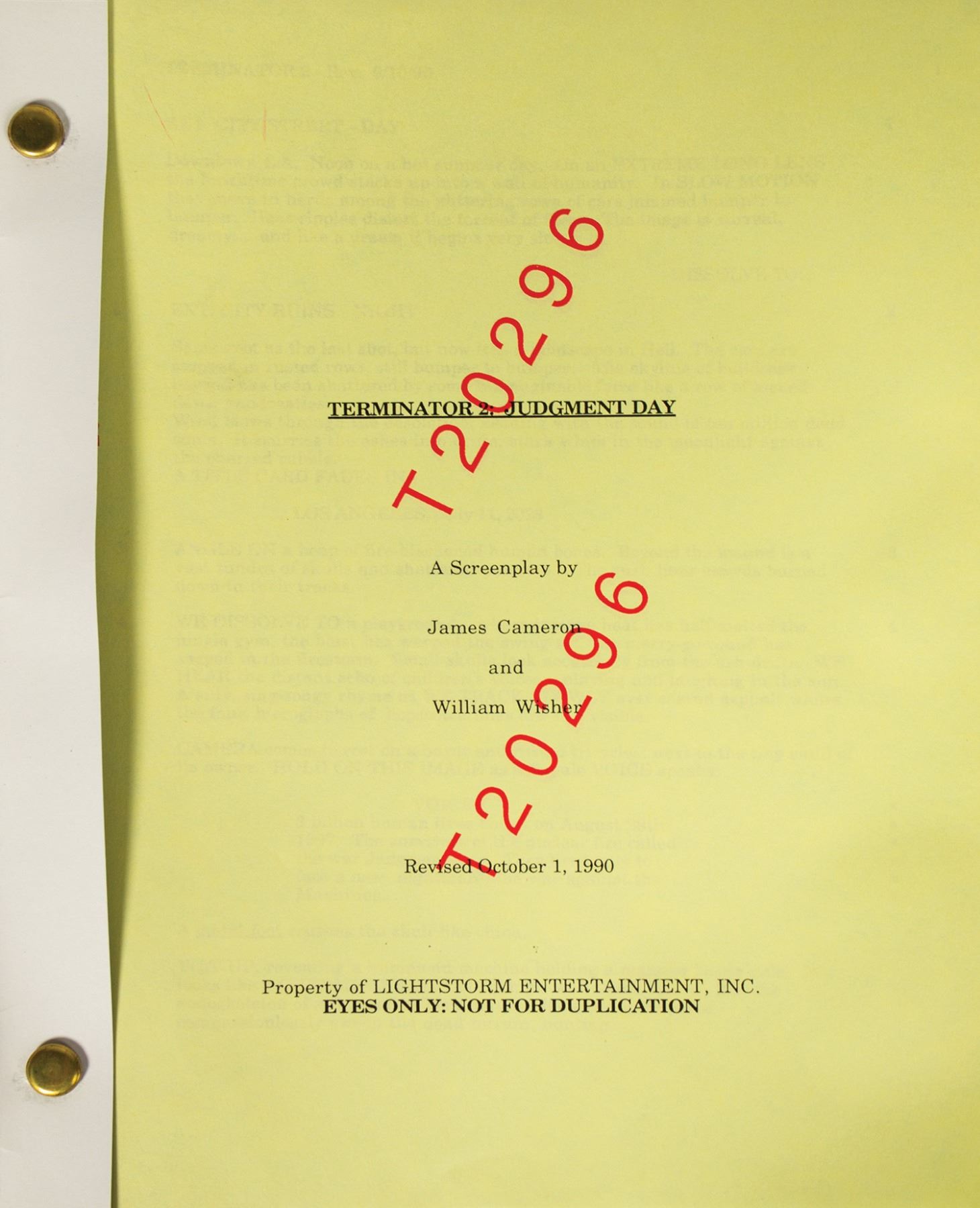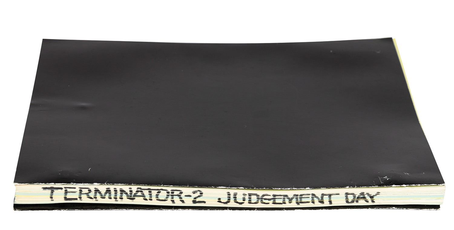 (Carolco, 1990) A script for Terminator 2: Judgment Day. This rare script comes from the collection of Bill Wallen, who helped design and create promotional and advertising campaign materials for the film. The 124-page script provides a fantastic look into the production of this iconic film, and measures 11"x8.5". The condition is very good with minor edge-wear.