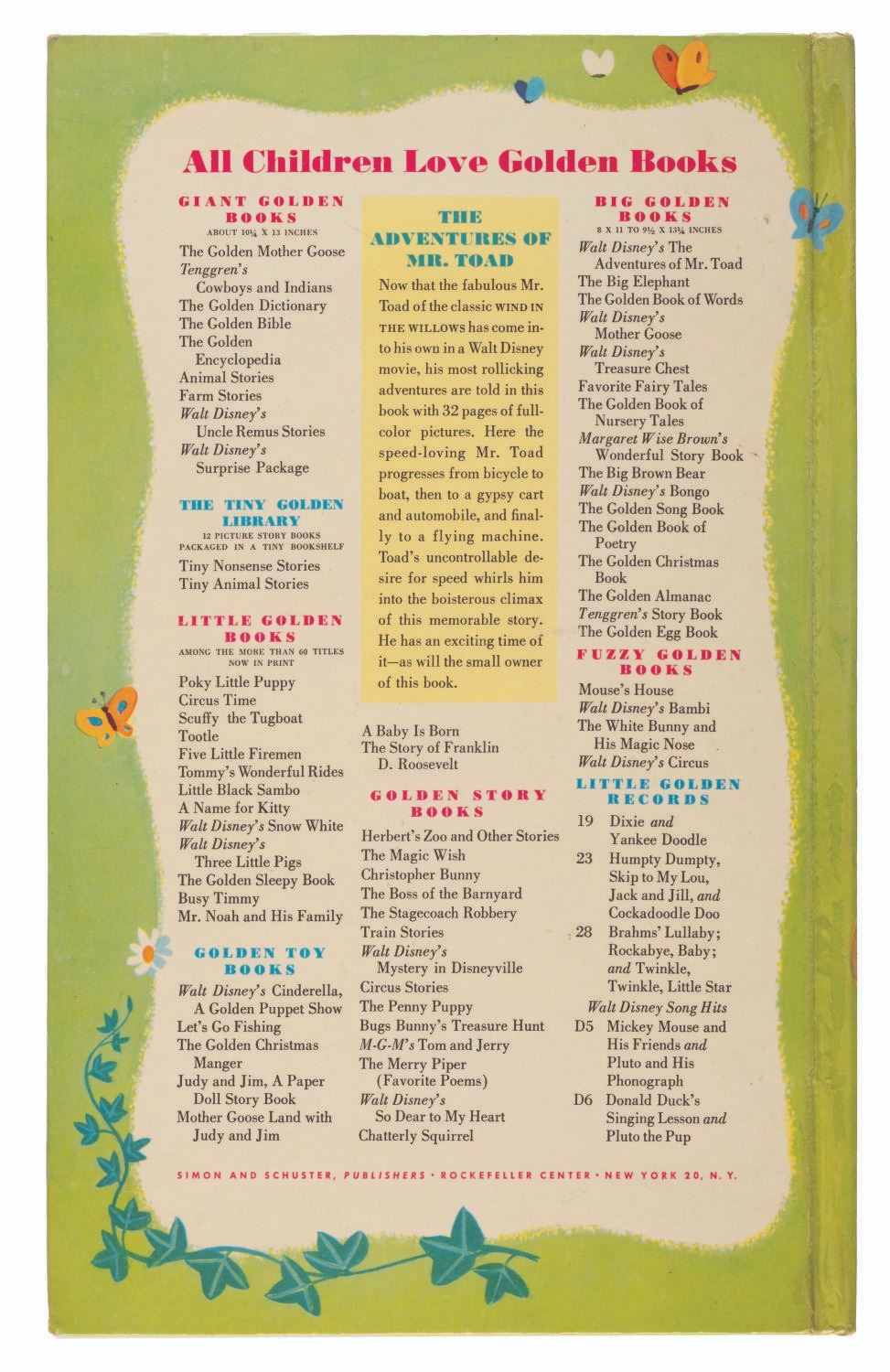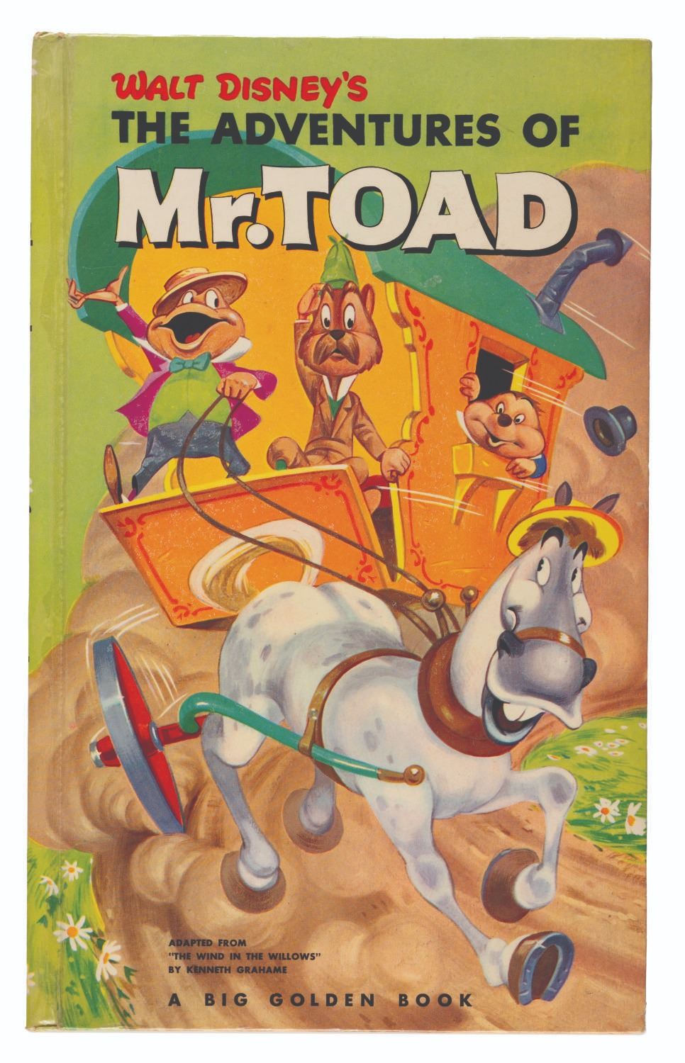 (Simon and Schuster, 1949) A Walt Disney's The Adventures of Mr. Toad Big Golden Book. This 32-page book features a story adapted by Disney Legend John Hench with full-color illustrations by Walt Disney Studio artists. Measuring 8.25" x 13.25", this book is in good condition with light wear on the front and back cover.