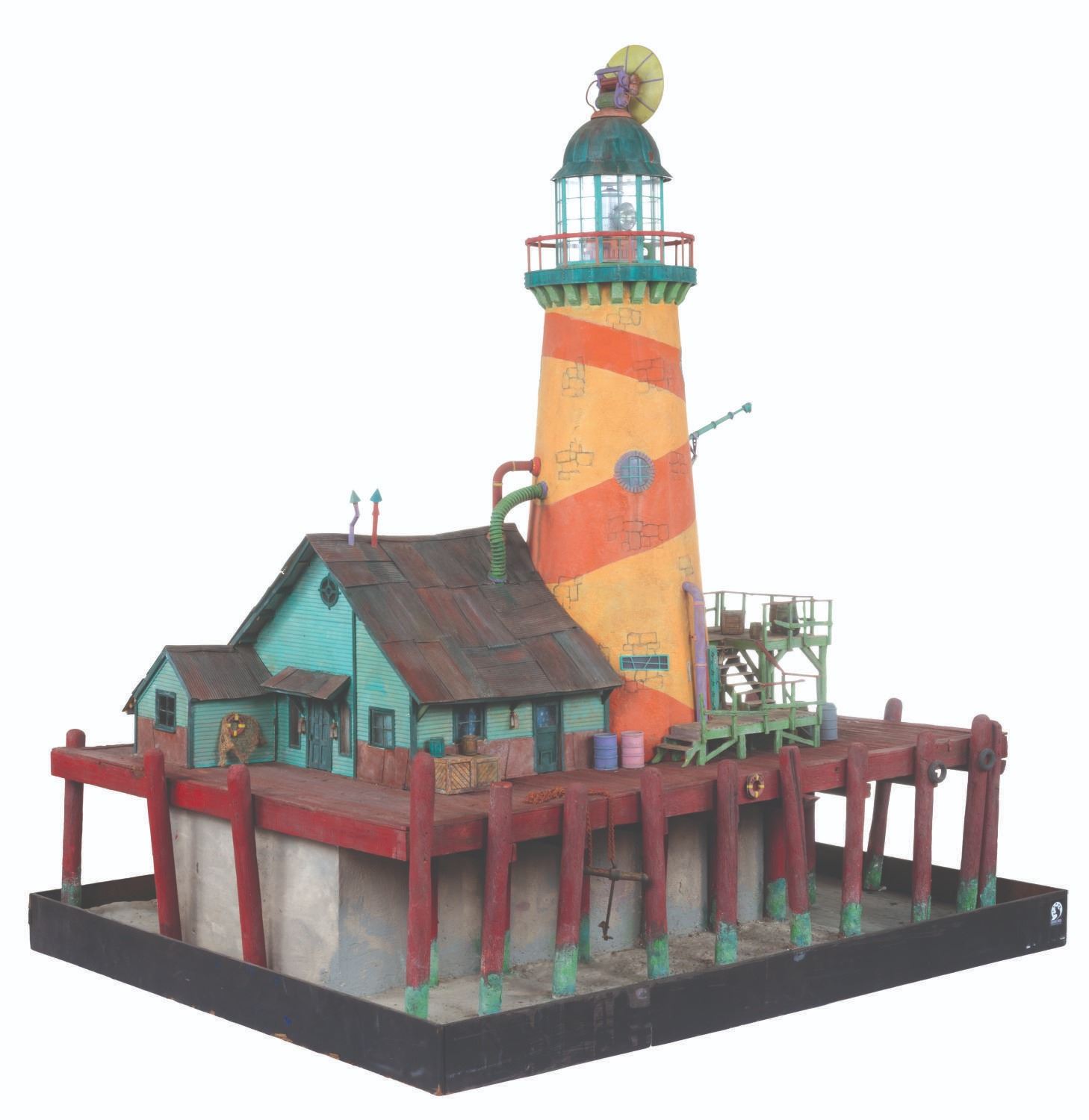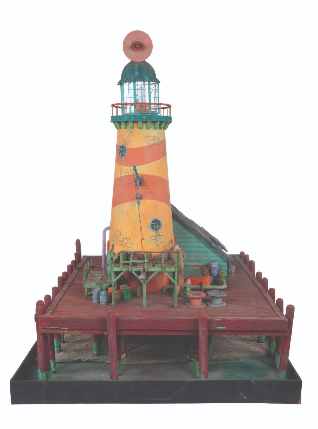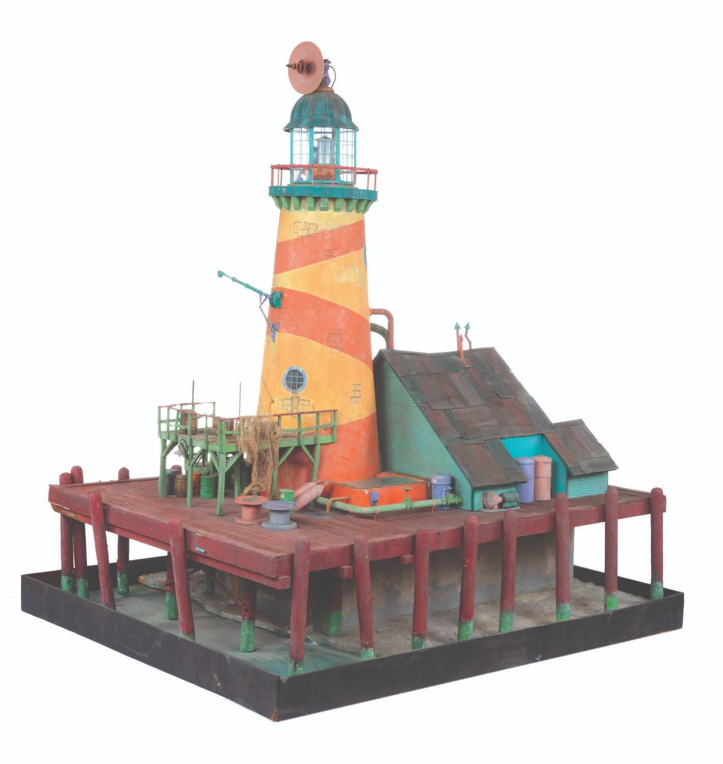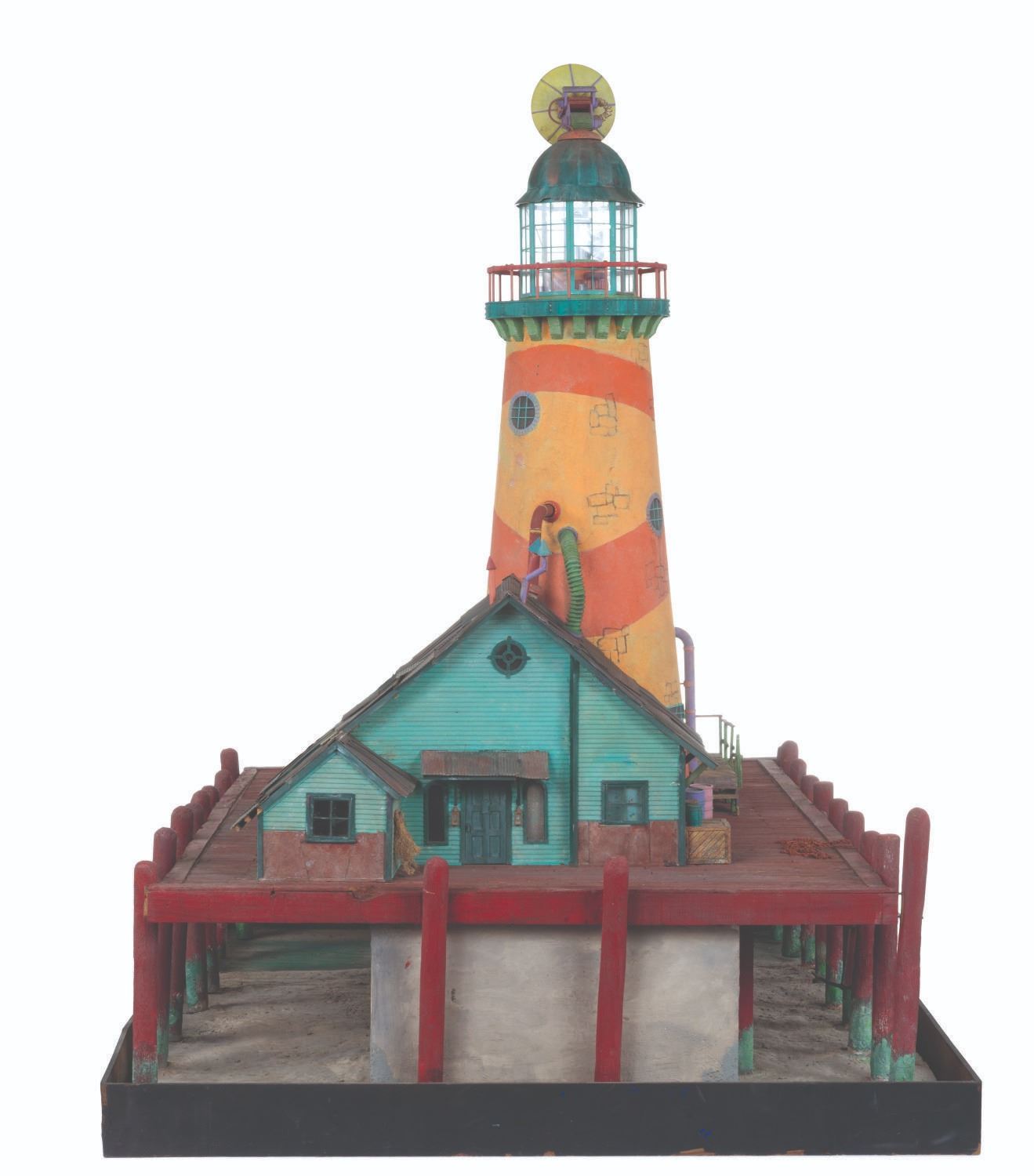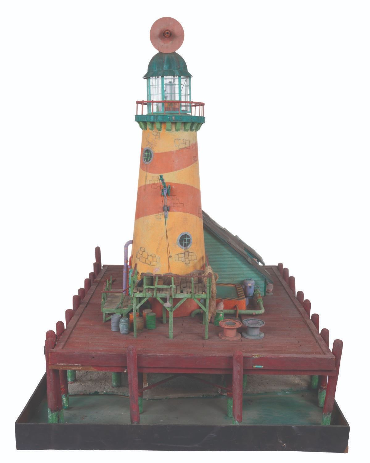 (CBS, 1992) The screen-used miniature lighthouse model from the live-action television series “The Amazing Live Sea Monkeys.” Howie Mandel created and starred in the series, playing a Professor who enlarges three Sea Monkeys to human size. This lighthouse model is the characters’ seaside home, appearing in establishing shots and the opening credits. The masterful creation by effects artists, the Chiodo Brothers, features intricate details, including tiny patterned curtains, a safety first sign, and a shark tank. Measuring 39.5” x 33.5” x 45” tall, the model displays in very good condition with wear from production use, including paint loss, stains, glue residue from repairs, part of the handrail missing, and cracks, notably to the lighthouse glass. This item requires special shipping arrangements. Please inquire before bidding.