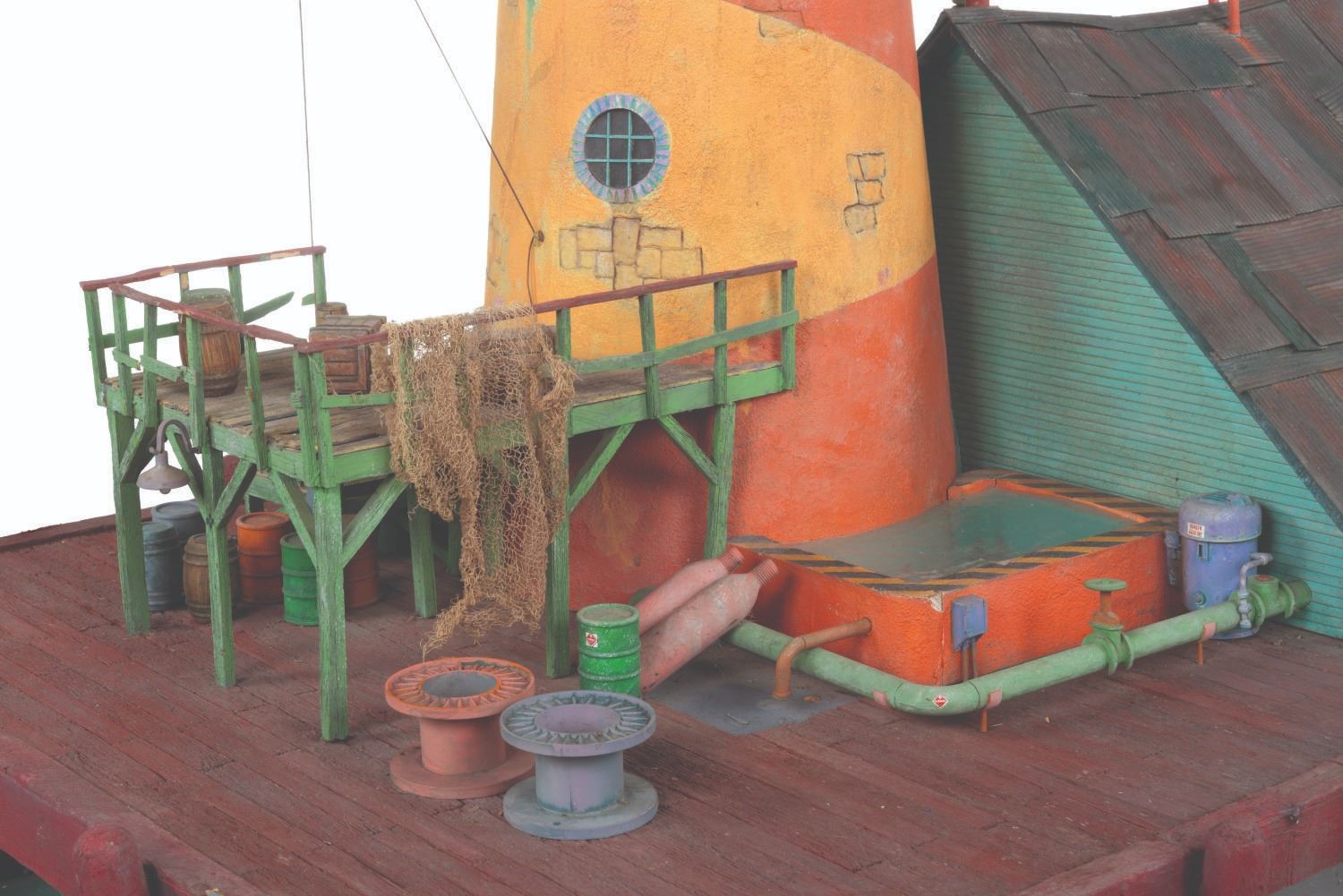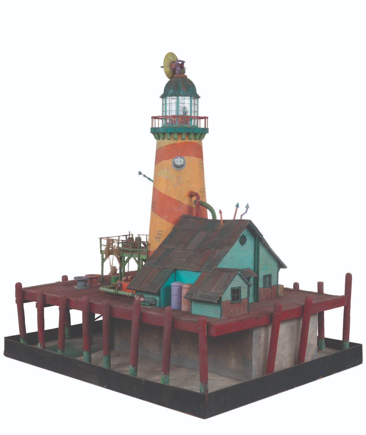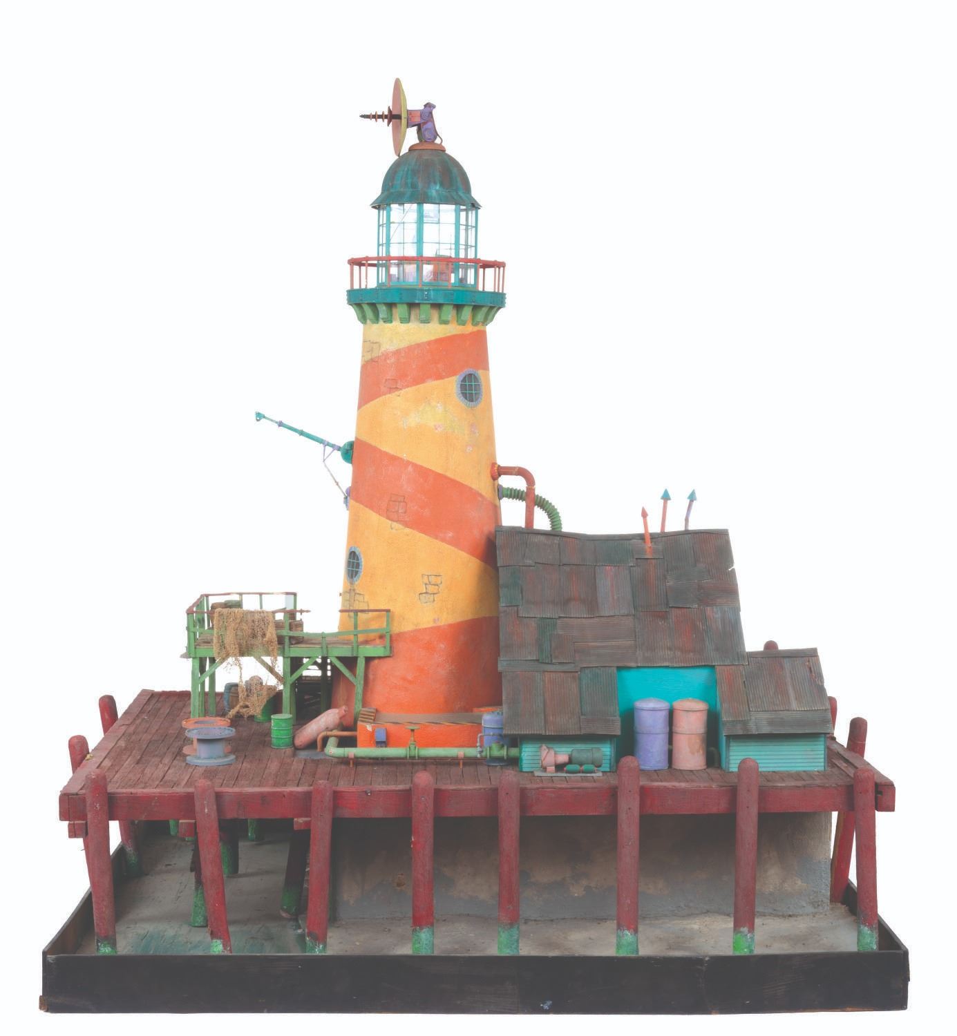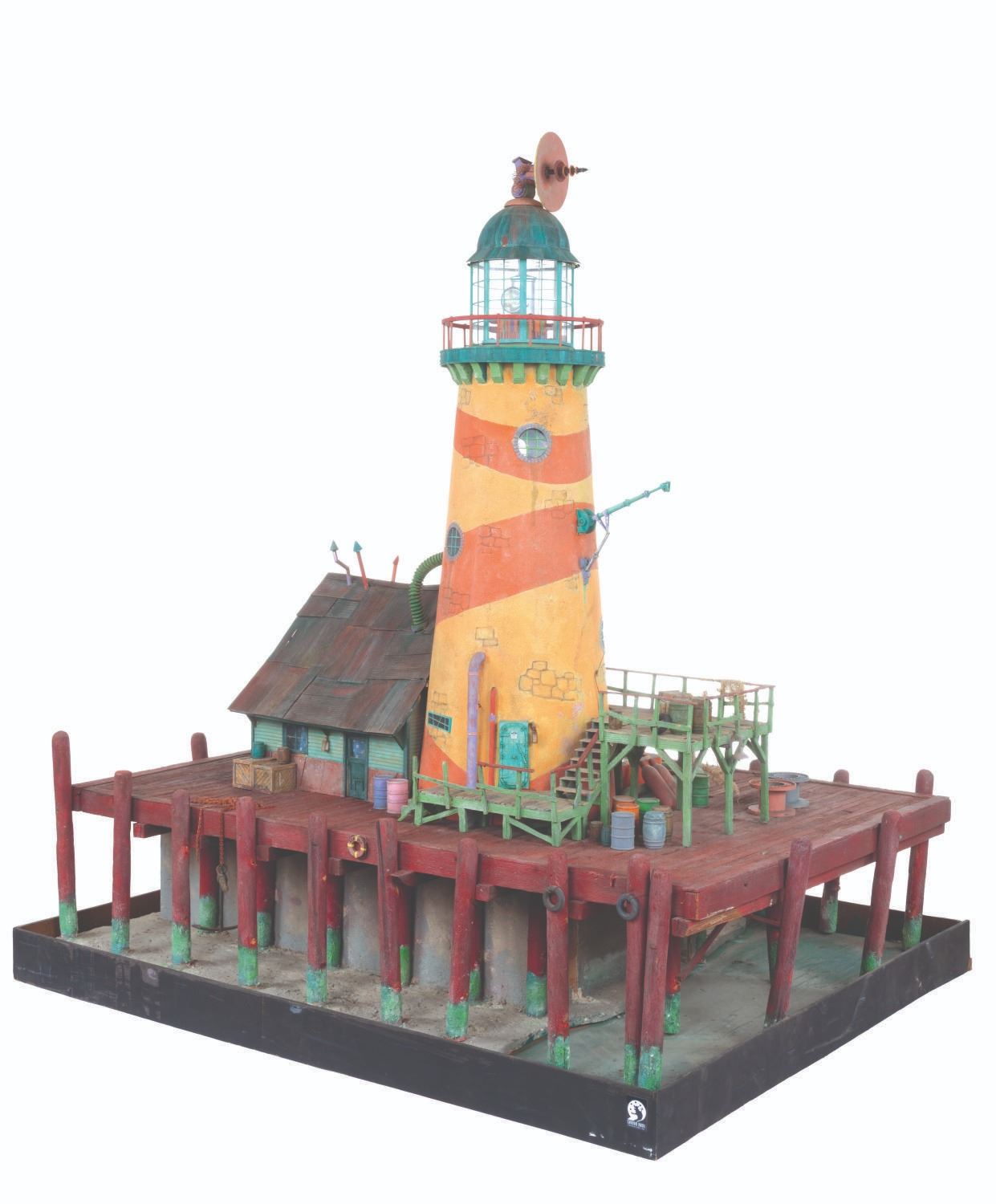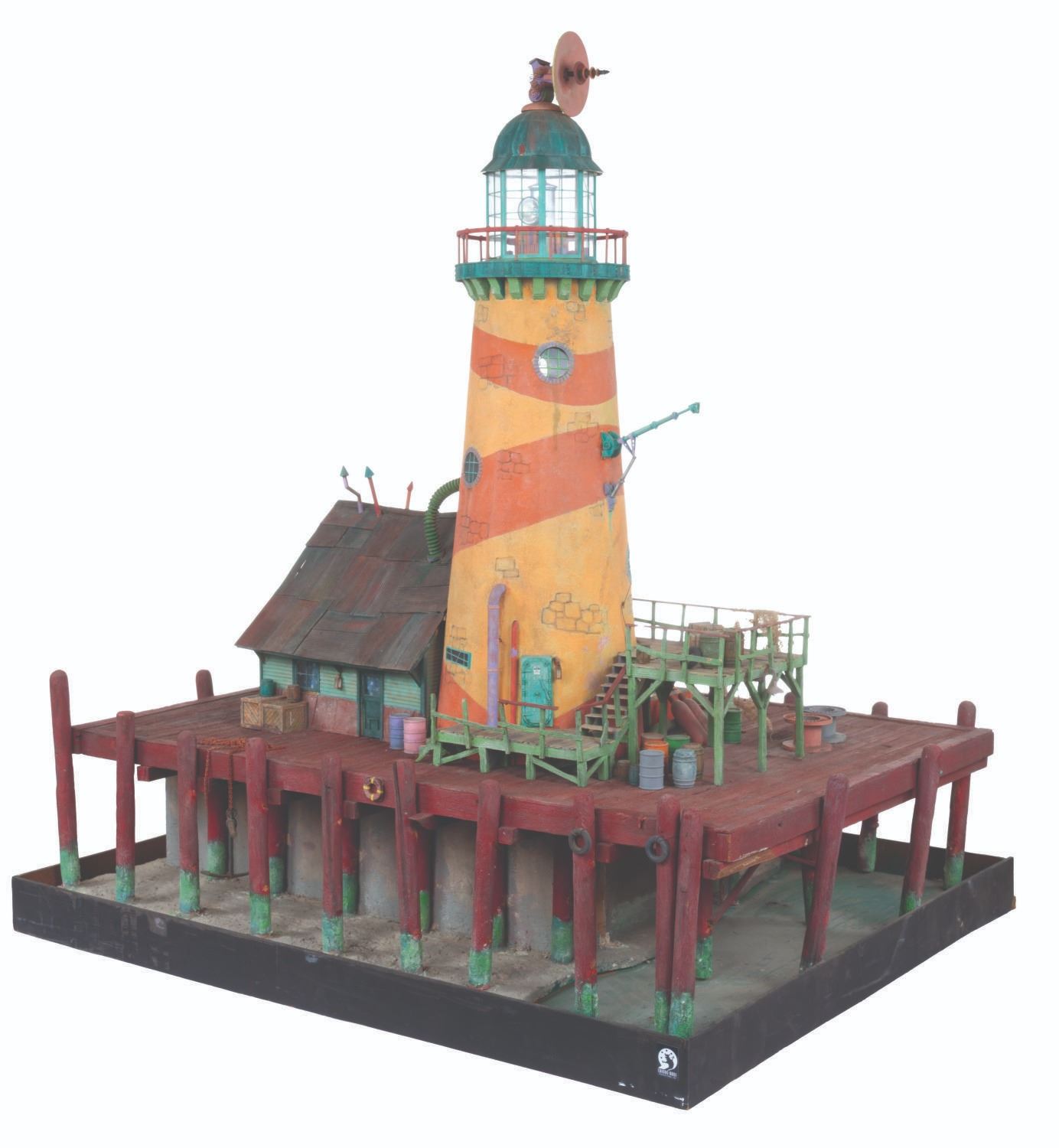 (CBS, 1992) The screen-used miniature lighthouse model from the live-action television series “The Amazing Live Sea Monkeys.” Howie Mandel created and starred in the series, playing a Professor who enlarges three Sea Monkeys to human size. This lighthouse model is the characters’ seaside home, appearing in establishing shots and the opening credits. The masterful creation by effects artists, the Chiodo Brothers, features intricate details, including tiny patterned curtains, a safety first sign, and a shark tank. Measuring 39.5” x 33.5” x 45” tall, the model displays in very good condition with wear from production use, including paint loss, stains, glue residue from repairs, part of the handrail missing, and cracks, notably to the lighthouse glass. This item requires special shipping arrangements. Please inquire before bidding.