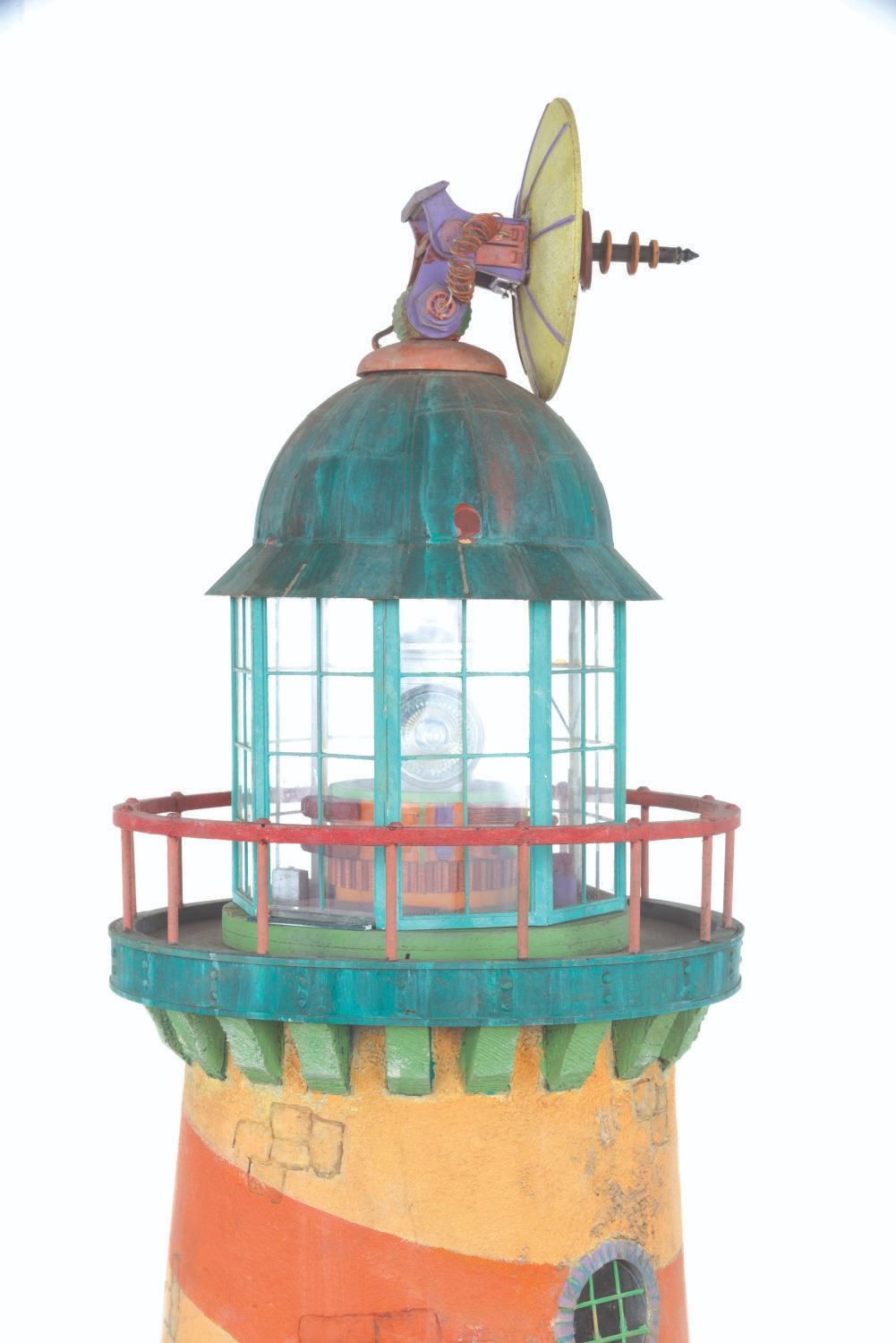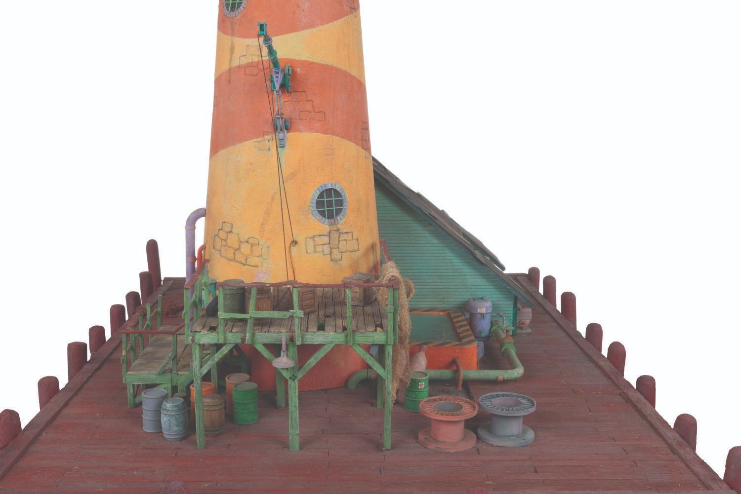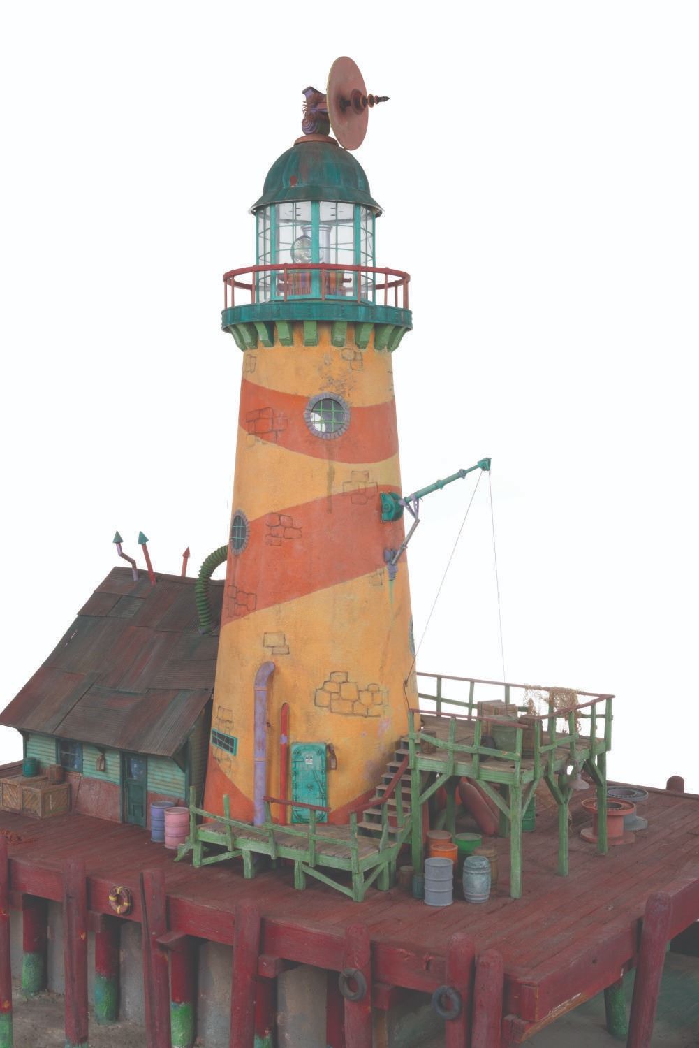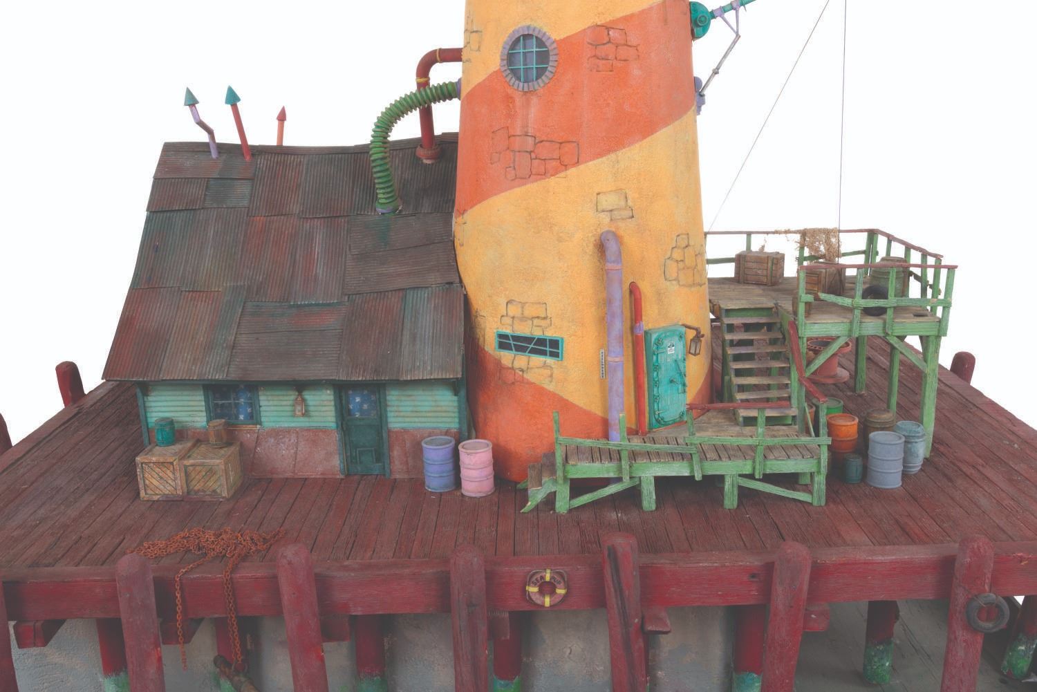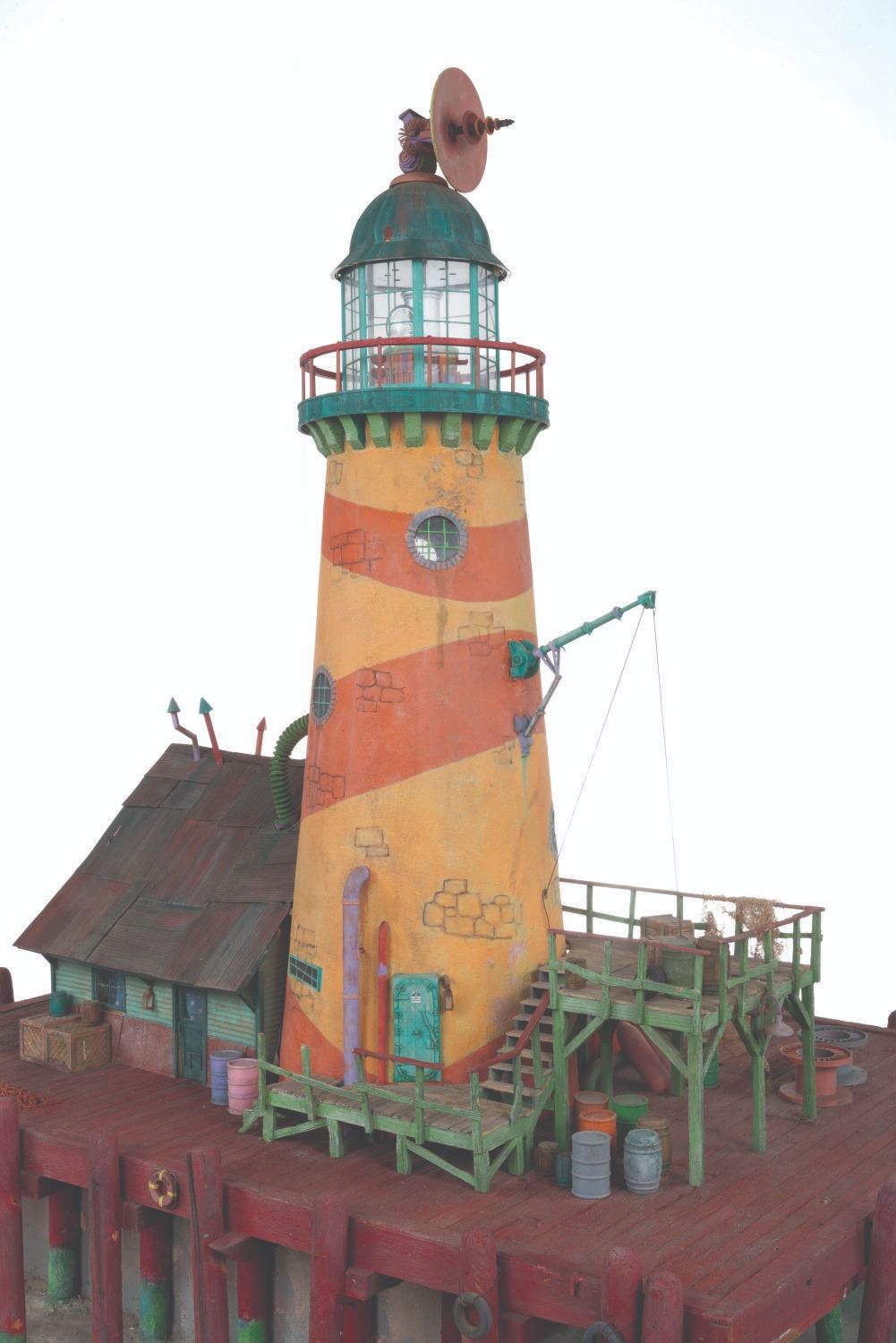(CBS, 1992) The screen-used miniature lighthouse model from the live-action television series “The Amazing Live Sea Monkeys.” Howie Mandel created and starred in the series, playing a Professor who enlarges three Sea Monkeys to human size. This lighthouse model is the characters’ seaside home, appearing in establishing shots and the opening credits. The masterful creation by effects artists, the Chiodo Brothers, features intricate details, including tiny patterned curtains, a safety first sign, and a shark tank. Measuring 39.5” x 33.5” x 45” tall, the model displays in very good condition with wear from production use, including paint loss, stains, glue residue from repairs, part of the handrail missing, and cracks, notably to the lighthouse glass. This item requires special shipping arrangements. Please inquire before bidding.