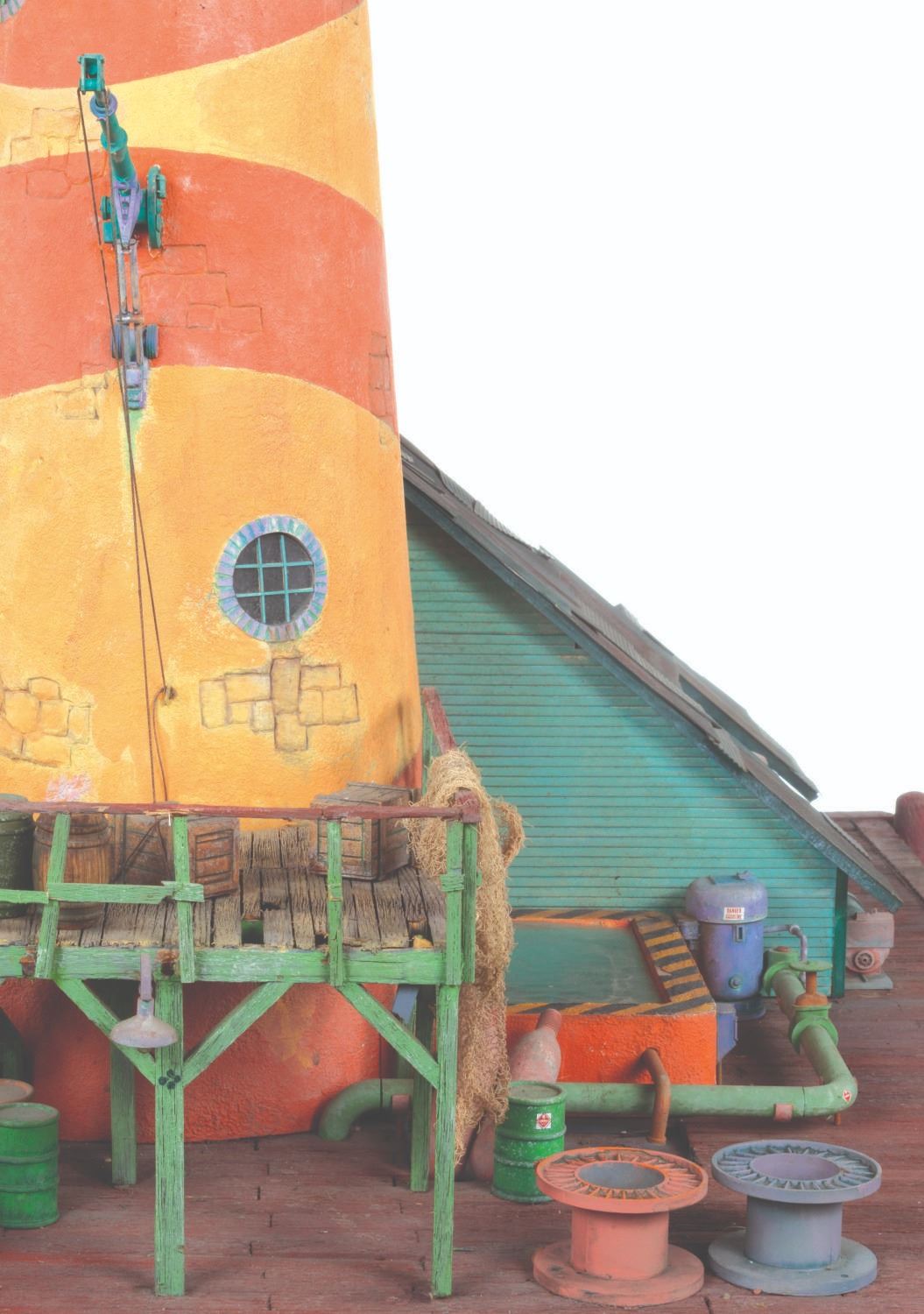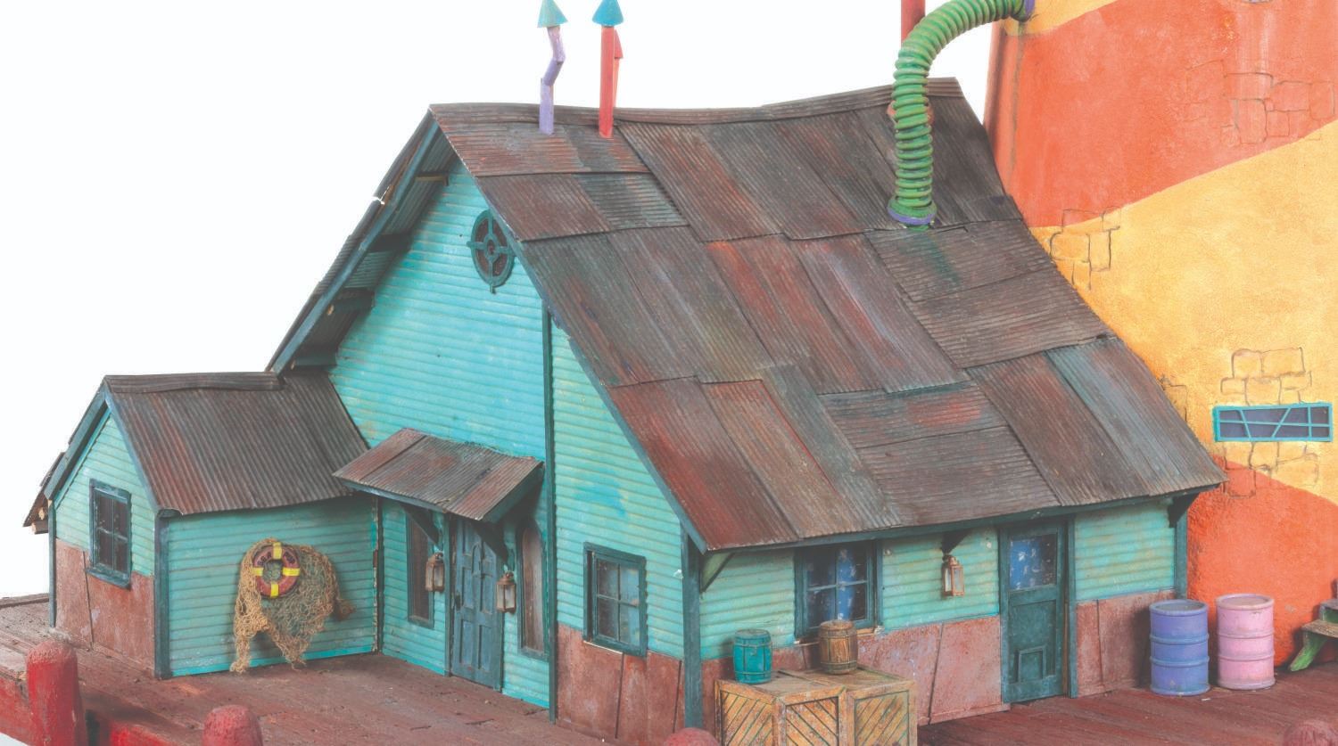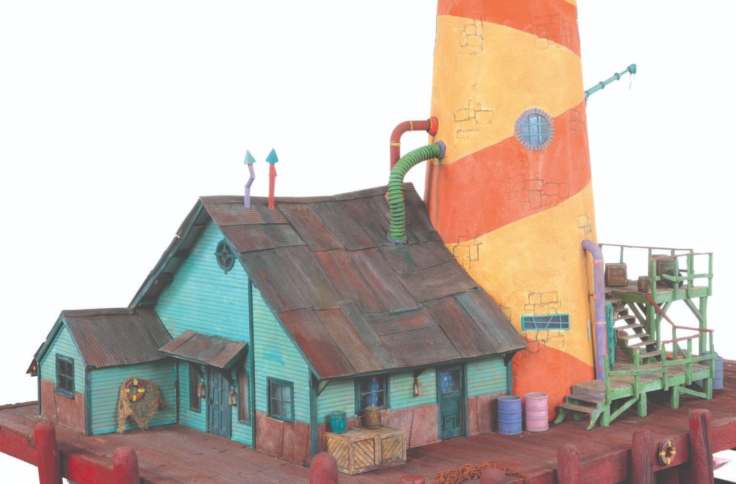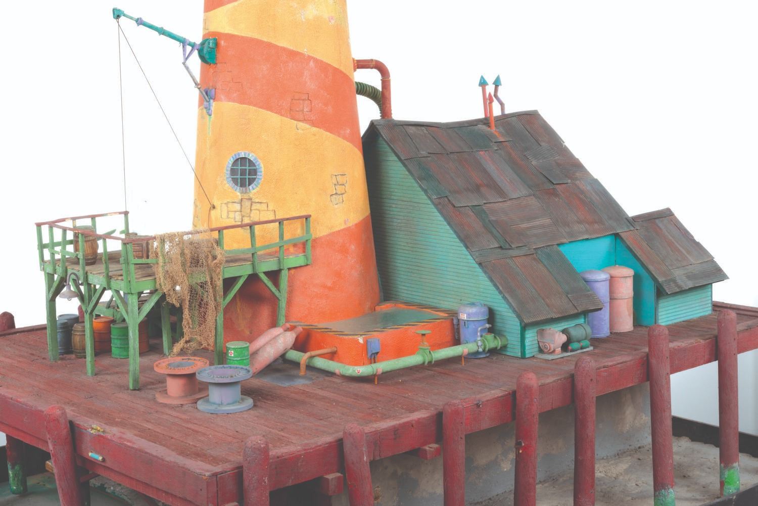 (CBS, 1992) The screen-used miniature lighthouse model from the live-action television series “The Amazing Live Sea Monkeys.” Howie Mandel created and starred in the series, playing a Professor who enlarges three Sea Monkeys to human size. This lighthouse model is the characters’ seaside home, appearing in establishing shots and the opening credits. The masterful creation by effects artists, the Chiodo Brothers, features intricate details, including tiny patterned curtains, a safety first sign, and a shark tank. Measuring 39.5” x 33.5” x 45” tall, the model displays in very good condition with wear from production use, including paint loss, stains, glue residue from repairs, part of the handrail missing, and cracks, notably to the lighthouse glass. This item requires special shipping arrangements. Please inquire before bidding.