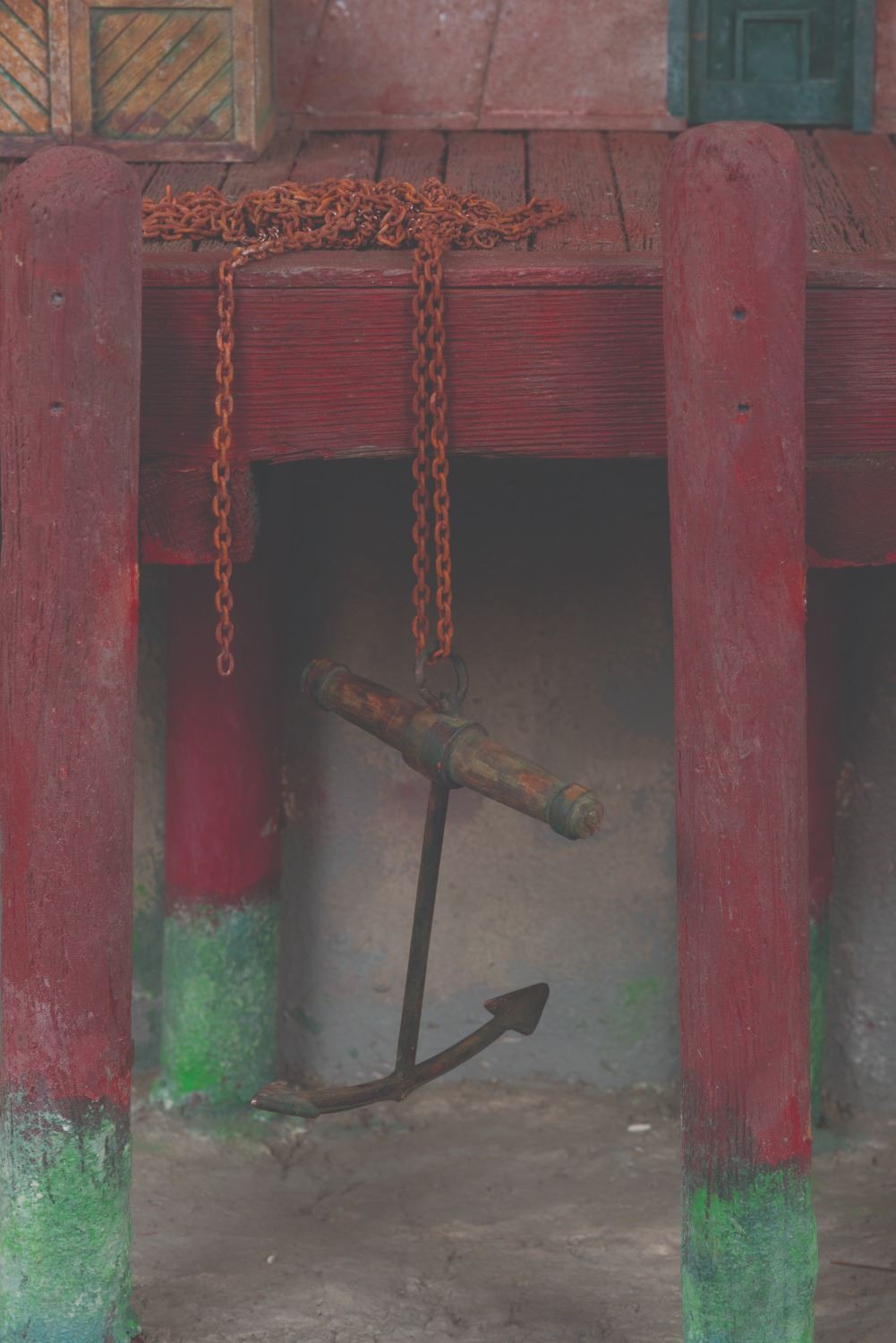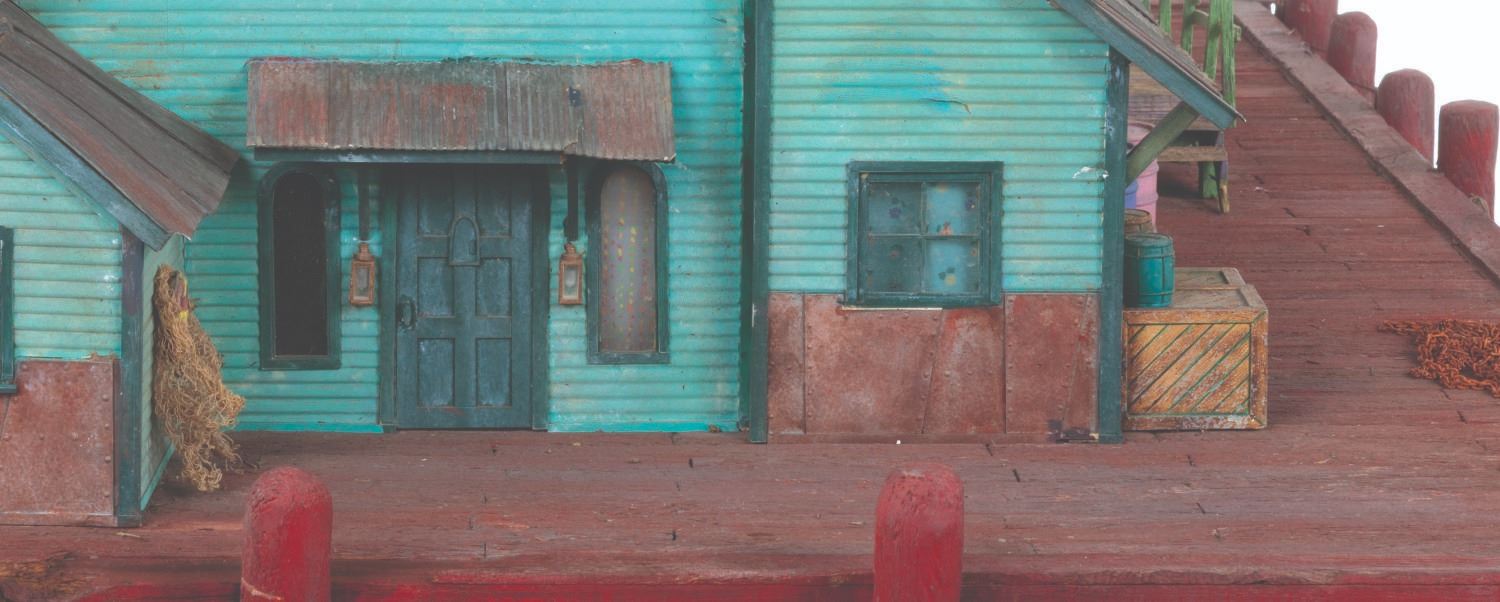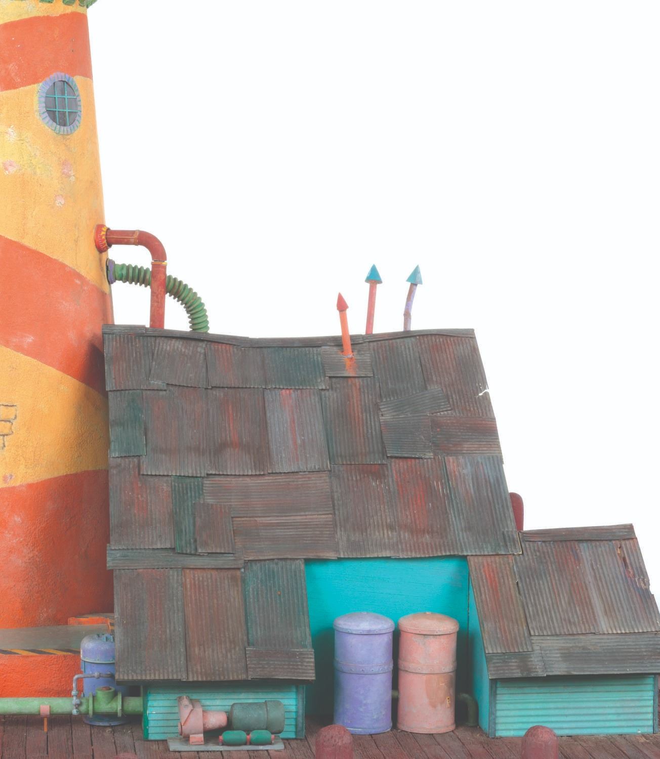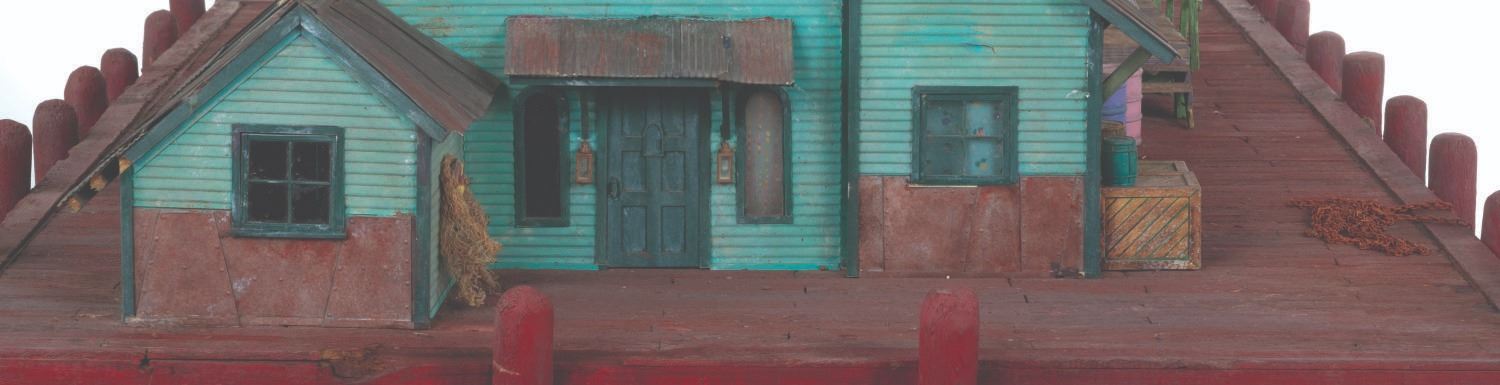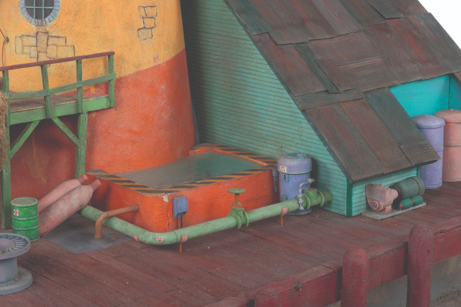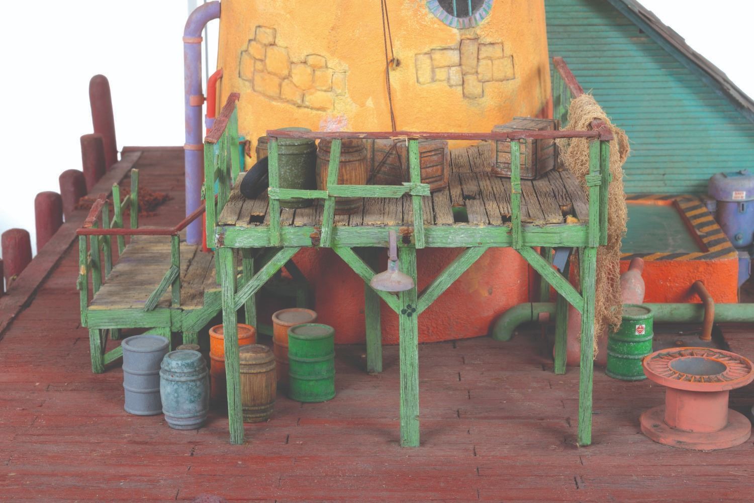 (CBS, 1992) The screen-used miniature lighthouse model from the live-action television series “The Amazing Live Sea Monkeys.” Howie Mandel created and starred in the series, playing a Professor who enlarges three Sea Monkeys to human size. This lighthouse model is the characters’ seaside home, appearing in establishing shots and the opening credits. The masterful creation by effects artists, the Chiodo Brothers, features intricate details, including tiny patterned curtains, a safety first sign, and a shark tank. Measuring 39.5” x 33.5” x 45” tall, the model displays in very good condition with wear from production use, including paint loss, stains, glue residue from repairs, part of the handrail missing, and cracks, notably to the lighthouse glass. This item requires special shipping arrangements. Please inquire before bidding.