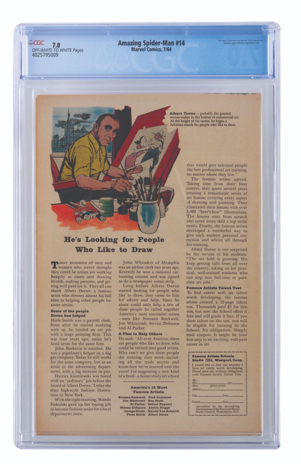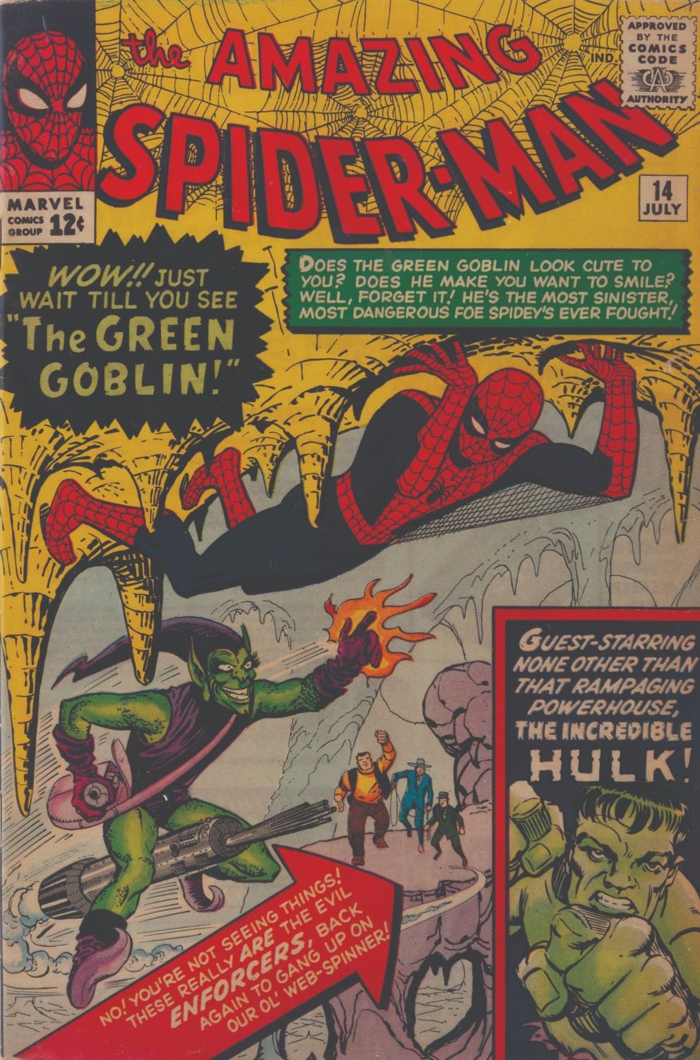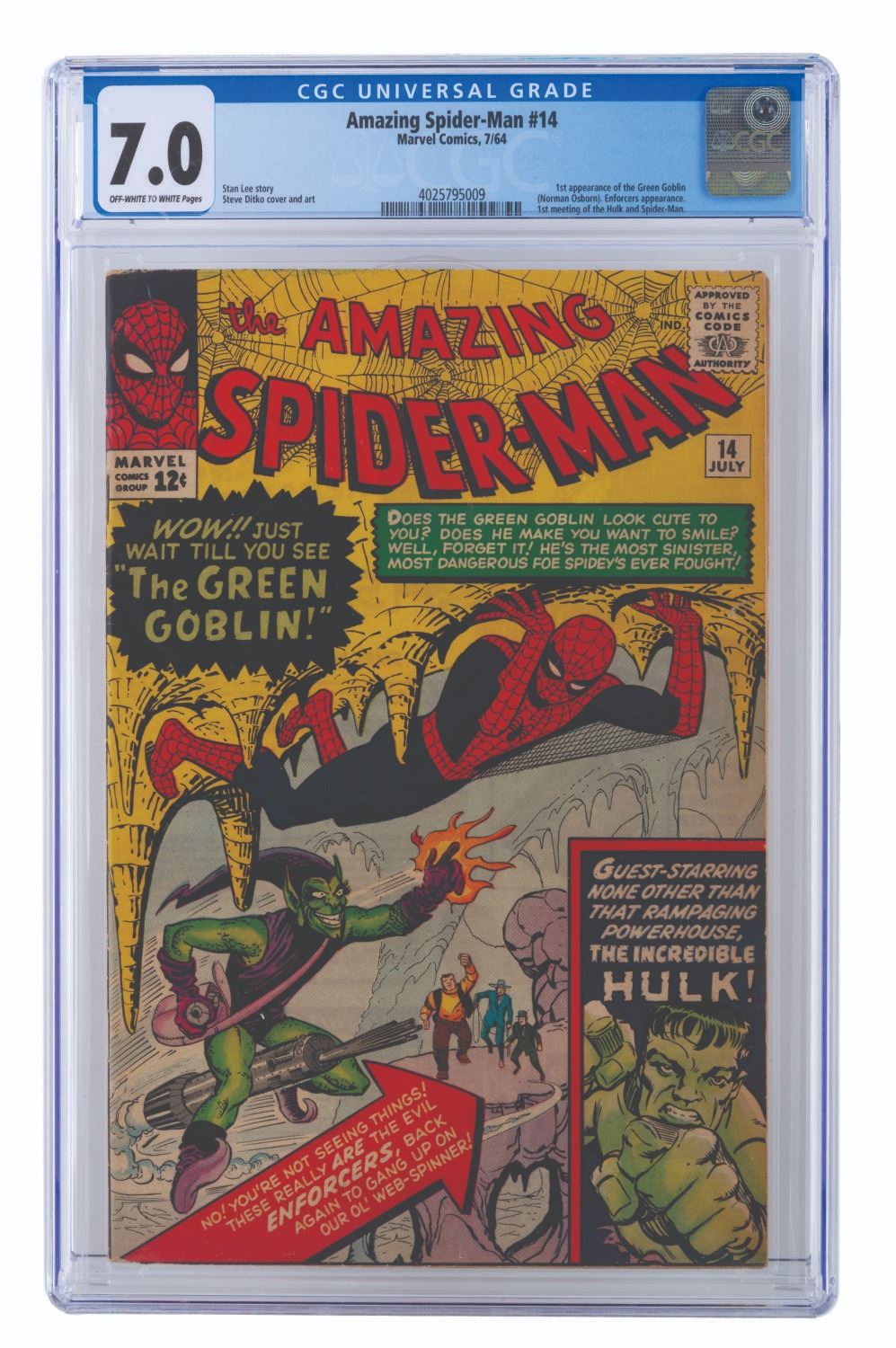 (Marvel, 1964) The Amazing Spider-Man issue 14 featuring the first ever appearance of Spider-Man’s deadliest foe, the Green Goblin. Debuting as Norman Osborn, the father of Peter Parker’s best friend Harry, the goblin remained a constant in the webslinger’s stories through the animated series, comic books, and films. This book also features Spider-Man’s first meeting with another Marvel superstar, the Incredible Hulk. The comic book is CGC graded 7.0 with off-white to white pages.