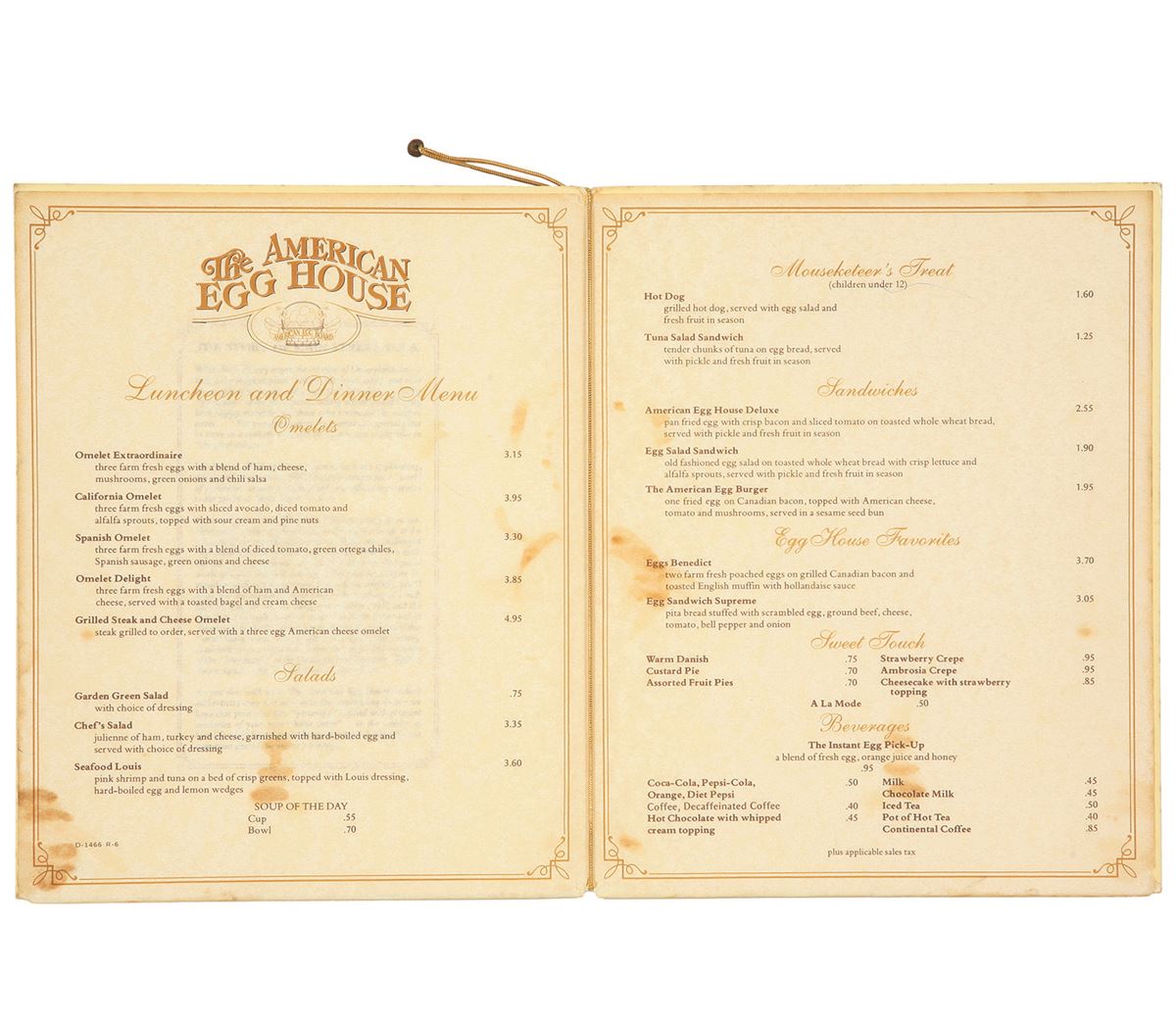 (Disneyland, 1970s) An original fold-over menu from The American Egg House at Disneyland. Features The American Egg House and American Egg Board logos on the front, with a description of the “Story of Main Street” written along the inner-left cover. A gold-colored cord keeps the inner menu prices page in place. Measures 10”x8” closed and 10”x16” opened. In good condition with minimal wear from use. Interior menu pages have some moderate staining.