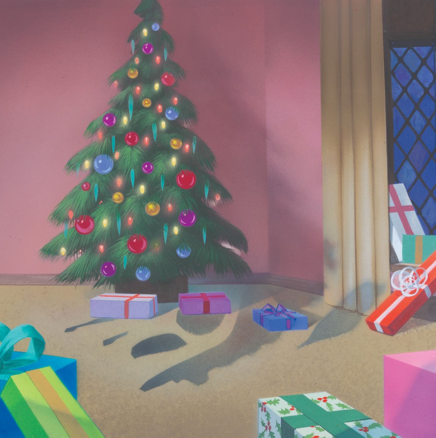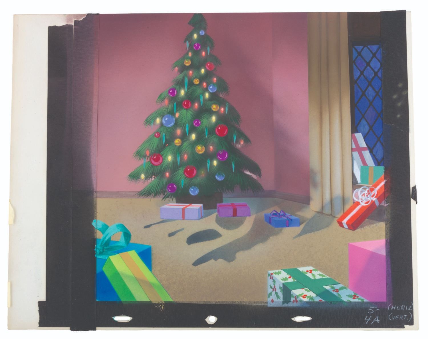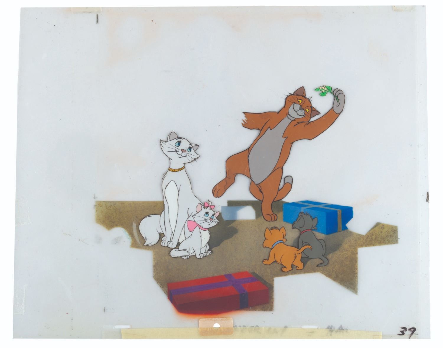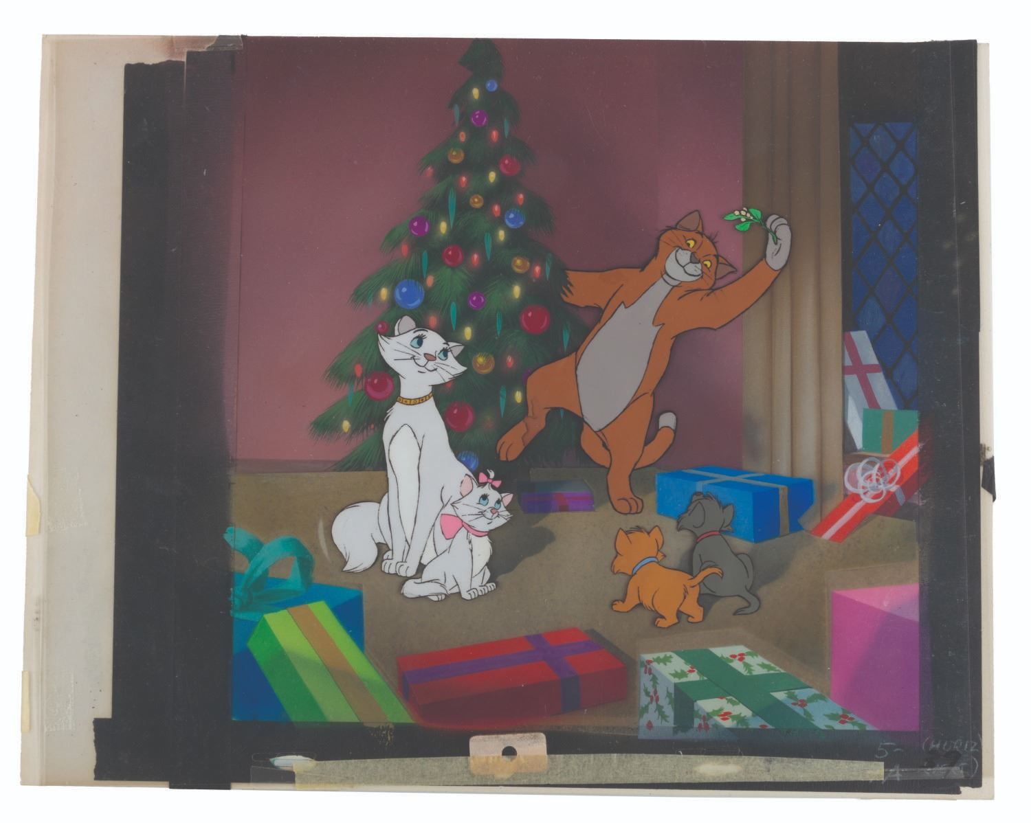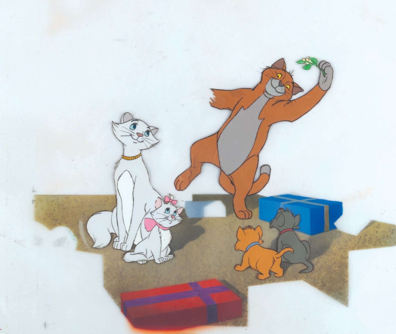(Disney, 1970) An original multi-layer publicity cel and background for"The Aristocats." Featuring Thomas O'Malley, Duchess, Berlioz, Toulouse, and Marie, the holiday-themed art was used to promote the film's release during the Christmas season on December 24, 1970. The characters have an image size of 7" x 7.75" on a 12.5" cel, paired with a 12.5" x 14.5" background. The entire piece measures 12.75" x 17". The hand-painted art displays in good condition with paint cracks, spots of paint loss, line loss, waviness, and wear.