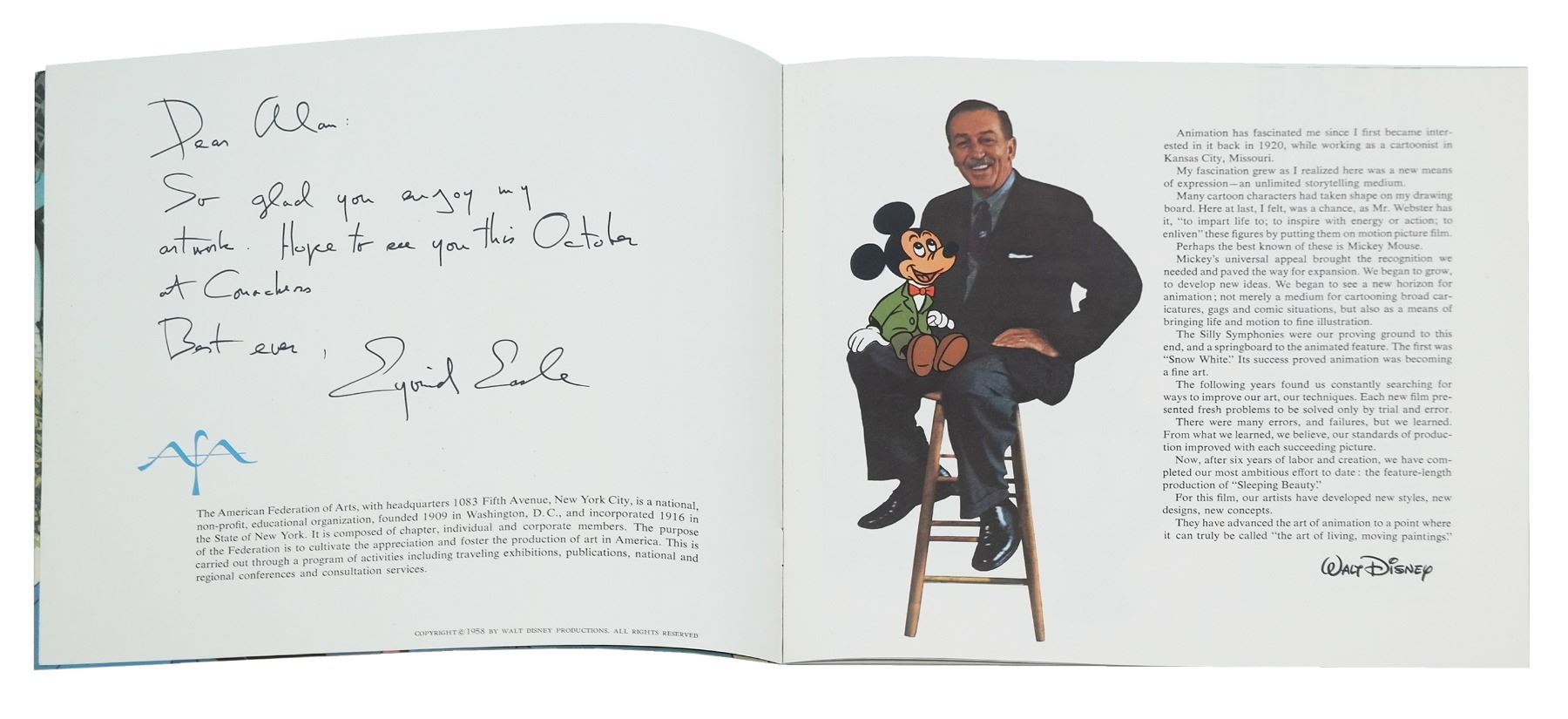 (Disneyland, c.1958) A souvenir guidebook from Disneyland's "The Art of Animation" exhibit in Tomorrowland. "The Art of Animation" was originally created as a traveling exhibit which showcased the processes by which Disney created their animated films and cartoons. The exhibit was used to help promote Disney's latest film, Sleeping Beauty. The international exhibit later found a permanent home in Tomorrowland next to the Art Corner. This book is signed inside by Eyvind Earle, whose iconic background designs were used for Sleeping Beauty, and is personalized with a message to Alan Hylton. The 8"x9" guidebook is in good condition with some cover-wear from use.