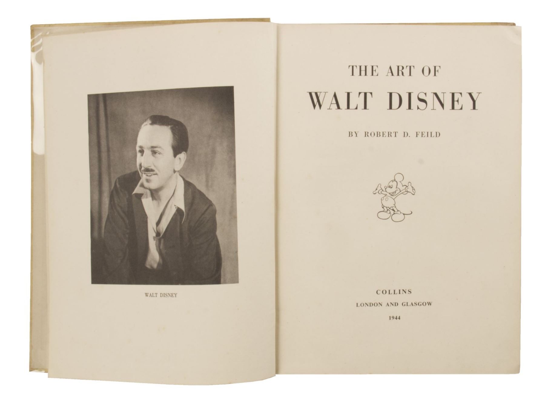 (Collins, 1944) A vintage hardcover copy of The Art of Walt Disney by Robert D. Feild. This book was originally created in 1942 in an effort to record the artwork, history, and current challenges of the Walt Disney Studios. Contained within are 290 pages of history, recorded discussions between Walt Disney and his animators, images of production artwork and final animation cels, and much more. This impressive archive of Walt Disney Studios history measures 11"x8.5" and 1.25" thick. The condition is fair to good with some creasing and wear from use, and some writing on the first page by the original owner.