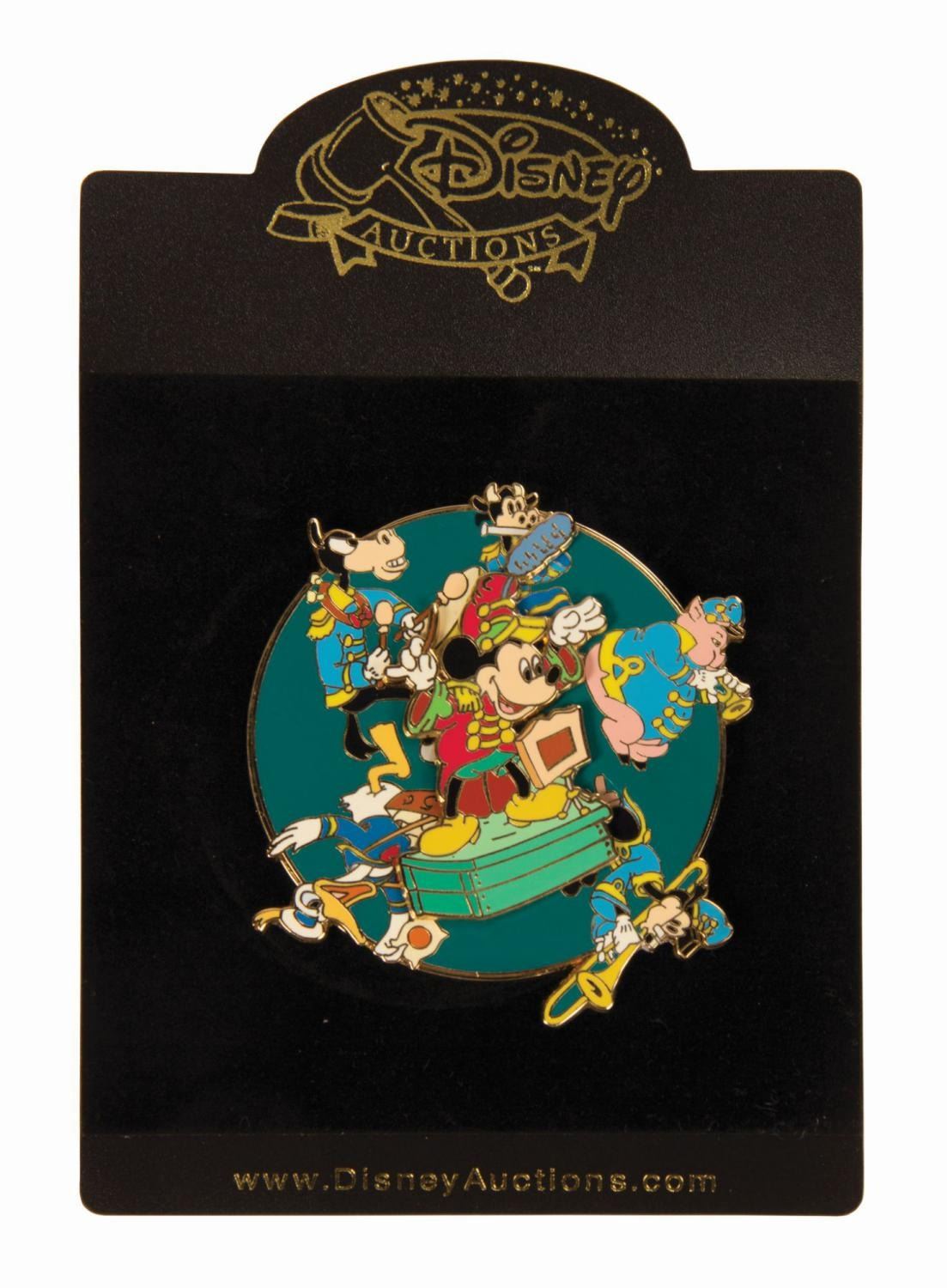 (Disney, 2004) A limited edition jumbo spinner pin featuring Band Leader Mickey Mouse as seen in the 1935 animated short, The Band Concert. This short was the first Mickey cartoon to be produced in color, and the themed pin features Mickey conducting Donald, Goofy, Horace Horsecollar, Clarabelle Cow, and Peter Pig on the rotating dial. Limited to only 500 pieces and offered exclusively through Disney Auctions, the pin measures 3" in diameter and comes on its original backing card. The condition is very good with minor surface wear and some tarnishing to the reverse.
