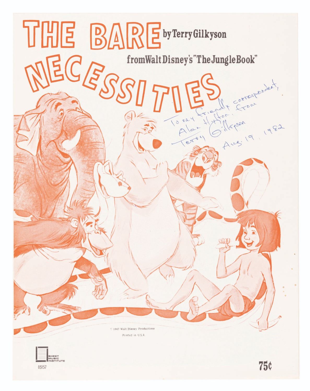 (Disney, 1967/1982) Signed sheet music for “The Bare Necessities” from Disney’s “The Jungle Book.” The sheet music was signed in 1982 by the songwriter Terry Gilkyson, in blue ink with a dedication to super collector Alan Hylton. Measuring 8.5” x 11”, the sheet music is in good condition with creases and light discoloration from age.