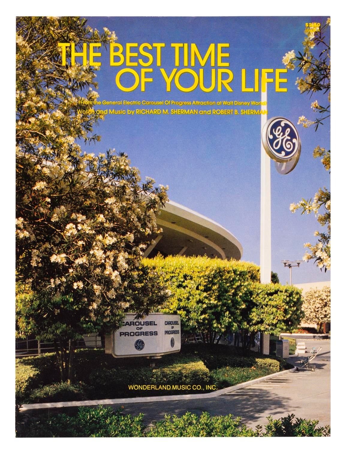 (Wonderland Music, 1979) Sheet music for "The Best Time of Your Life," written by the Sherman Brothers for the Carousel of Progress at Walt Disney World. Measuring 9" x 12", the sheet music is in very good condition with typical light handling wear.