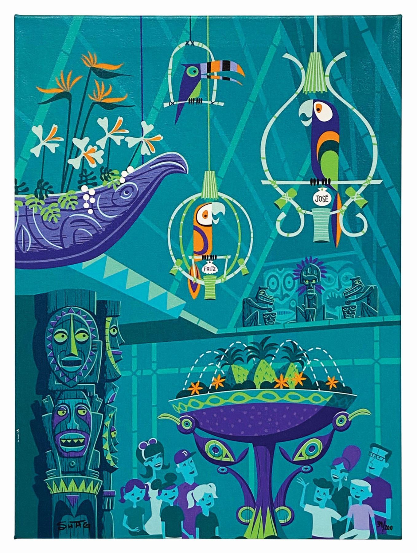 (Disneyland, 2013) A limited edition giclee print on canvas titled “The Birds Sing” by Shag. Created in a limited edition of 200 for the 50th anniversary of the Enchanted Tiki Room, the print is signed by the artist at lower left, and hand numbered 39/200 at lower right. The artwork depicts a group of park goers visiting the iconic attraction in Shag's inimitable retro style. It is accompanied by a Disney COA. Measuring 22.5"x16.5", the piece is in very good condition with a small unobtrusive scratch at lower left edge.