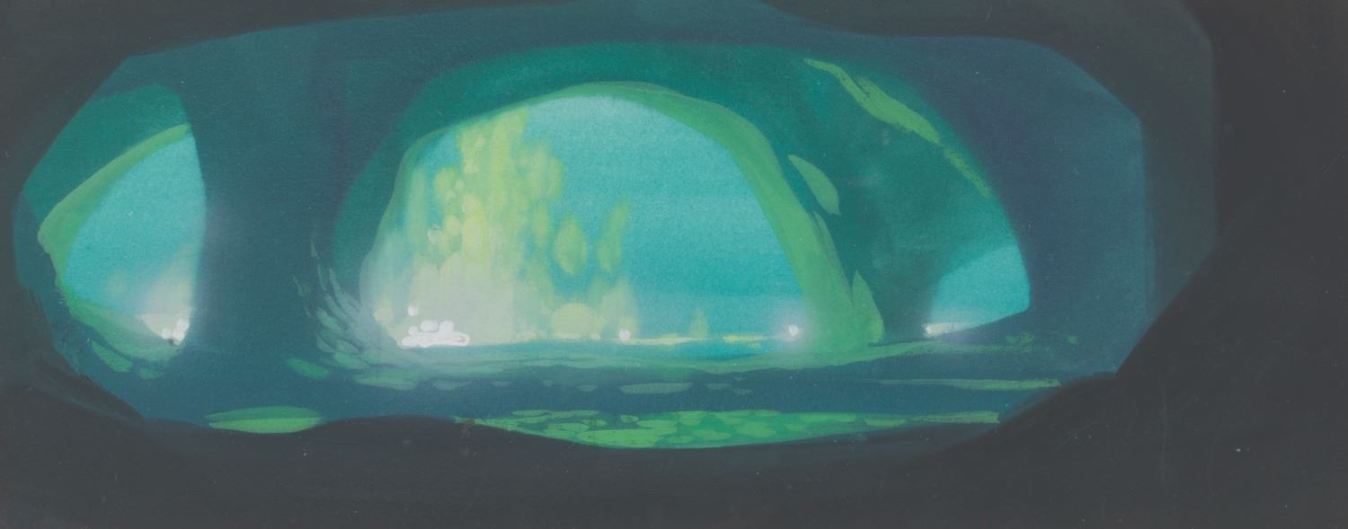 (Disney, 1985) An original concept painting for “The Black Cauldron” by James Coleman, the film’s color stylist. The gouache painting has a visible image size of 4.25” x 10.25” on artist’s board. The entire framed and matted piece measures 10” x 16”. The art is in very good condition with light stains, scratches, and wear from production use, while the frame exhibits scratches and light wear.