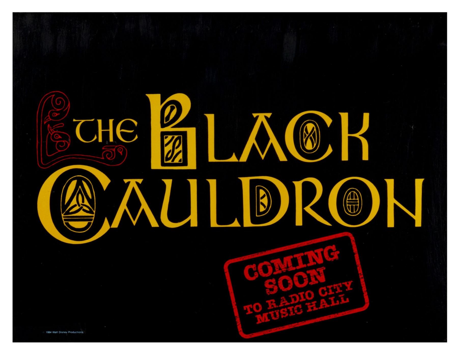 (Walt Disney Studios, 1984) A very rare pre-release poster for the premiere of The Black Cauldron at the Radio City Music Hall. This early poster promotes the upcoming film with beautifully stylized font for the film's title, as well as the message "Coming soon to Radio City Music Hall" below. Measuring 14"x18", the poster is in very good condition with minor edge-wear.