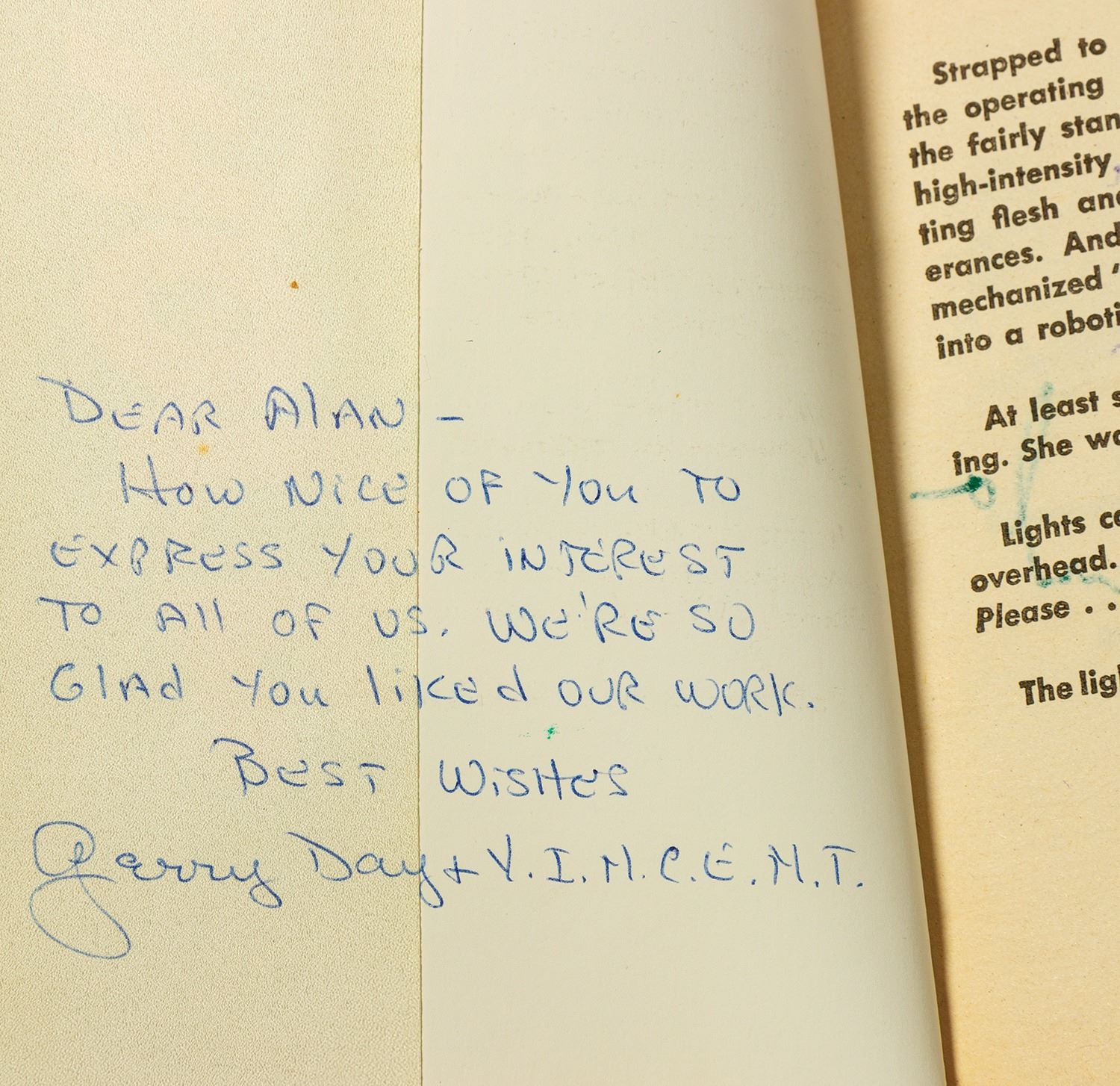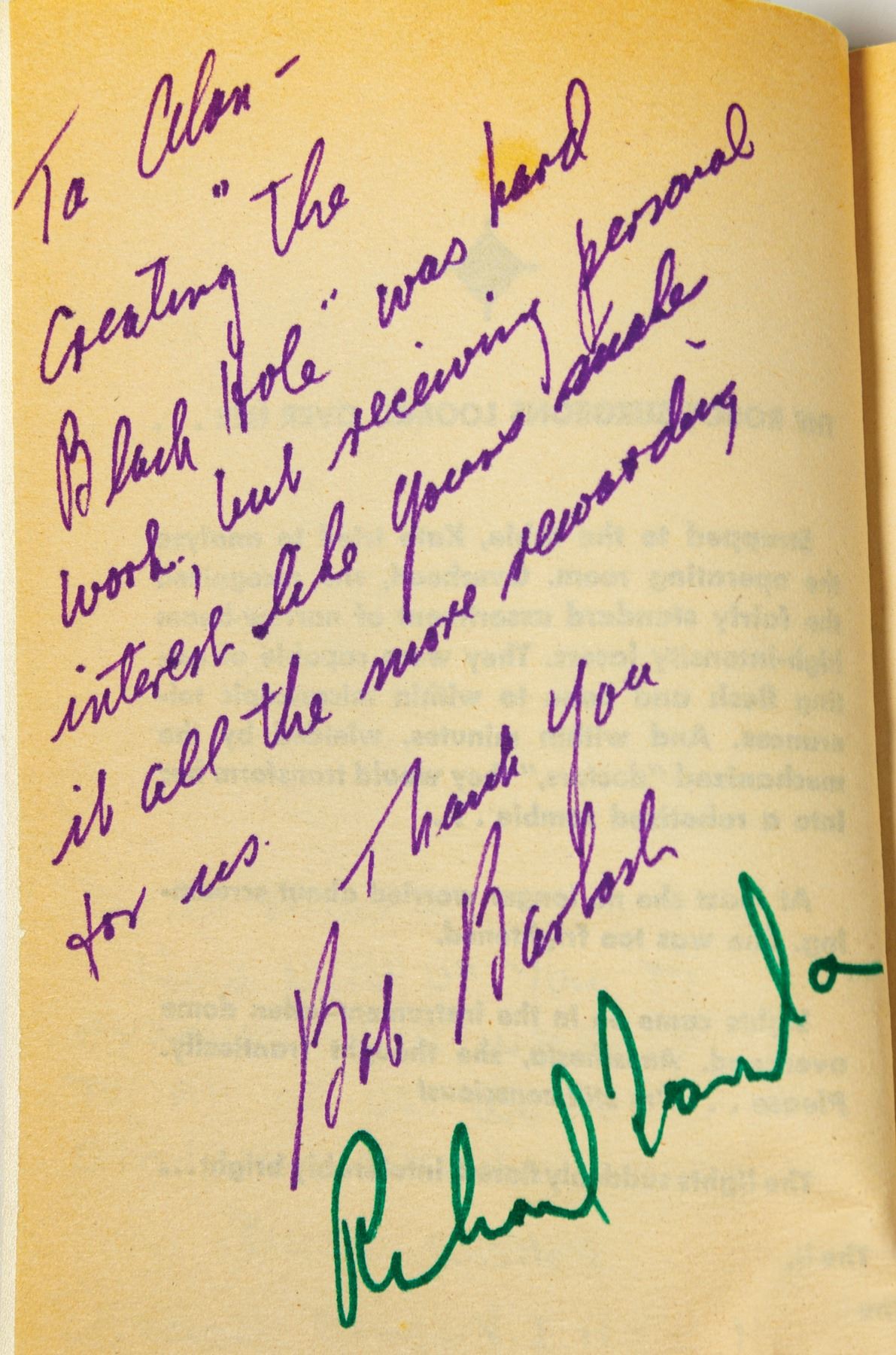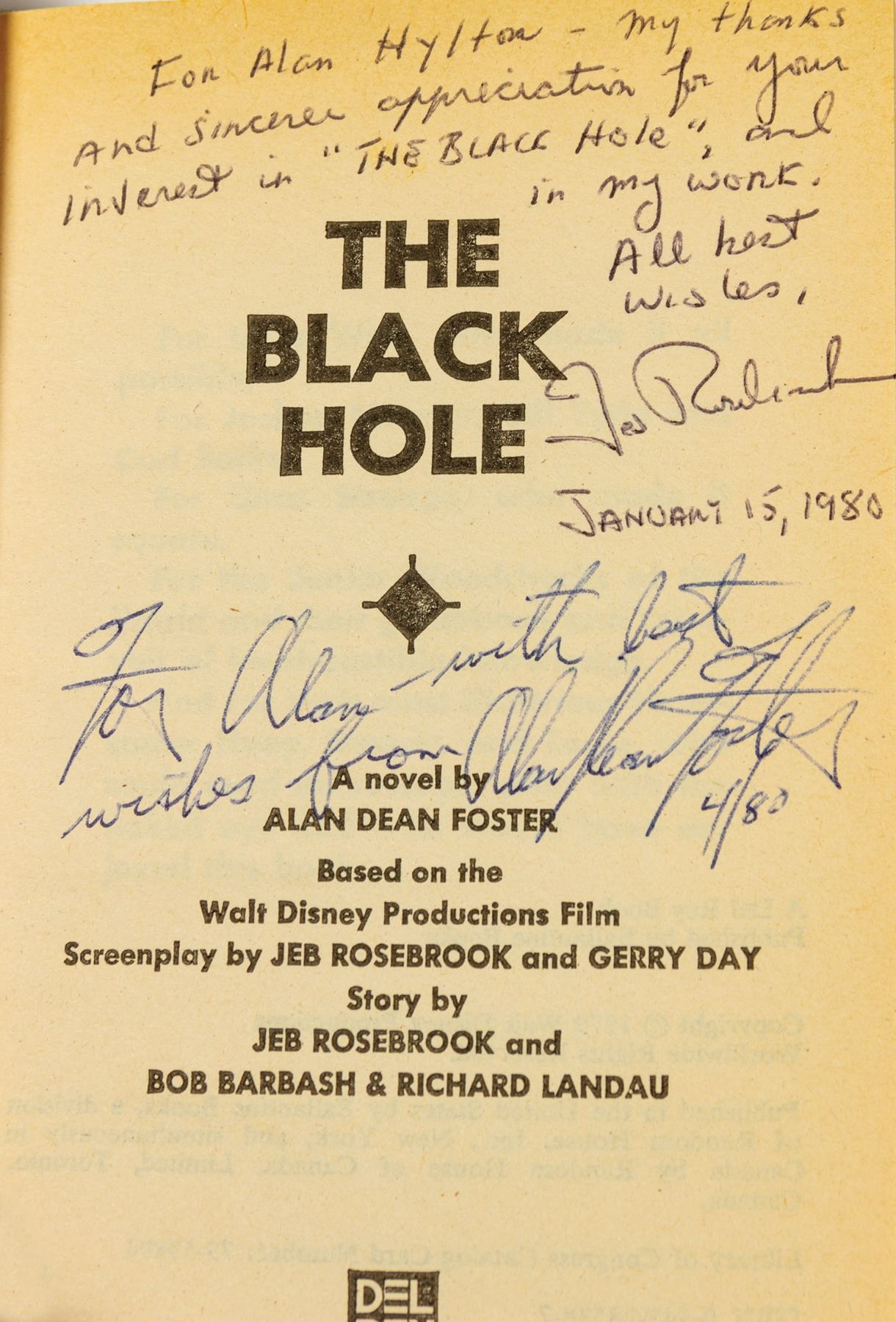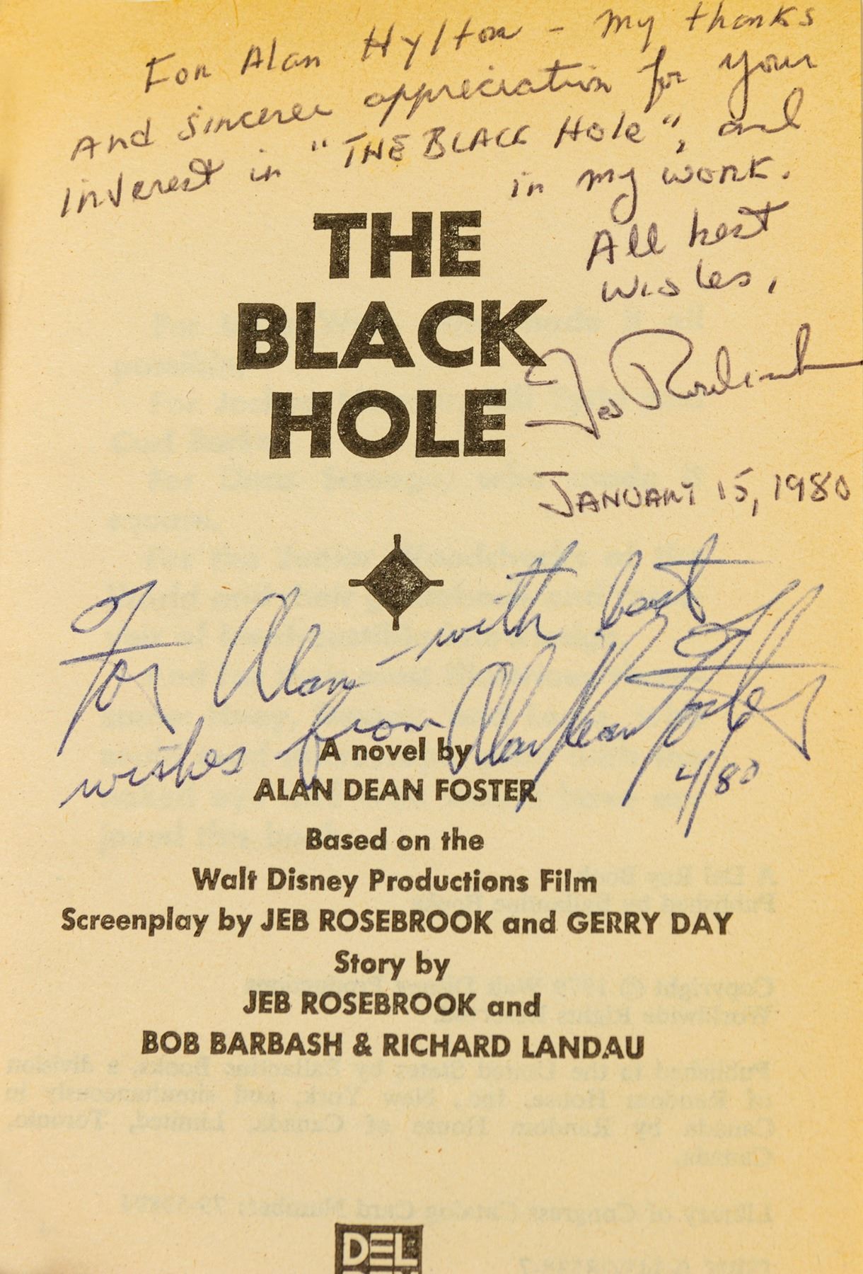 (Ballantine, 1980) A rare novelization of "The Black Hole" by Alan Dean Foster. This book has been signed by Foster, as well as by screenplay writers Gerry Day and Jeb Rosebrook, and story writers Bob Barbash and Richard Landau. The 214-page book measures 7"x4.25" and is in good condition with some discoloration on a few pages and minor wear from use. The book has some cover wear from long-term storage in a protective plastic dustjacket.