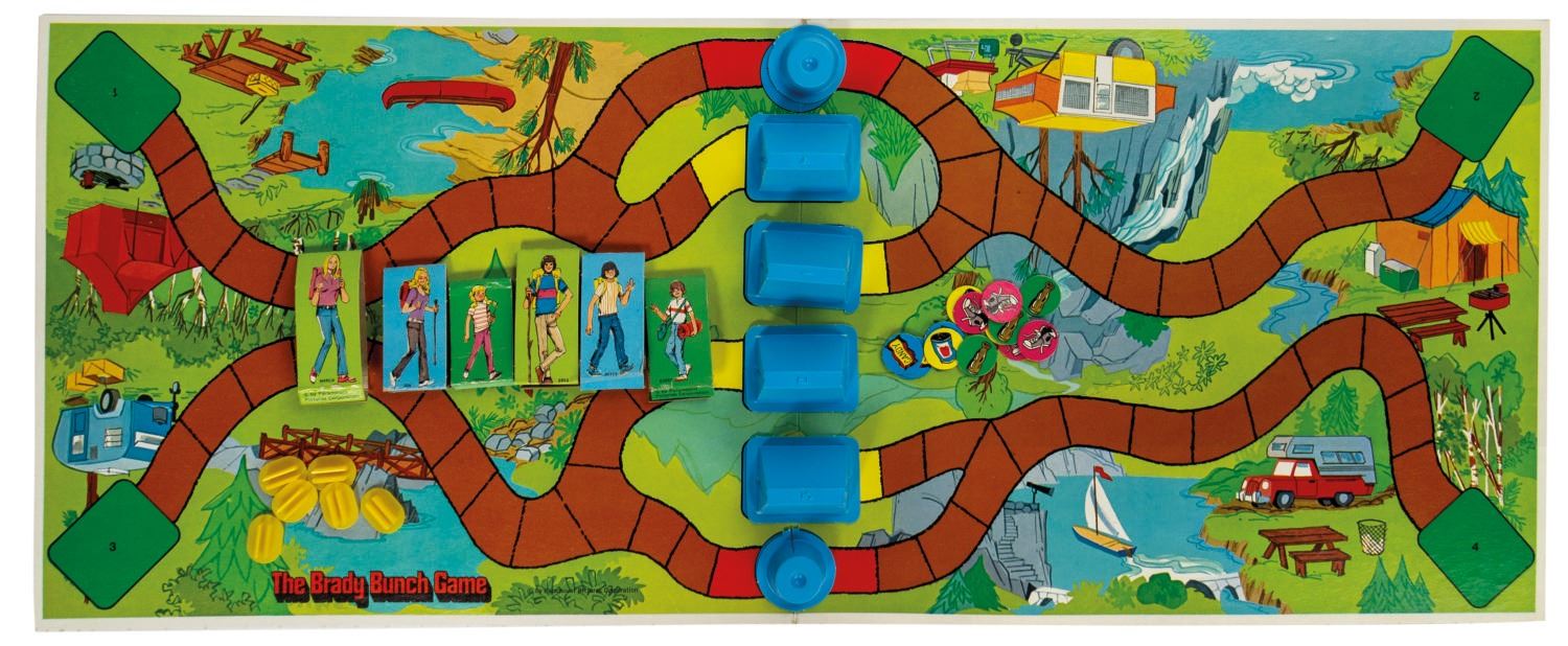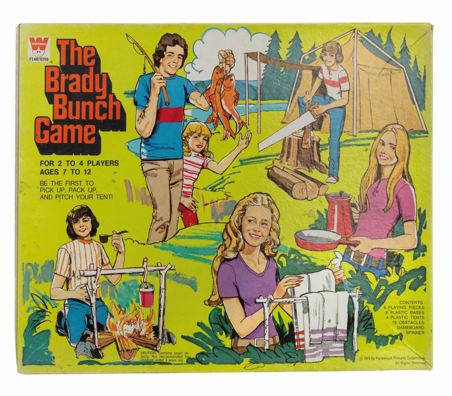 (Whitman, 1973) An illustrated board game based on the ABC sitcom, The Brady Bunch. Loosely inspired by the first season episode "A-Camping We Will Go," players compete as one of the six Brady children, and try to be the first to set up their tent. The game includes the instructional card, game board, (6) player pieces and bases, (4) plastic tents, and (15) obstacle pieces. One obstacle and the spinner are missing. The box measures approximately 11.5"x14.25" and 1.75" deep. The condition is good with some wear and creasing to the pieces and box lid from use.