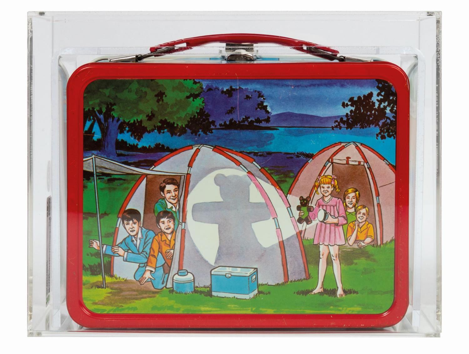 (King-Seeely, 1970) A vintage The Brady Bunch tin lithographic lunch box manufactured by King-Seeley. It has been encapsulated in a protective acrylic display case by Collector Archive Services, which measures 8.25"x10.5" and 4.5" deep. The case retains a CAS grade label, rating the lunch box an 85+ with a "real grade" of 88.8. The display itself is unmarred and is accompanied by a CAS Statement of Archival.