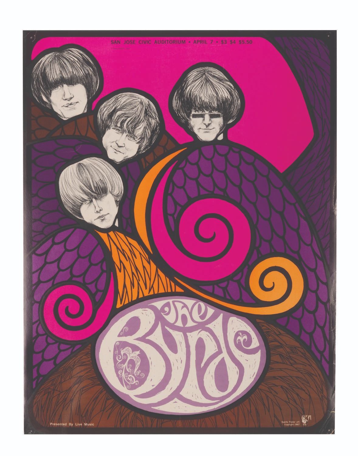 (Schiller, 1967) A rare concert poster by Dave Schiller for The Byrds' performance at the San Jose Civic Auditorium on April 7, 1967. This artwork was also featured on the cover of LIFE magazine on September 1, 1967. Schiller designed psychedelic art for some of the most influential names in music, including Jefferson Airplane, Alice Cooper, and the Bee Gees. Measuring 17" x 22", the poster is in good condition with creases, edge wear, spots of discoloration, and pinholes at the corners.