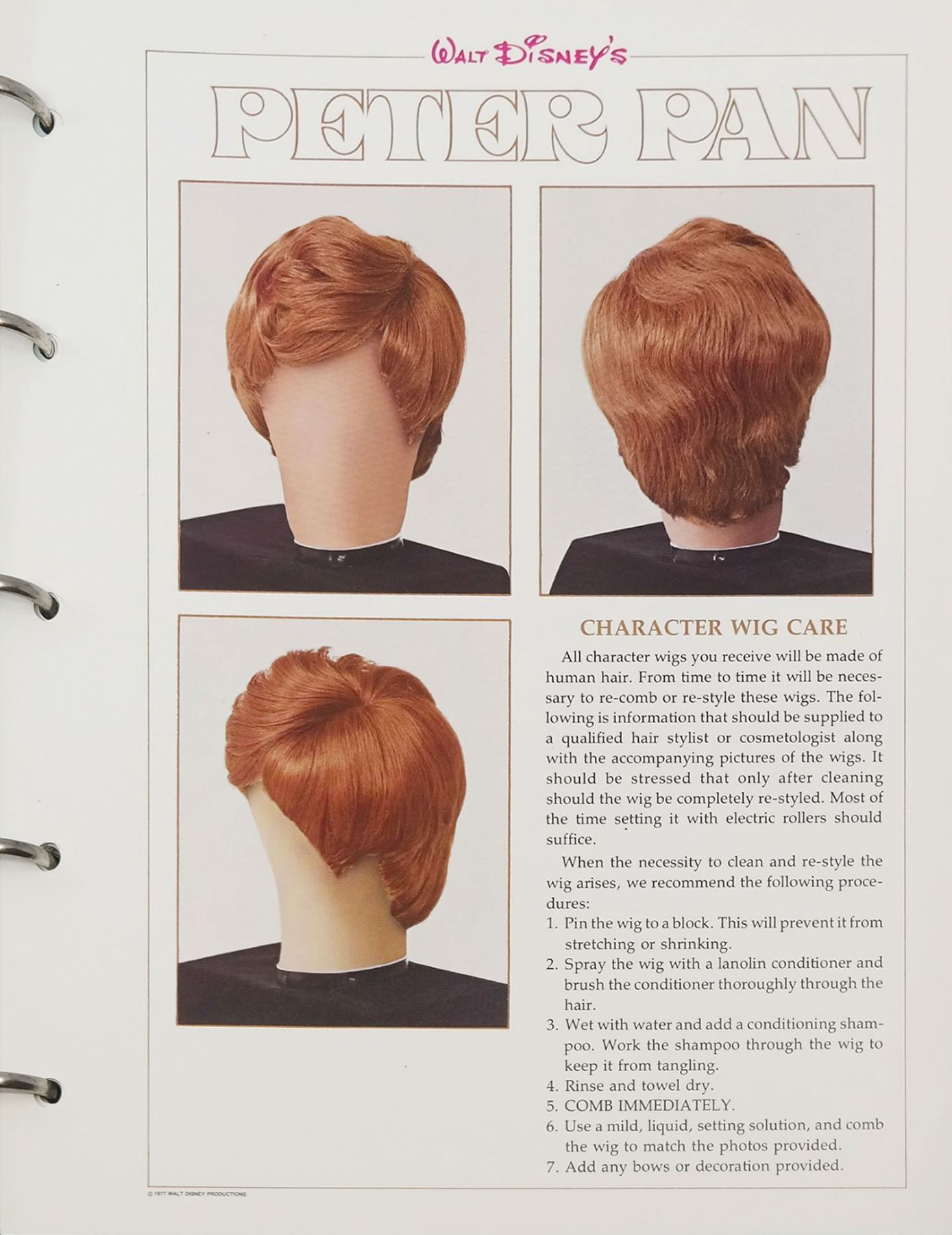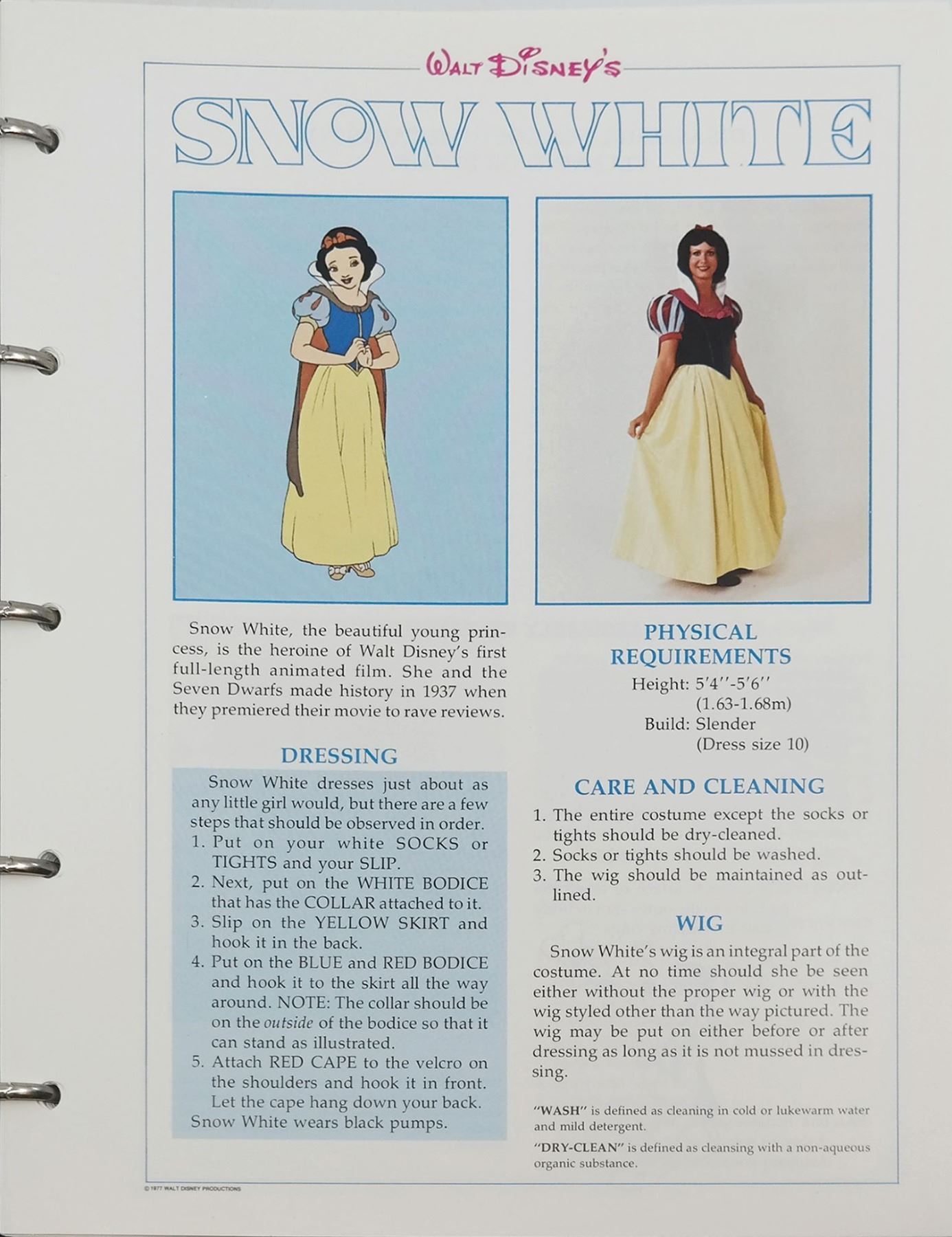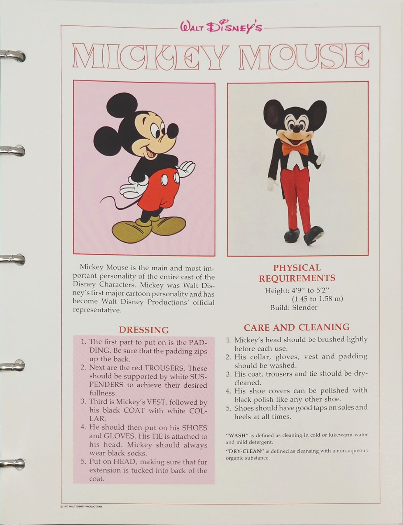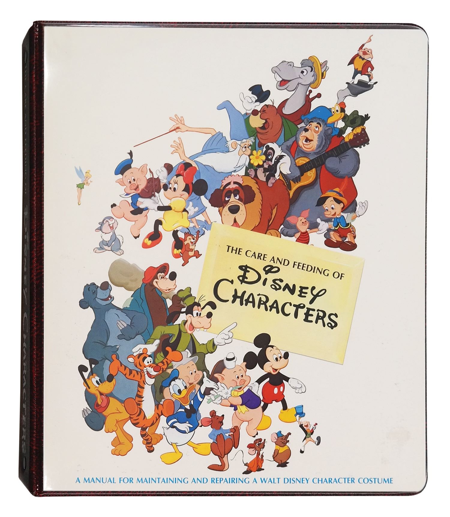 (Walt Disney World, 1977) A manual used by the costume department at both Disneyland and Walt Disney World. Titled, "The Care and Feeding of Disney Characters," the manual was used internally within the parks to maintain and repair the walk-around character costumes. The binder describes the cleaning and repair processes for each costume with photos of the costumes alongside the original animated characters. As this is an early edition of the guide, there are several tabs at the back which were created for future costume profiles which had not yet been written. Measuring 11.5"x10", the 119-page binder is in very good condition with minimal wear, including spots of residue on the cover.