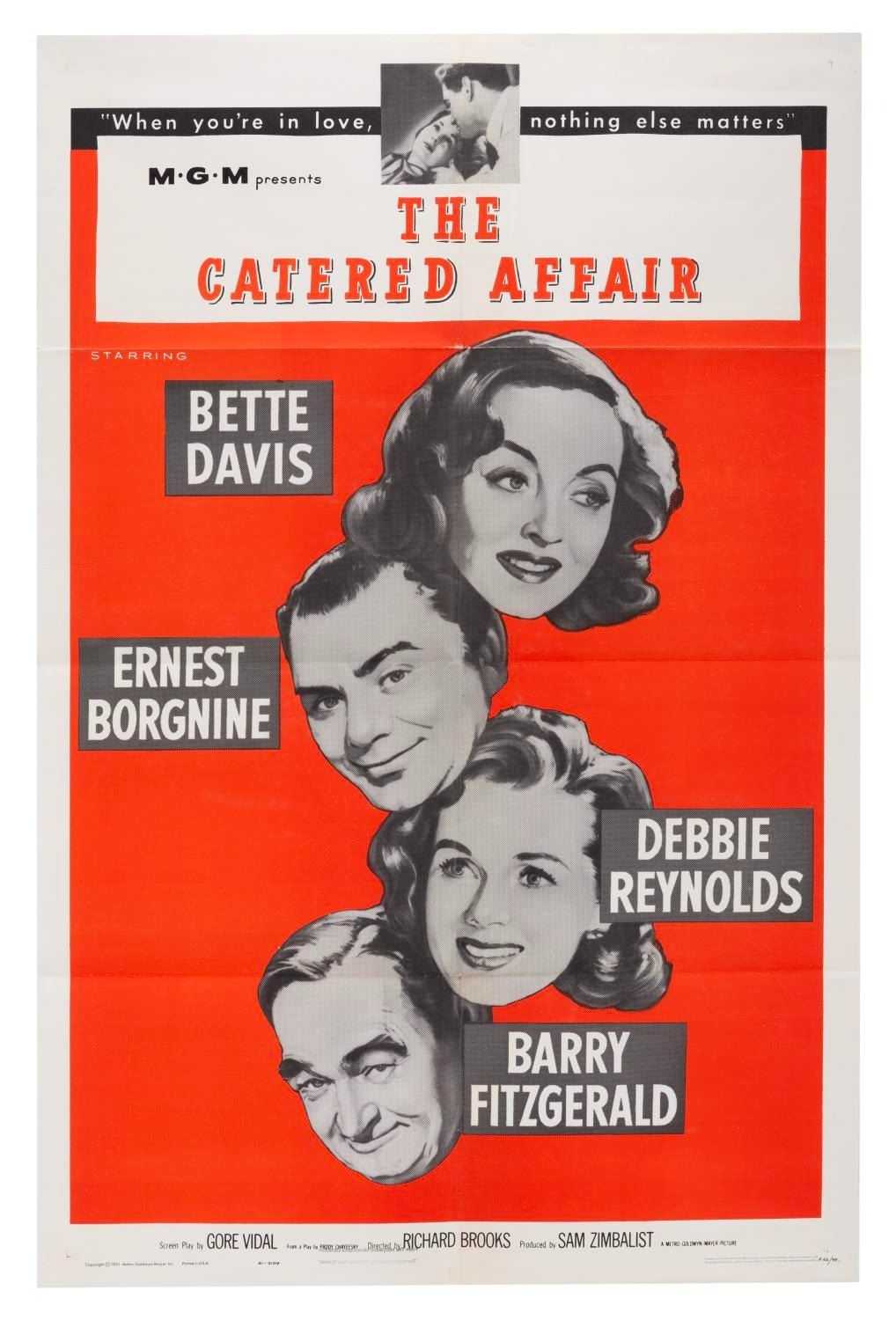 (MGM, 1956) A one-sheet for "The Catered Affair," starring Bette Davis, Ernest Borgnine, Debbie Reynolds, and Barry Fitzgerald. Measuring 27" x 41", the poster displays in very good condition with wear along edges and original folds, including slight separation at the top and center points.